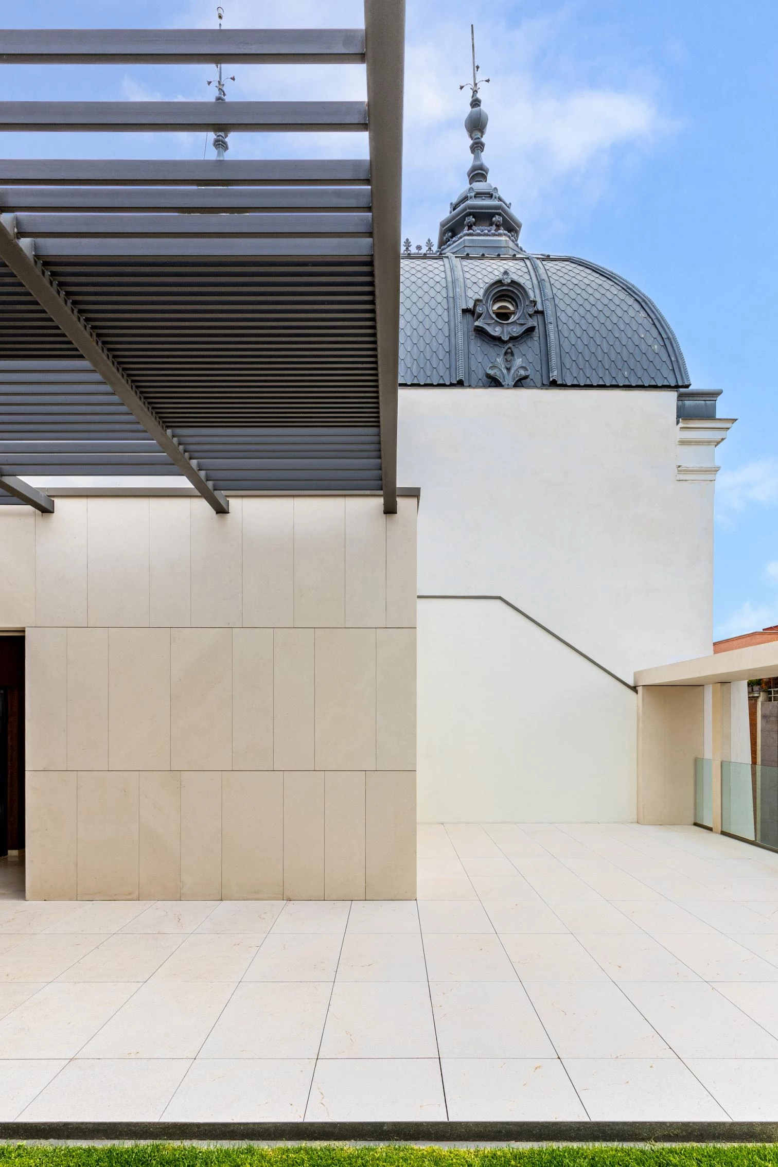 Las intervenciones están destinadas a la actualización de las instalaciones, la mejora energética, el refuerzo estructural y el cumplimiento de la normativa de accesibilidad universal, optimizando la funcionalidad. Estas actuaciones se han realizado partiendo de un estudio exhaustivo del edificio original. La composición de la nueva fachada exterior es respetuosa con las construcciones del entorno, adaptándose a su ritmo, cadencia y tipología en general. En ella se introducen soluciones tradicionales como doble fachada, pérgola y columnata. Se apostó por una fachada donde únicamente se aprecian dos materiales: vidrio y piedra, quedando la carpintería oculta. Las lamas pétreas torsionadas aportan un aspecto cambiante a la fachada según la hora del día. El frente a la calle Amador de los Ríos mide 11 metros, una crujía bastante estrecha que supuso un reto en el proyecto: intentar, a través del diseño de la fachada, conseguir una sensación de amplitud y mayores dimensiones. En la cubierta se plantea una zona de recreo, incluyendo vegetación y un graderío para eventos.