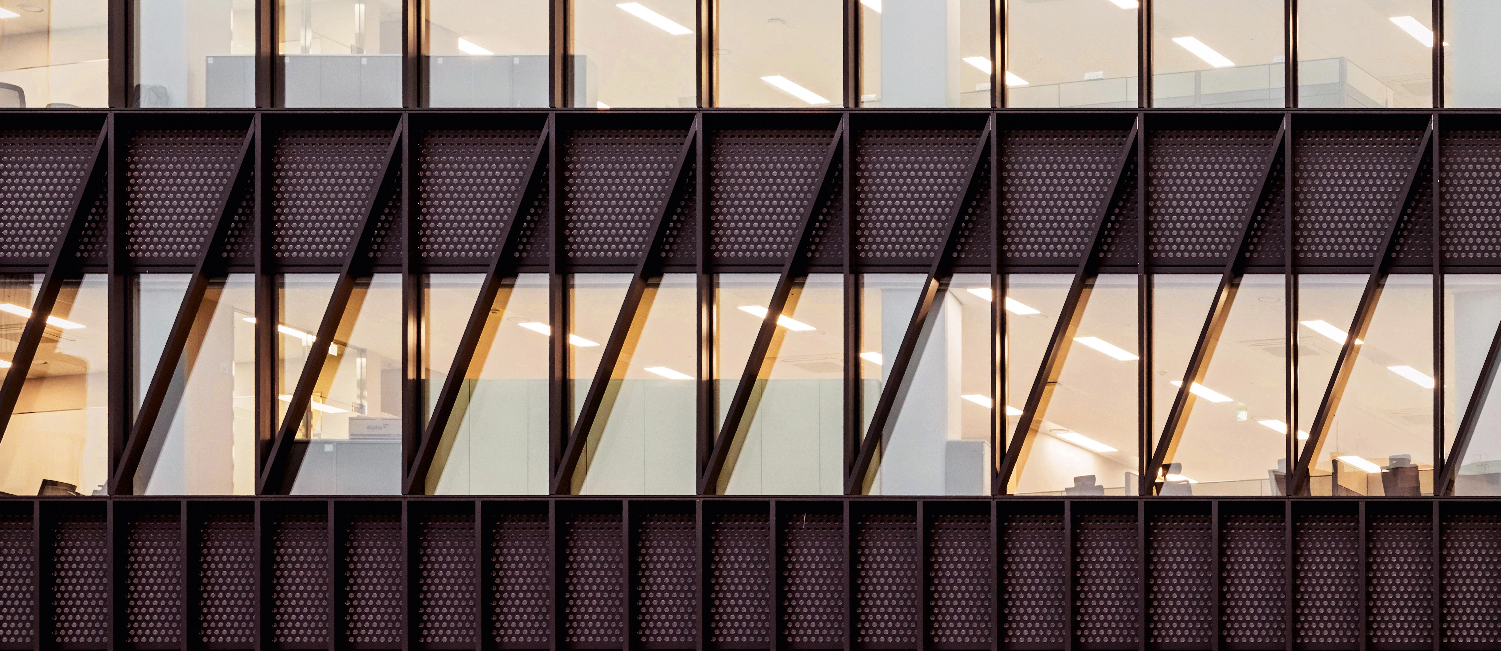 Los marcos de las fachadas, también metálicos, contribuyen a generar atmósferas diferentes, ya que filtran la luz entrante y arrojan sombra en los espacios interiores. Así, según el momento, el aspecto del edificio cambia: durante el día, el material de la envolvente refleja la luz del sol; mientras que por la noche la torre brilla desde dentro y revela, así, el característico patrón compositivo de su fachada.