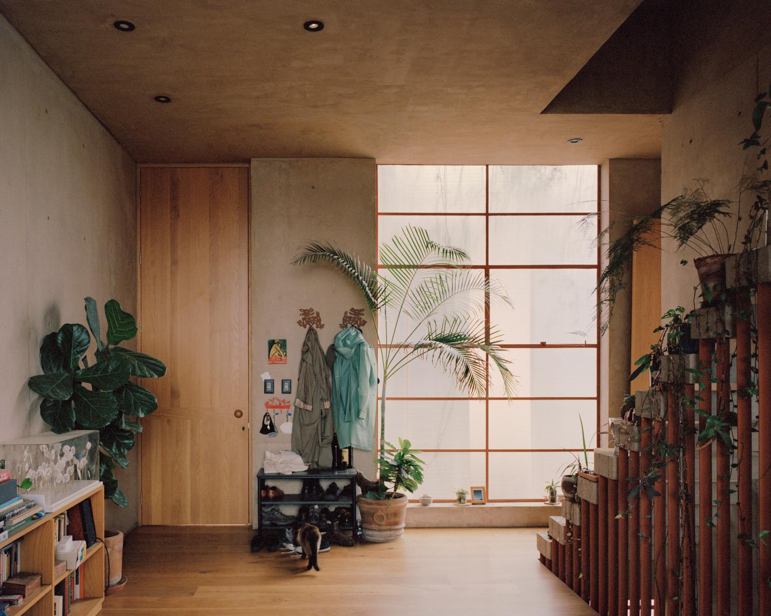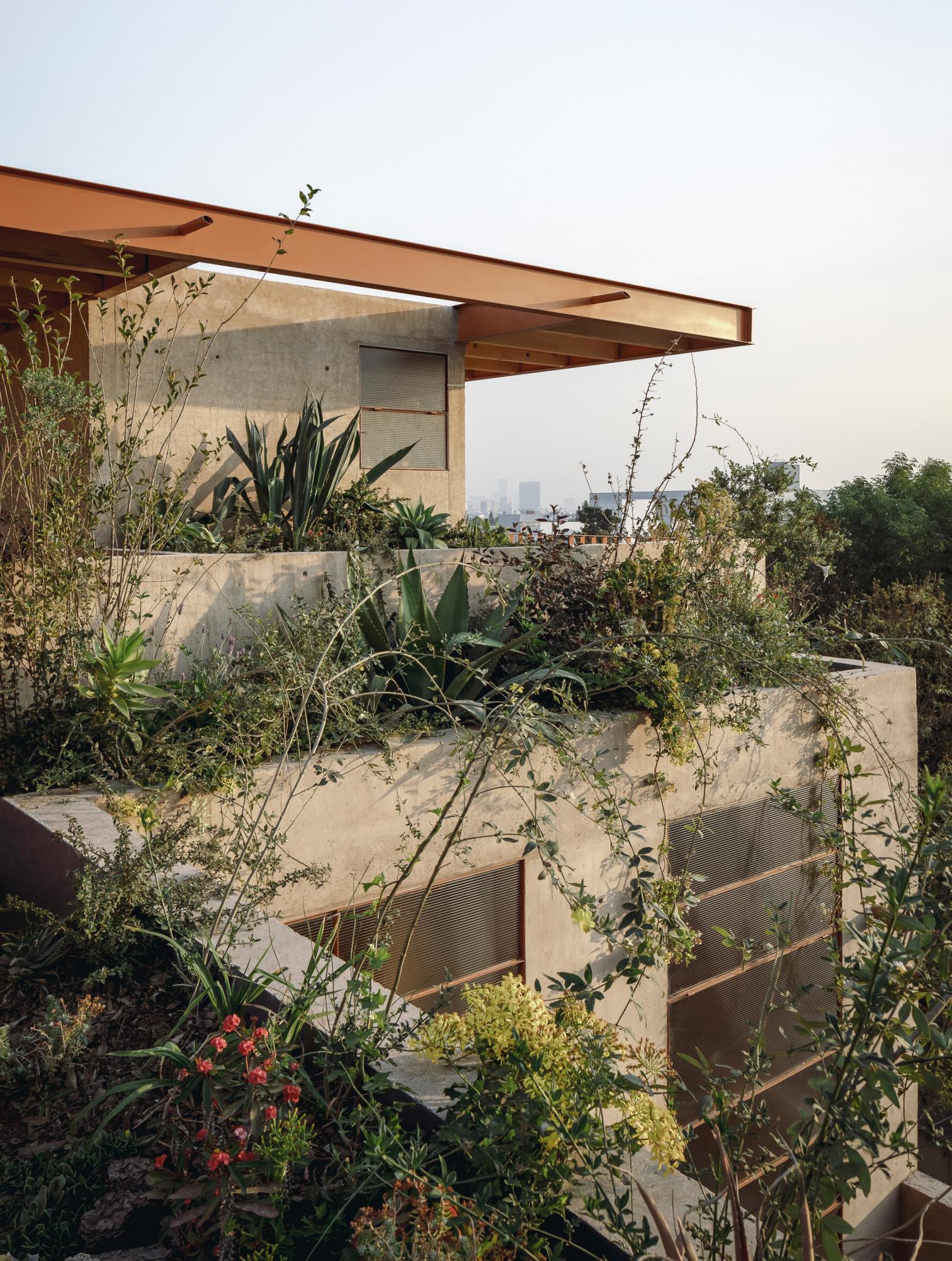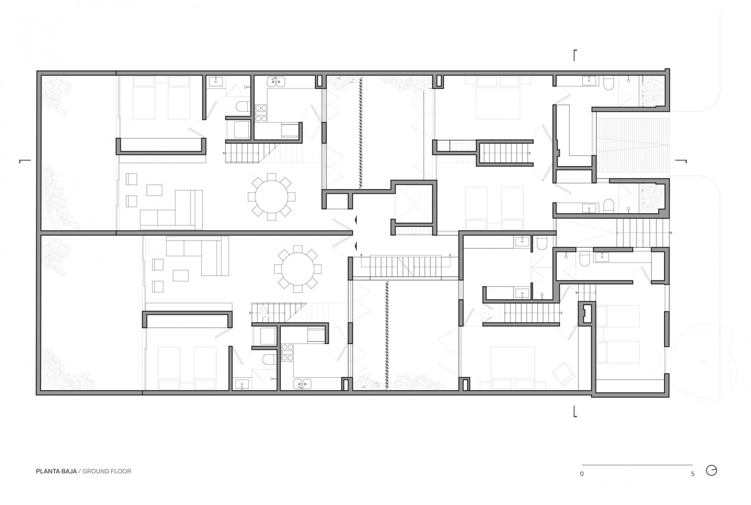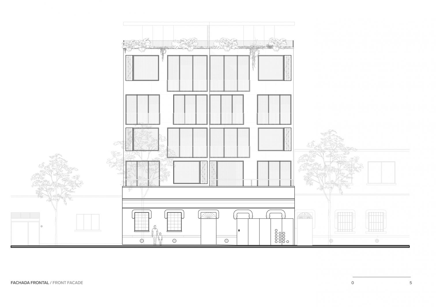 Detrás de una fachada catalogada, se alzan cuatro volúmenes de hormigón que albergan trece viviendas distribuidas en cinco niveles, que aprovechan al máximo las condiciones del lugar. El diseño compositivo centraliza los servicios, lo que permite una planta libre y flexible, adaptable a las necesidades de los residentes. Los espacios están orientados de manera estratégica para maximizar la entrada de luz natural y la ventilación cruzada, utilizando balcones y medios niveles, que amplían los límites interiores.
