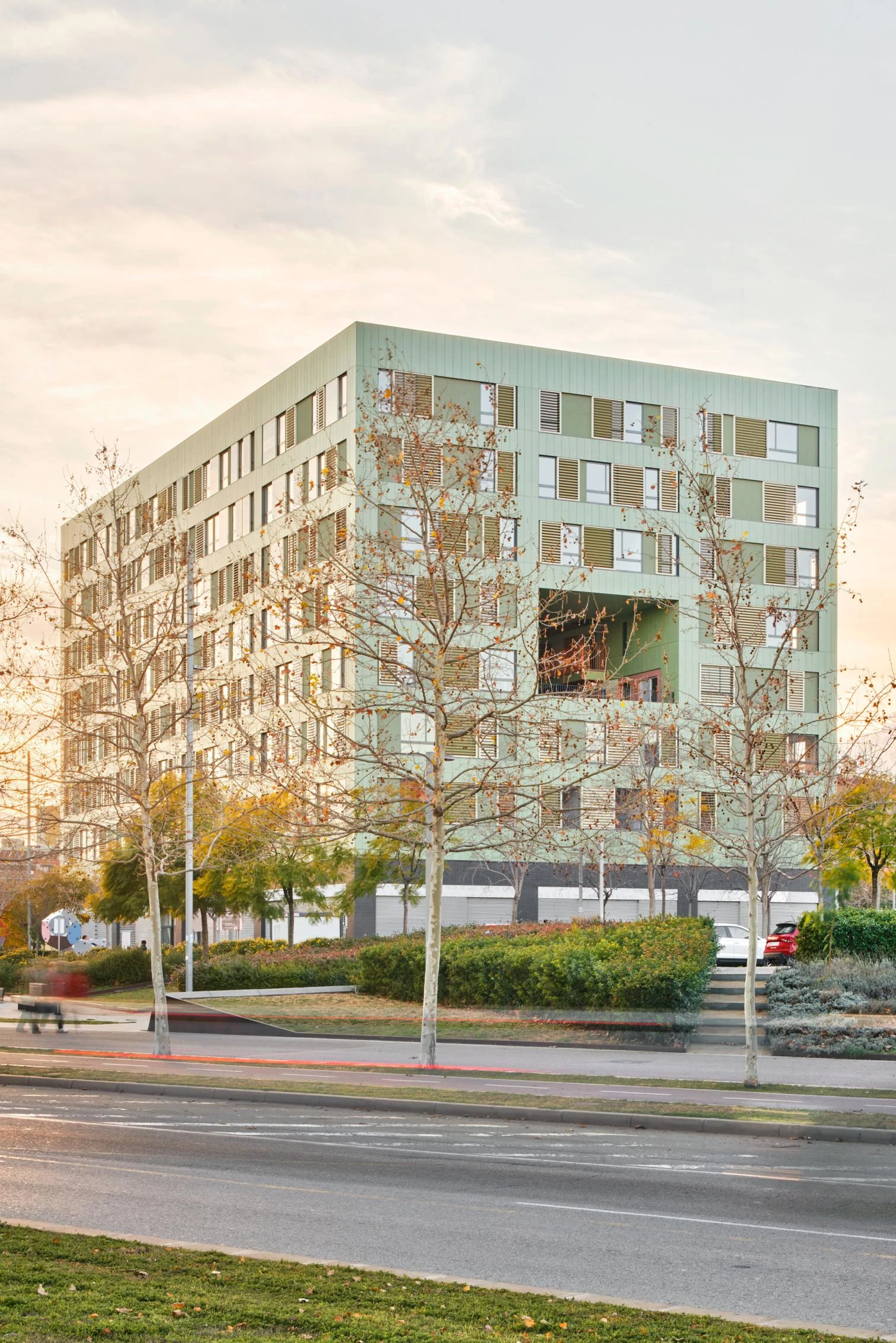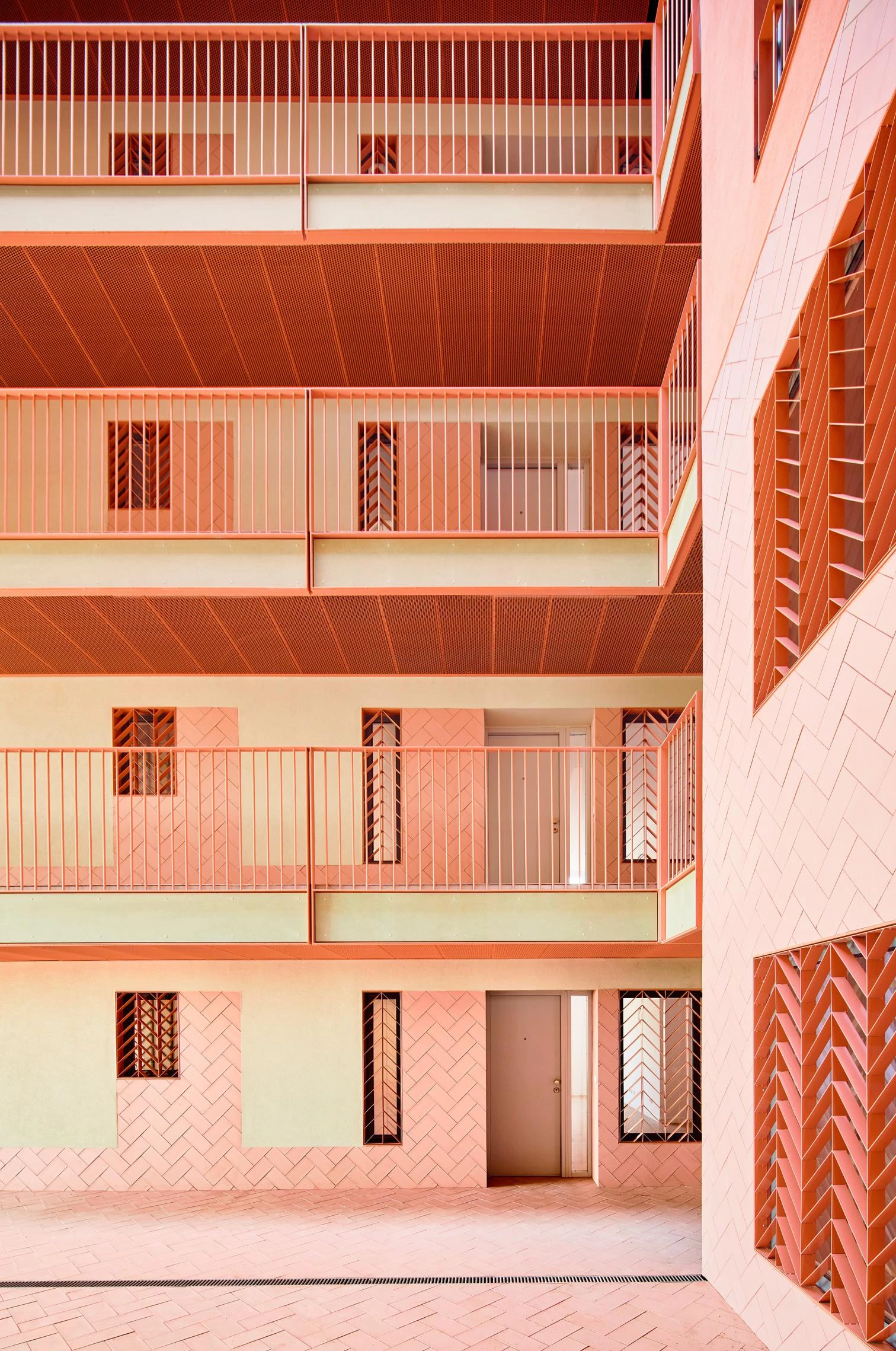 Respecto de las viviendas, todos los estares y dormitorios son exteriores, mientras que accesos, cocinas y baños dan a los corredores que comparten cada tres viviendas. Todas las unidades están diseñadas como practicables, y el 3% de ellas son completamente adaptadas. Desde este esquema, que solidifica el volumen disponible, se realizan operaciones de sustracción que permiten entallar una nueva morfología, generando amplias terrazas colectivas e individuales y facilitando ventilaciones cruzadas y vistas diagonales.