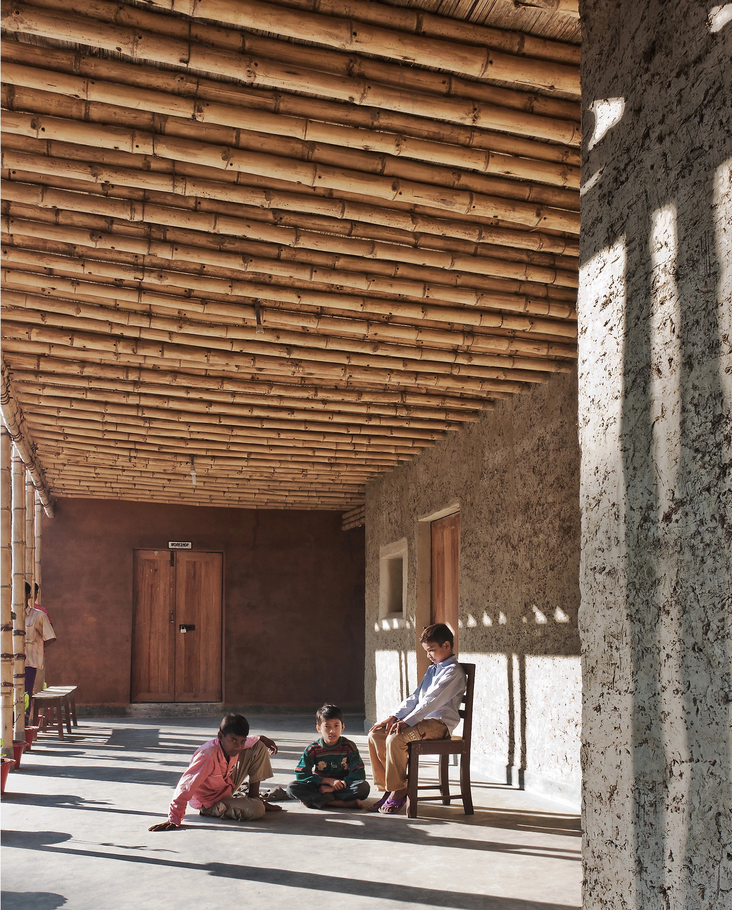 La Escuela DESI es una innovadora interpretación de la casa tradicional bangladesí. Lo habitual en el entorno rural es que todas las funciones domésticas —cocinar, dormir, asearse— se localicen en construcciones separadas entre sí y dispuestas alrededor de un patio central. En este edificio, por el contrario, todas las funciones de su programa docente y laboral se integran en un volumen. El proyecto alberga, así, un uso que ya no está relacionado con la agricultura, pero que aún mantiene una fuerte conexión con el contexto.