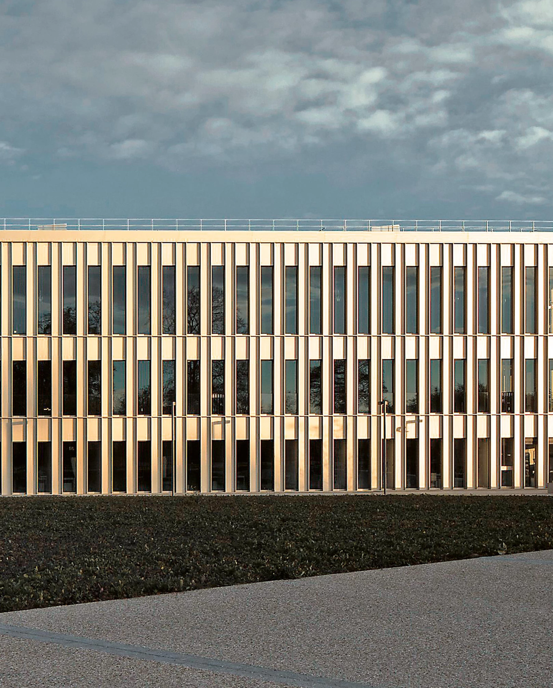 Exteriormente el edificio se cubre con una envolvente continua, que viste un interior heterogéneo con una piel rítmica y unitaria. La paleta de materiales —aluminio para el muro cortina y hormigón visto en el interior— hace referencia a los edificios históricos del campus. La fachada, articulada mediante franjas verticales, está compuesta por módulos sucesivos de 800 y 500 mm, separados por estrechos salientes que aportan profundidad y fuerza plástica a la visión frontal. Las bandas horizontales de aluminio ponen de manifiesto el incremento de la altura libre entre forjados desde la primera hasta la última planta, además de unificar compositivamente el conjunto. La estructura y el cerramiento desempeñan asimismo un papel importante en la eficiencia energética de la construcción: el hormigón expuesto en el interior contribuye a acumular el calor debido a su inercia térmica; mientras que el revestimiento metálico actúa como barrera hacia el exterior.