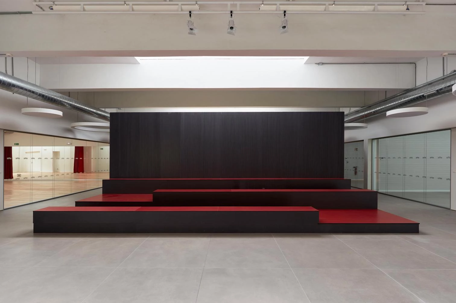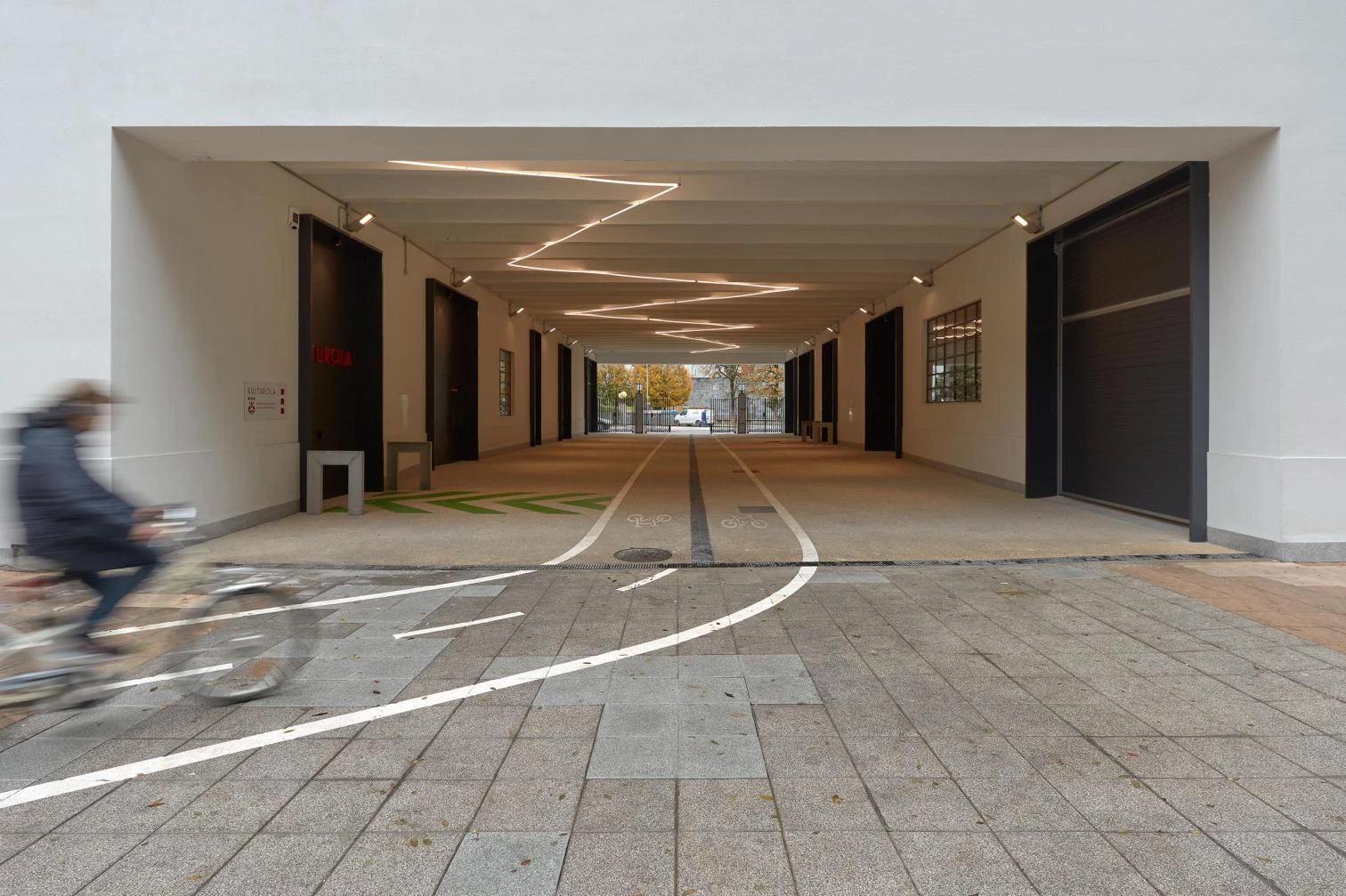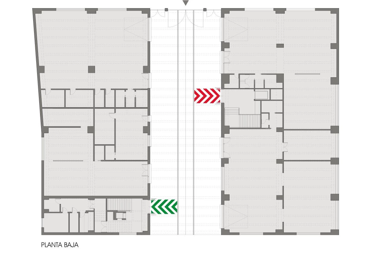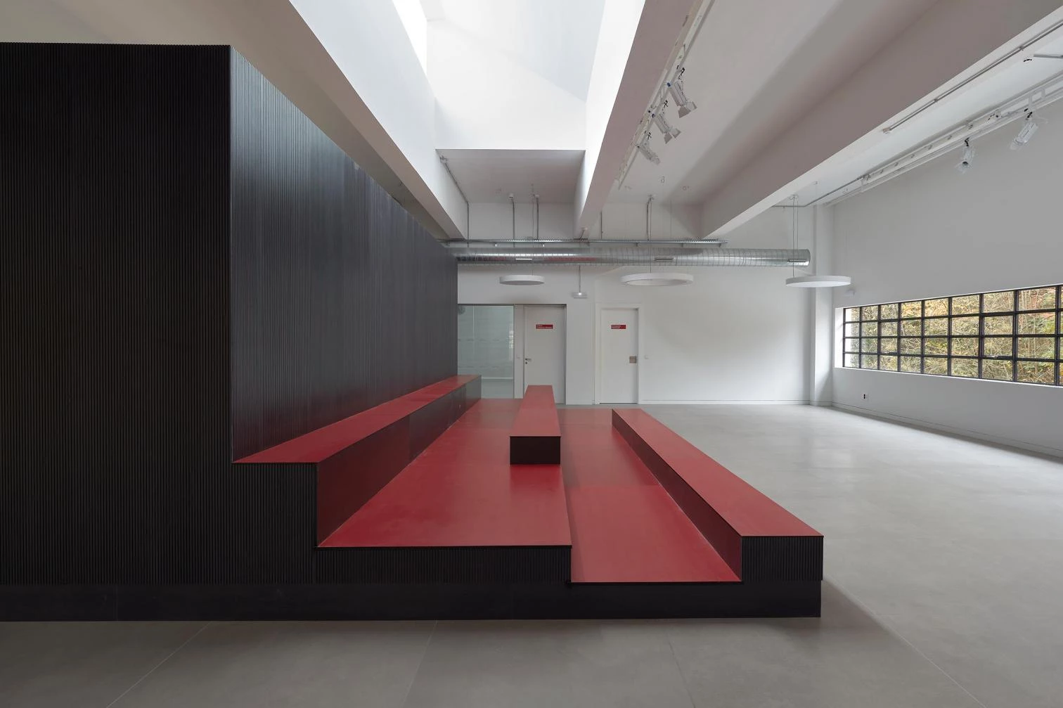 El pasadizo que atraviesa el edificio en planta baja —antiguo acceso al conjunto— se incorpora al espacio urbano y a la vez configura un gran umbral de entrada, convirtiéndose en un lugar de actividades a cubierto. El proyecto devuelve a las fachadas la composición original de los huecos, utilizando unas carpinterías de acero de mínima sección con los antiguos despieces. En la cubierta se restituyen los lucernarios originales, recuperando la espacialidad y la iluminación cenital de las plantas superiores. Se conserva asimismo la antigua escalera histórica y se proyecta un nuevo núcleo vertical teñido de rojo —el color corporativo de la compañía—, evocando el hierro fundido de la actividad original del edificio. Se pone en valor la estructura de hormigón con vigas de gran canto en los techos, dejando las instalaciones vistas a fin de mantener la atmósfera industrial del edificio y cuidando la compartimentación interior para conseguir la neutralidad espacial de la construcción original.