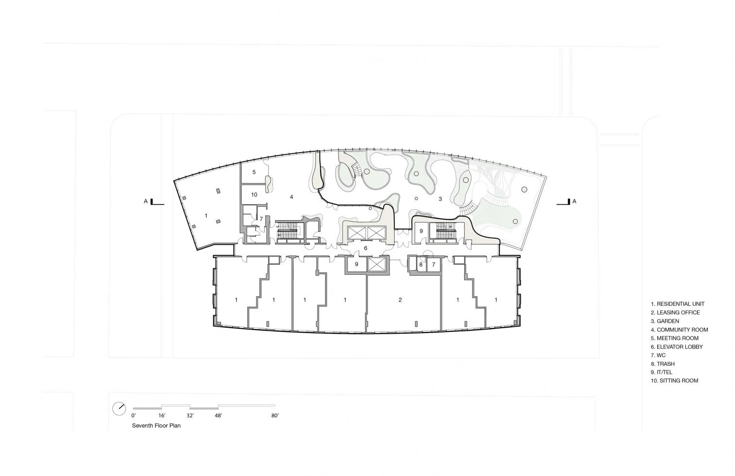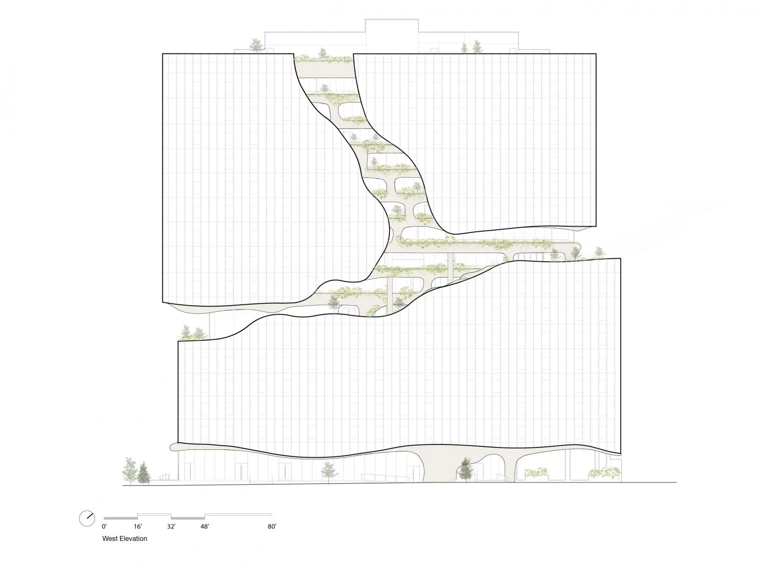 Desde la sexta a la novena planta, una zona de ocio y descanso, con instalaciones deportivas, evoca un paisaje erosionado, que contrasta con el resto de las líneas geométricas del edificio. Fusionando los límites entre interiores y exteriores, las terrazas ajardinadas ascienden hasta la azotea, con vegetación que cambia de color con las cuatro estaciones. El conjunto está coronado por una piscina y un spa, ofreciendo vistas de las montañas Rocosas y la ciudad de Denver.
