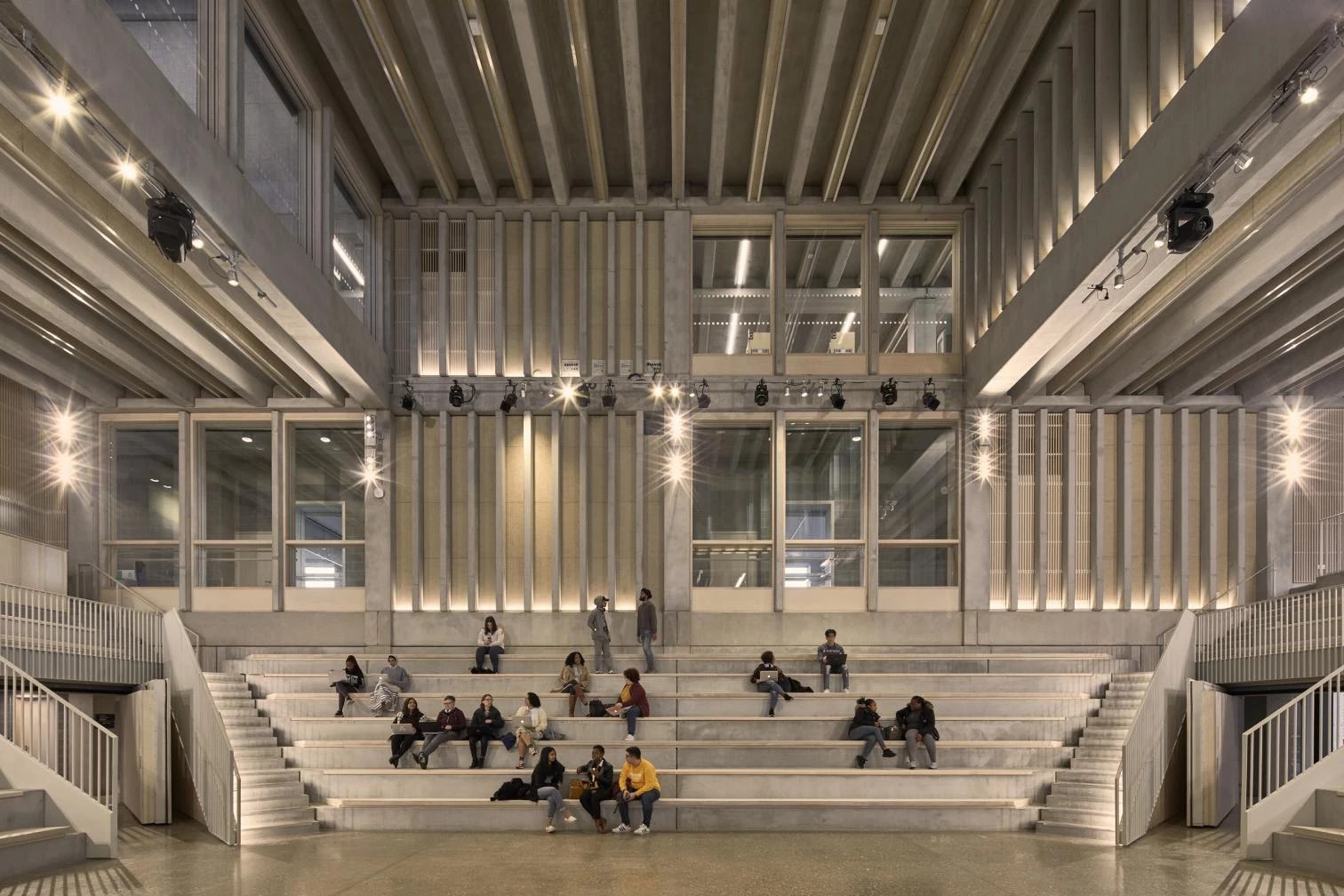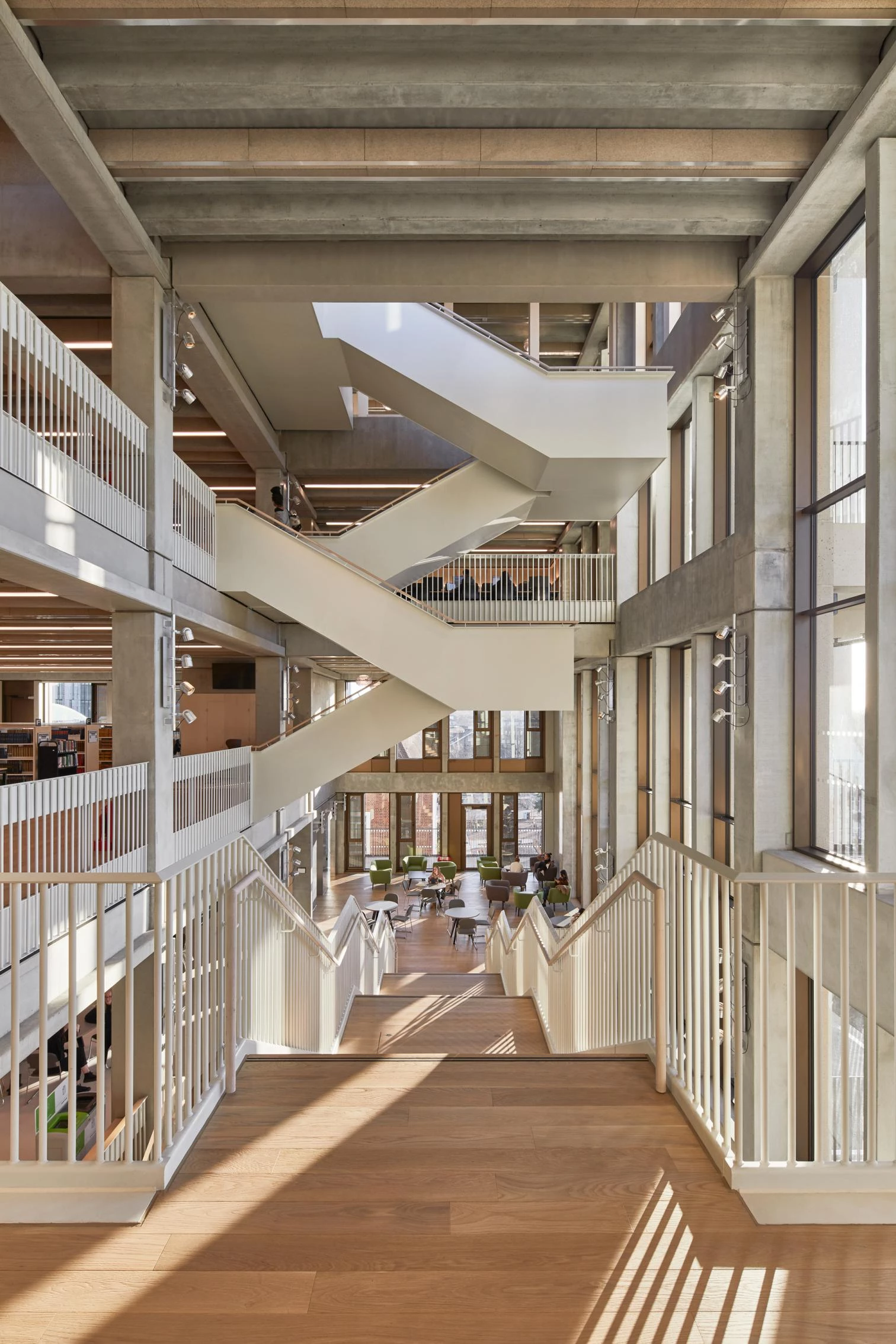 Un almacén de ideas, un laberinto de volúmenes entrelazados, un nexo entre la comunidad y la universidad, así podría describirse este centro nacido de la visión progresista de la Universidad de Kingston. Concebido como un lugar donde pudieran coexistir el sonido y el silencio, el diseño debía además fomentar los intercambios inusuales. De hecho, el encargo requería más de un 50% de espacios abiertos. De perfil reconocible por su volumetría asimétrica definida por pórticos de hormigón prefabricado, el edificio funciona como puerta de entrada al campus y sugiere el carácter abierto y participativo que debe tener hoy una universidad. Además de dotar al conjunto de una imagen representativa, la columnata es un elemento polivalente: funciona como escalera de incendios, balcón, protector solar, jardín o zona exterior de estudio. Hacia el interior, una vez atravesado el umbral de acceso, una gran escalera da la bienvenida a los estudiantes. En el centro se dispone el espacio colectivo principal del conjunto; un auditorio abierto, un foro, volcado hacia el exterior y conectado visualmente con los niveles superiores. Respecto al consumo de energía, se priorizó la implantación de estrategias de climatización pasiva empleando la impulsión mecánica tan sólo allí donde fuera imprescindible.