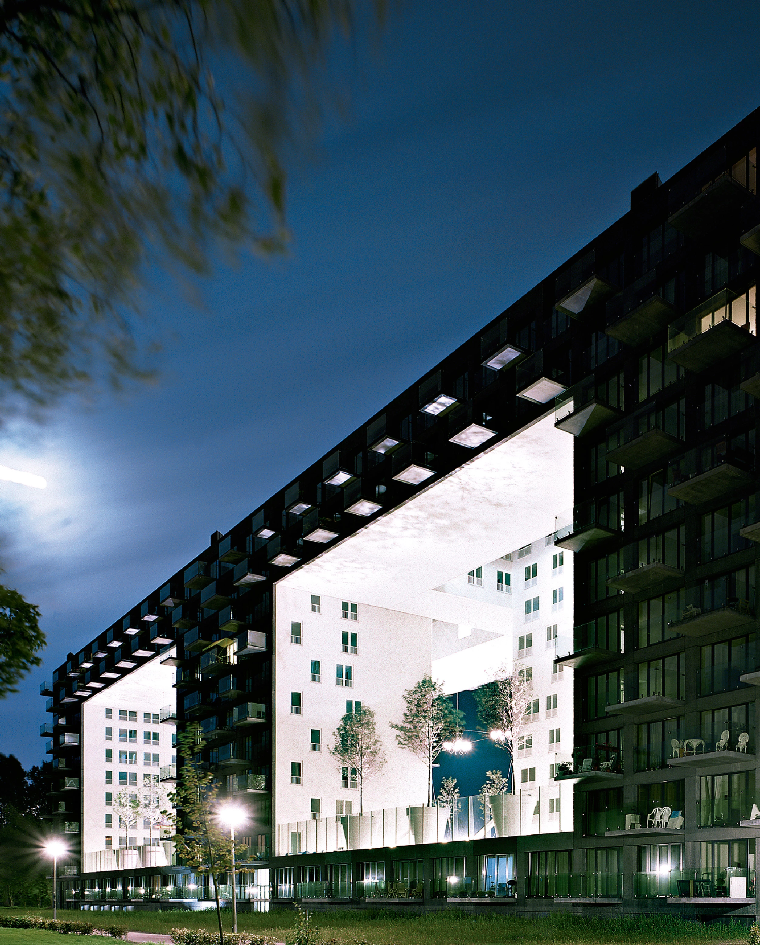 Construidas en las décadas de 1950 y 1960, las Garden Cities de Ámsterdam son grandes complejos residenciales cuya principal cualidad está en los espaciosos parques que las rodean. El proyecto Parkrand consiste en la remodelación de uno de estos complejos, reemplazando las pequeñas viviendas por otras mayores y aumentando asimismo el número de unidades. El principal problema era cómo aumentar la densidad y al mismo tiempo ampliar las áreas ajardinadas. Para ello se opta por reemplazar las 174 pequeñas unidades existentes —alojadas en tres edificios con forma de L—, por un edificio compacto y espectacular de 135 metros de largo por 34 de alto, que contiene 240 viviendas y cuya proporción con el parque es la de una mansión con su jardín. Dividiendo el programa en cinco torres que forman un sándwich entre un basamento y una planta que alberga los áticos, se genera un bloque abierto y se crea un jardín semipúblico elevado que asoma al parque, ampliando así su superficie. La posición de las cinco torres permite que todos los apartamentos disfruten del sol y las vistas; para ello la planta de cubiertas está perforada por tres grandes huecos, y también el basamento, con dos patios que proporcionan luz natural a los apartamentos de la planta primera... [+]