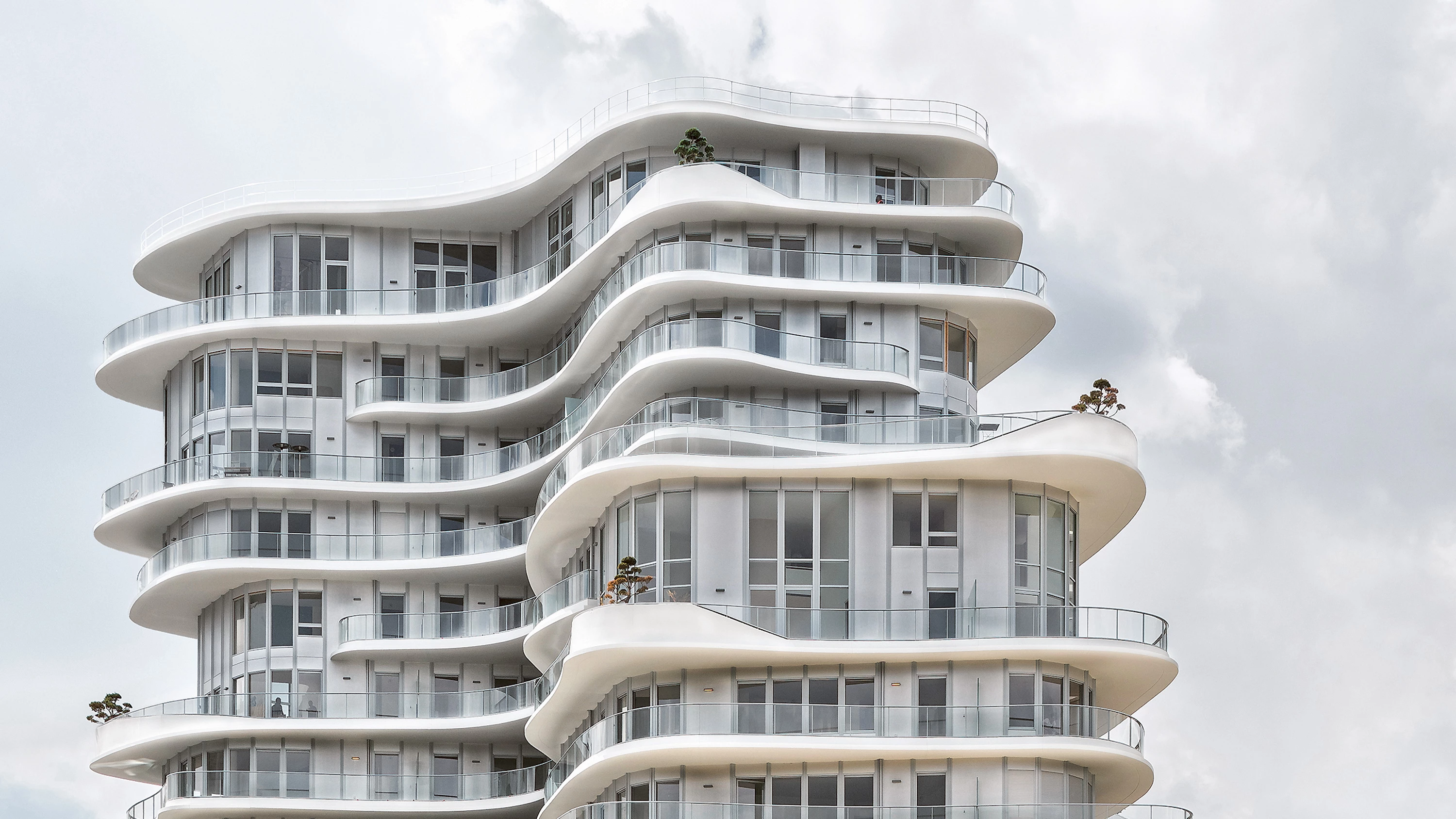 Los voladizos del primer edificio residencial de MAD en Europa, construidos con hormigón blanco, envuelven la fachada para buscar las mejores vistas sobre la Torre Eiffel.