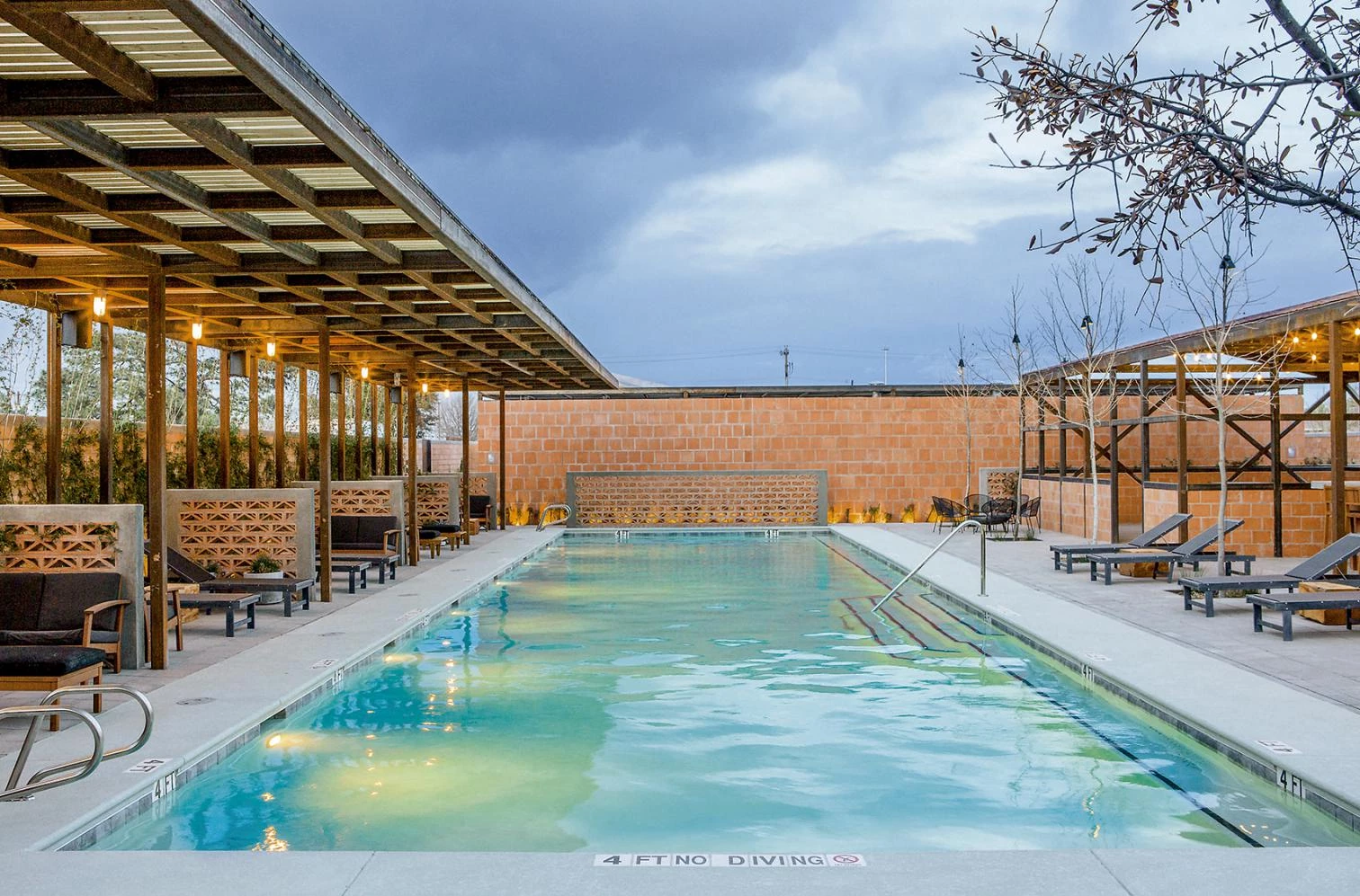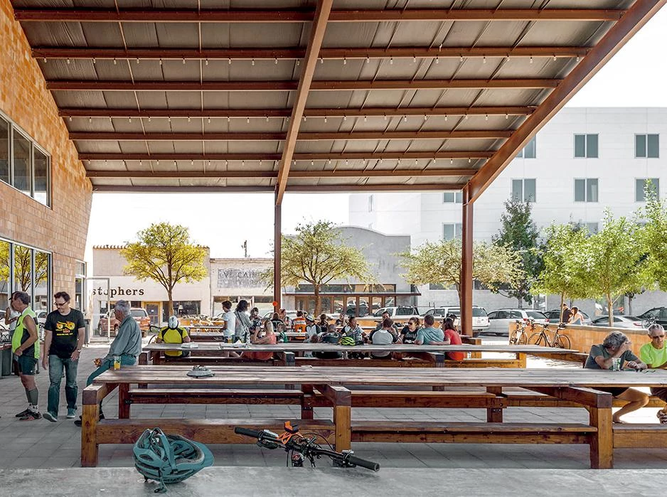 Emplazado junto al Hotel Saint George y cerca de la principal vía de ferrocarril de Marfa, el edificio de 1.000 metros cuadrados funciona como salón multiusos para el hotel y la ciudad. Con su apariencia de cobertizo, el nuevo volumen permite alojar con flexibilidad un conjunto de usos ocasionales, como restaurantes informales, mercados de fin de semana, un espacio grande destinado a la música y el baile, zonas exteriores para comer, una gran piscina, aseos públicos y un bar.