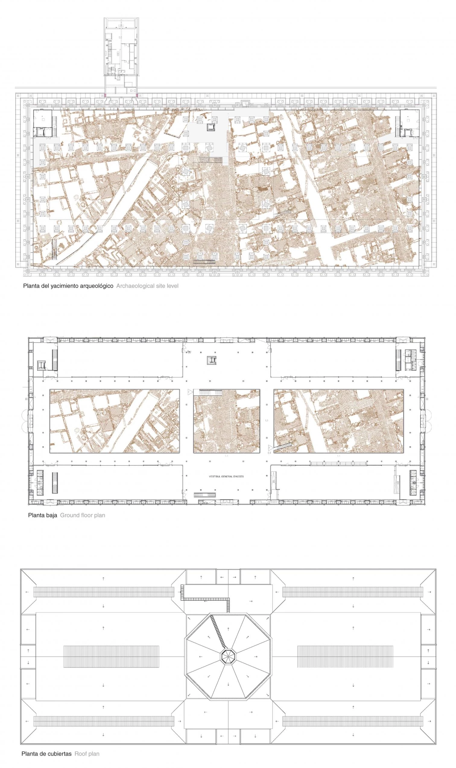 Las cuatro naves laterales, cerradas y acondicionadas, se caracterizan por la gran fachada de cristal que las relaciona visualmente con el espacio público o la calle y con el yacimiento, en torno al cual se organiza todo el centro.