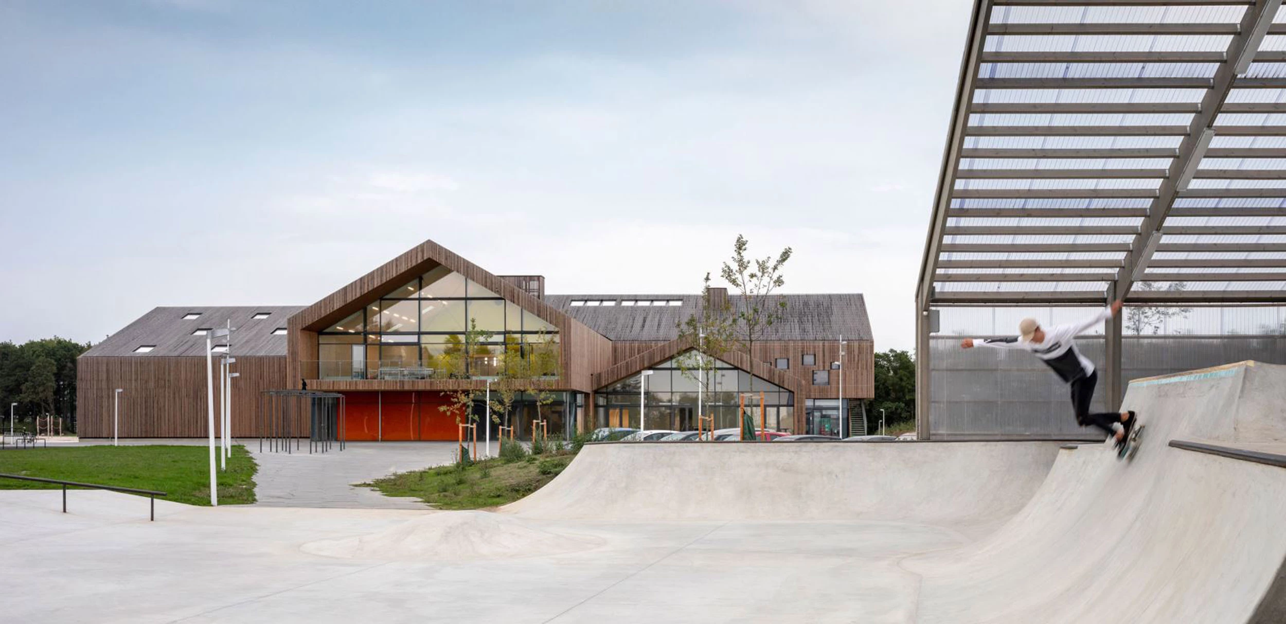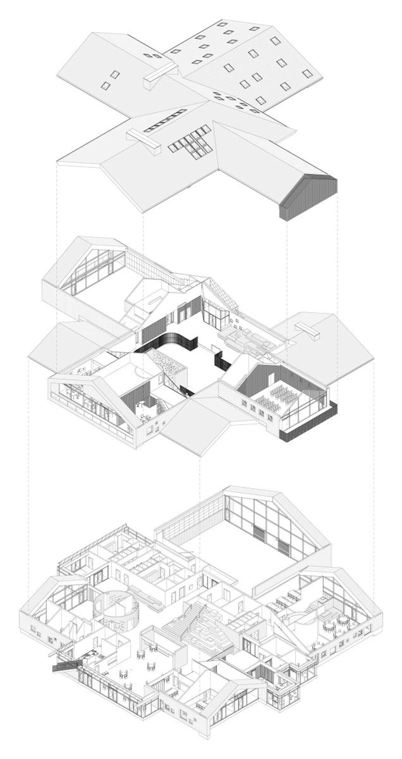 C.F. MøllerLa firma escandinava C.F. Møller ha sido la encargada de construir las nuevas instalaciones que acompañan a la Escuela Internacional Ikast-Brande situada en Ikast, una localidad danesa en la región de Jutlandia Central. Rodeado de zonas deportivas al aire libre, el denominado ‘Corazón’ es un edificio formado por una serie de pastillas envueltas con madera y vidrio, cuyas cubiertas inclinadas se entrelazan. En torno a un núcleo central polivalente se ubican los espacios de tamaños variados, caracterizados por su flexibilidad de uso. El objetivo es generar un foco activo de reunión social para la comunidad.