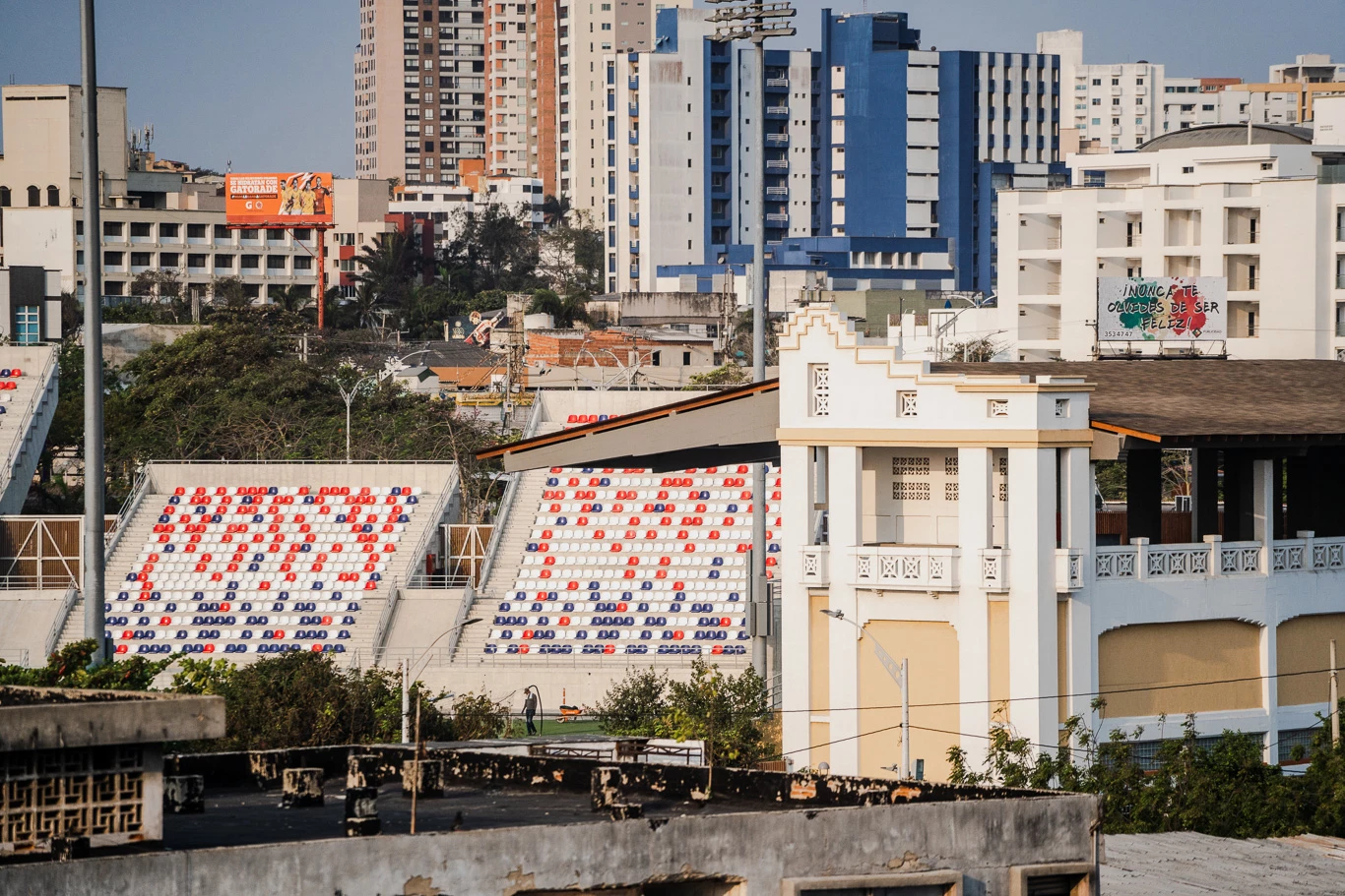 En el lado este las bandas se convierten en terrazas que en su parte inferior contienen locales de artesanía relacionada con el carnaval; en el lado oeste estas bandas dan paso a jardines que en su interior albergan restaurantes; así el estadio es autosostenible y capaz de generar otras actividades además del deporte y el carnaval durante el año. En el lado norte está situada la tribuna patrimonial, y está previsto que albergue un museo dedicado a la historia del fútbol en Colombia, que tiene su origen en Barranquilla a principios del siglo XX.