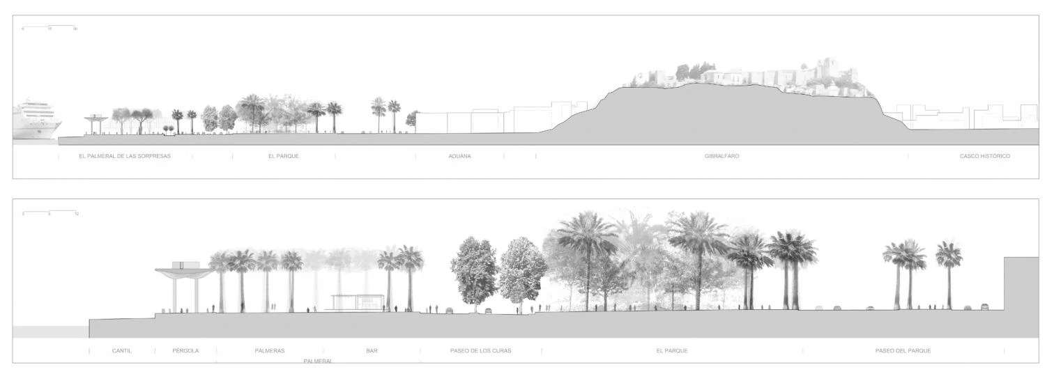 El Palmeral de las Sorpresas recompone la relación de Málaga con el mar. El puerto, con sus fases de crecimiento y estancamiento ha marcado la historia de la ciudad desde su fundación fenicia. Así, su aprovechamiento industrial durante el último siglo provocó que se creara una escisión total con respecto al tejido urbano, por lo que la creciente importancia del sector turístico hizo plantear desde la década de 1990 el objetivo de que este espacio se convirtiera en un nuevo lugar de convivencia ciudadana. Asomado al Mediterráneo, este espacio se ha formalizado mediante una trama isótropa de palmeras, una pérgola paralela al muelle, y una lámina de conexión con la ciudad.