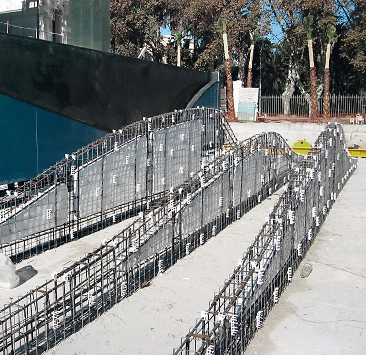 De la viga cajón cuelgan 265 lamas ortogonales a la alineación del muelle, que tienen una longitud de 14 metros. La geometría variable de las lamas y sus nueve modelos diferentes logran un característico efecto de fluidez.