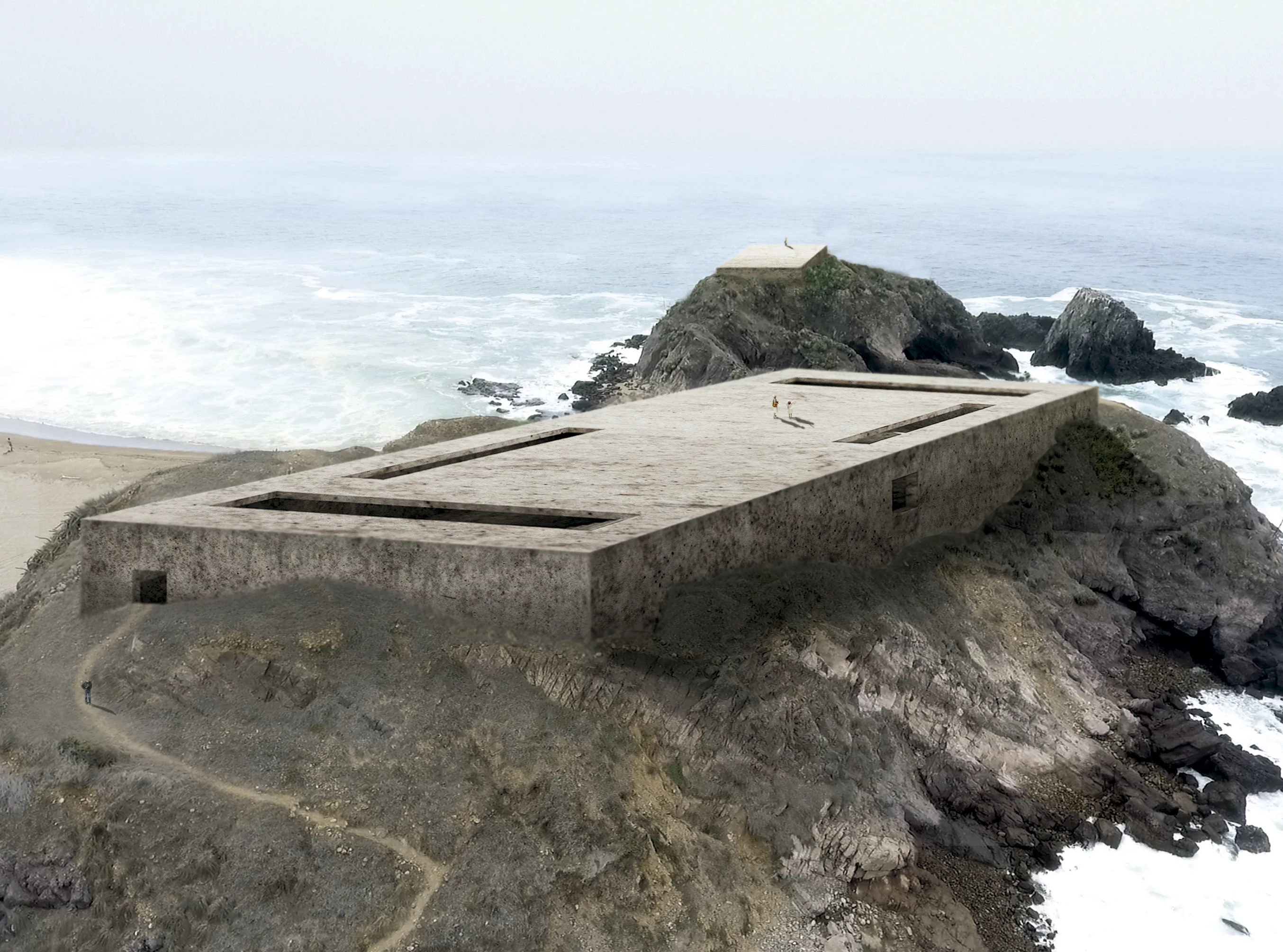 Como si fuera la cubierta de un barco varado entre dos playas, una plataforma horizontal sobre un colosal cajón pétreo que parece emerger de las entrañas de la Tierra ofrece vistas sobre el mar lejano...[+][+]