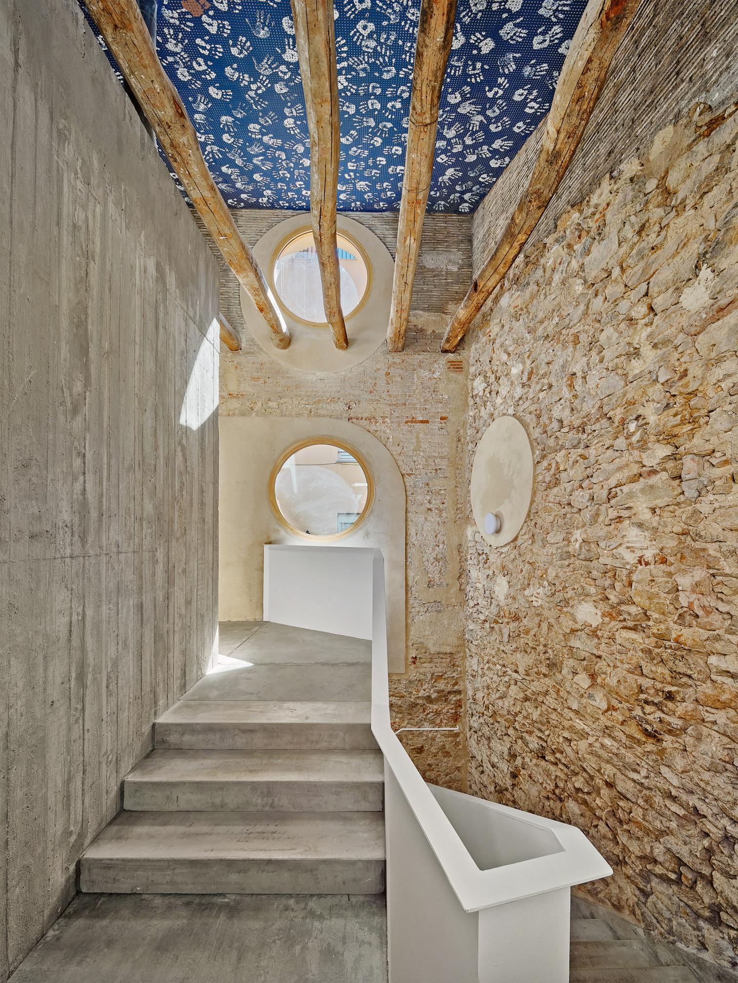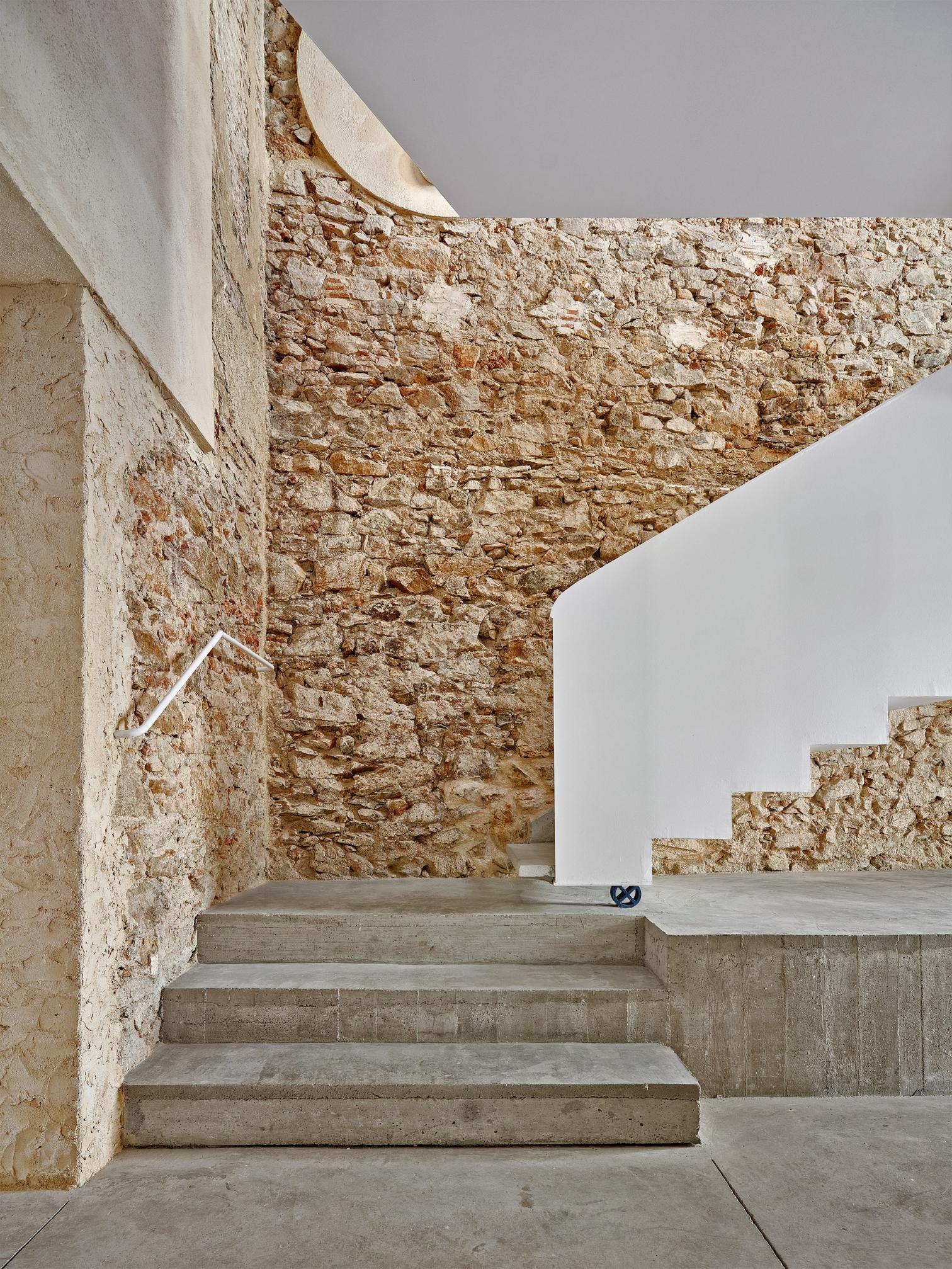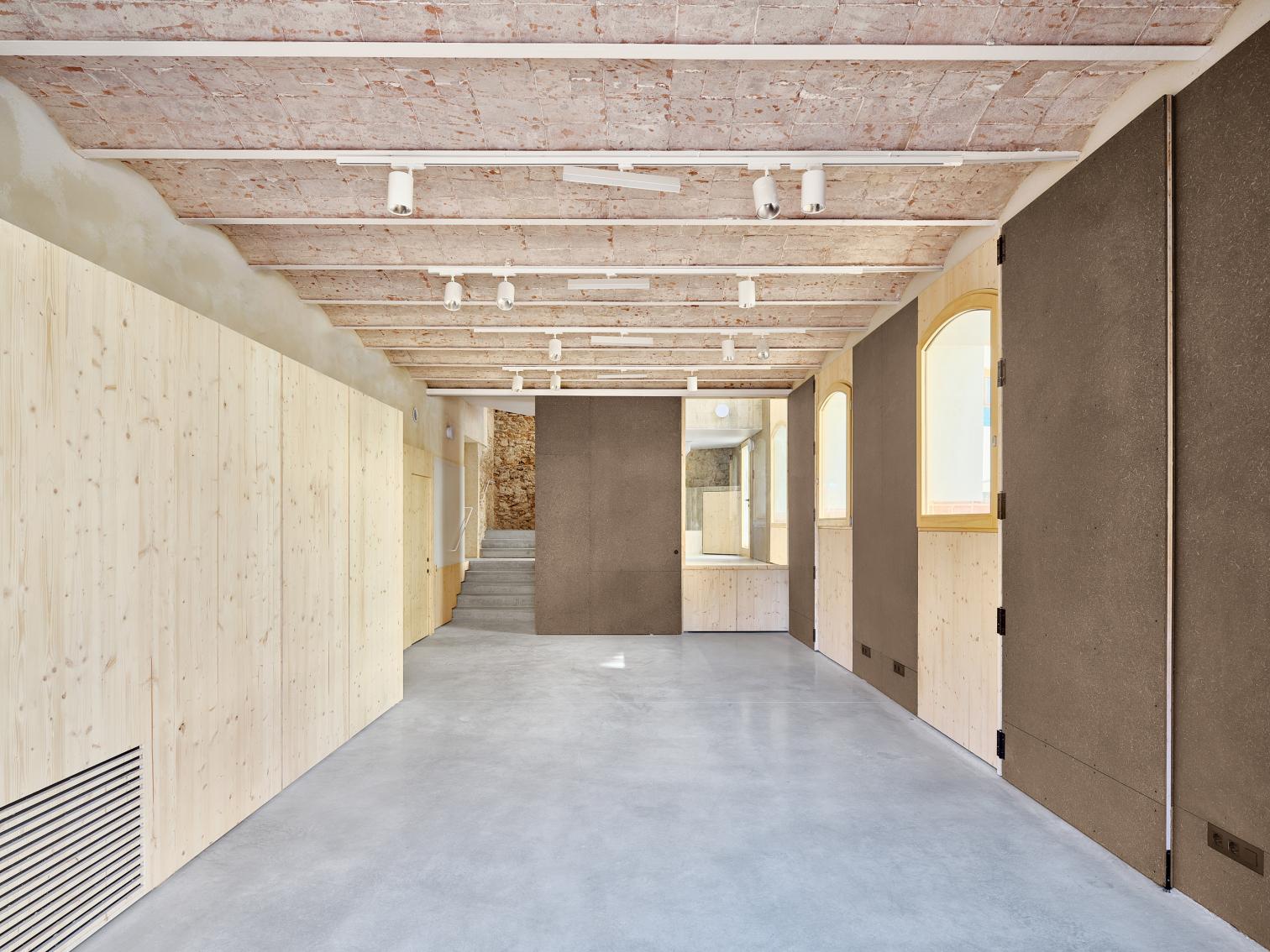 Hasta que Eusebi Güell llegó para abrir su fábrica textil y su pionera colonia obrera con la ayuda de Gaudí, Santa Coloma de Cervelló no era más que un villorrio agrícola a orillas del Llobregat, de cuyo pasado modesto sigue dando testimonio la antigua casa consistorial: un edificio de mediados del siglo xix que desde entonces ha conocido un sinfín de usos y que languidecía en el corazón del pueblo por su deficiente mantenimiento. Con idea de recuperarlo como equipamiento municipal, su interior se ha renovado con amplio grado de libertad, pues digno de conservación no era más que el propio sistema constructivo. Se decidió dejar desnudos los muros originales de mampuestos y hacer legibles sus estratificaciones, que quedan en armonía con los nuevos paneles de cemento-madera y las hojas de ladrillo acústico que visten la cara interior de las fachadas para mejorar su aislamiento. Como único acento en la deferente paleta material, el núcleo de comunicación vertical en torno al cual pivotan las distintas salas polivalentes se ejecuta en un hormigón crudo, que a su vez aporta cierta continuidad entre los dos niveles.