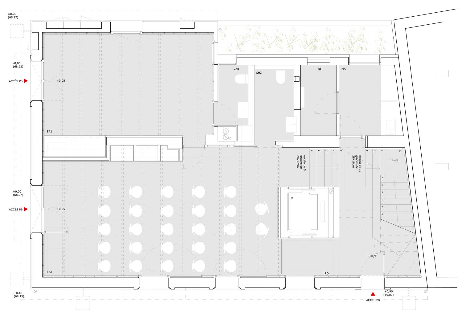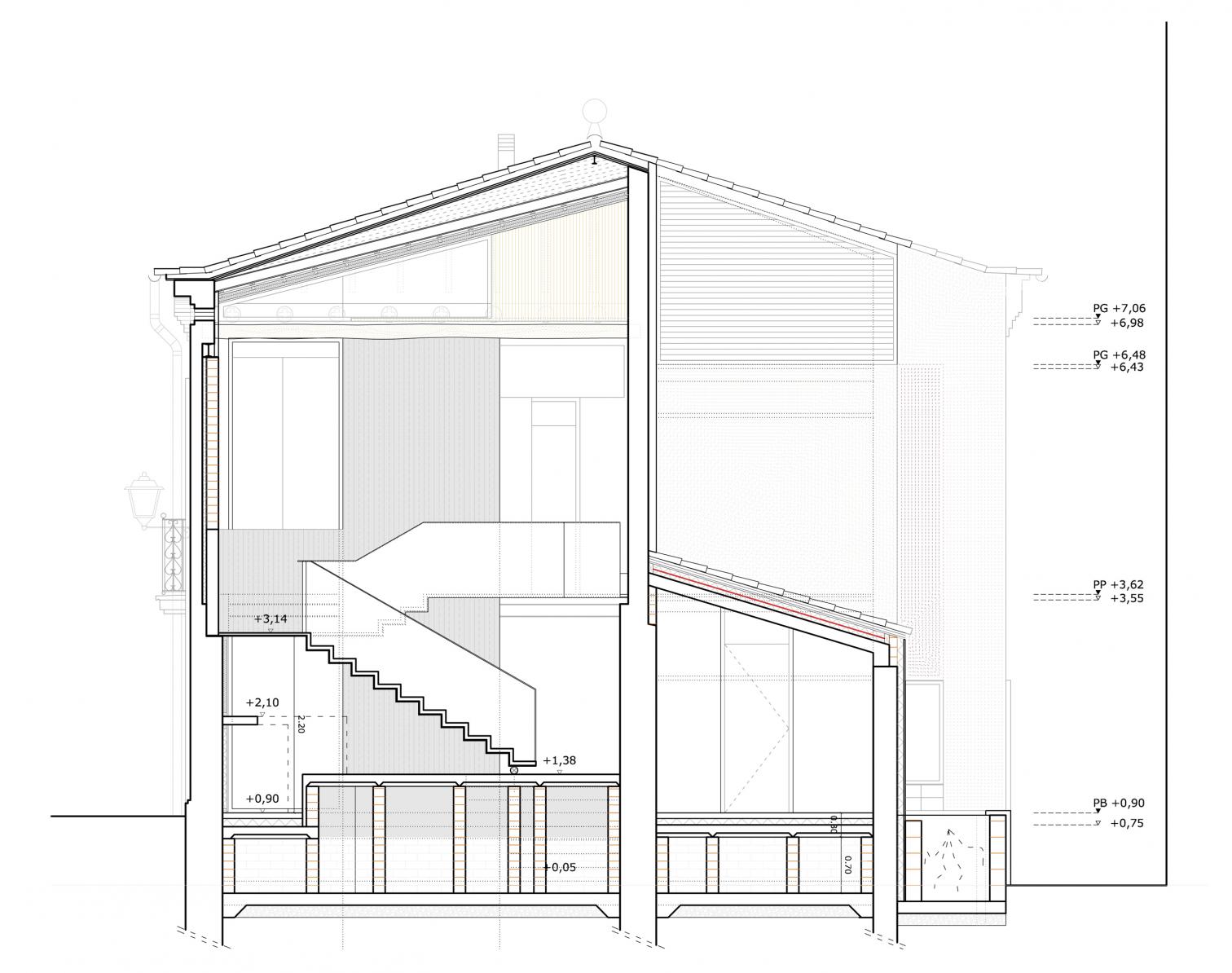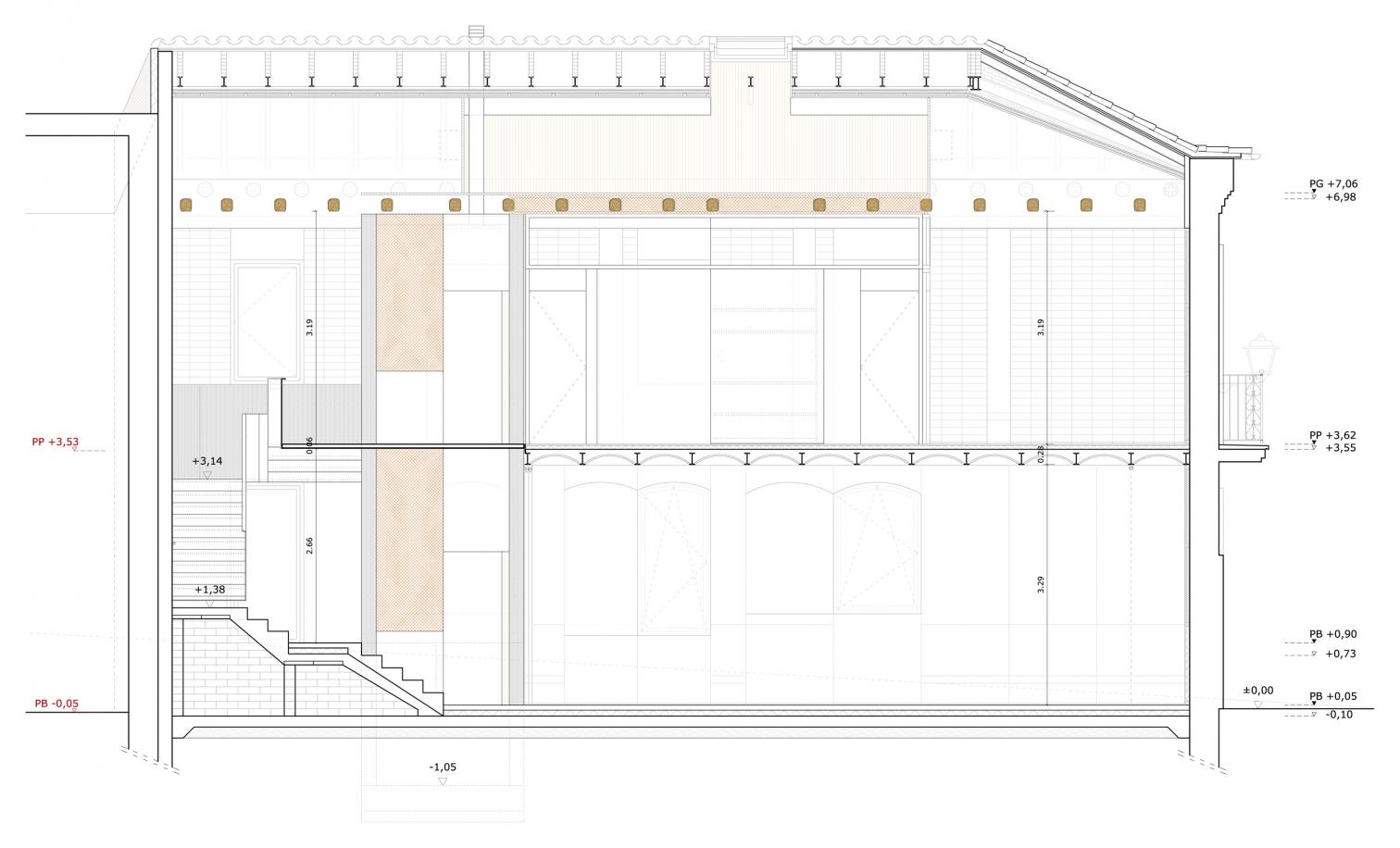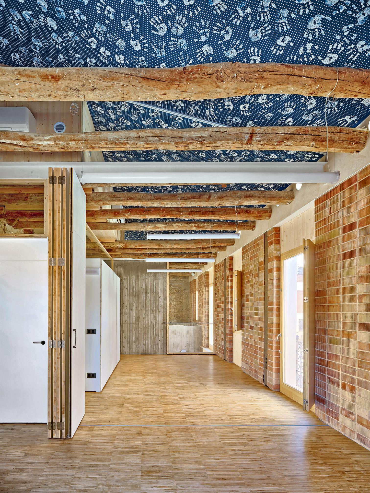 Hasta que Eusebi Güell llegó para abrir su fábrica textil y su pionera colonia obrera con la ayuda de Gaudí, Santa Coloma de Cervelló no era más que un villorrio agrícola a orillas del Llobregat, de cuyo pasado modesto sigue dando testimonio la antigua casa consistorial: un edificio de mediados del siglo xix que desde entonces ha conocido un sinfín de usos y que languidecía en el corazón del pueblo por su deficiente mantenimiento. Con idea de recuperarlo como equipamiento municipal, su interior se ha renovado con amplio grado de libertad, pues digno de conservación no era más que el propio sistema constructivo. Se decidió dejar desnudos los muros originales de mampuestos y hacer legibles sus estratificaciones, que quedan en armonía con los nuevos paneles de cemento-madera y las hojas de ladrillo acústico que visten la cara interior de las fachadas para mejorar su aislamiento. Como único acento en la deferente paleta material, el núcleo de comunicación vertical en torno al cual pivotan las distintas salas polivalentes se ejecuta en un hormigón crudo, que a su vez aporta cierta continuidad entre los dos niveles.