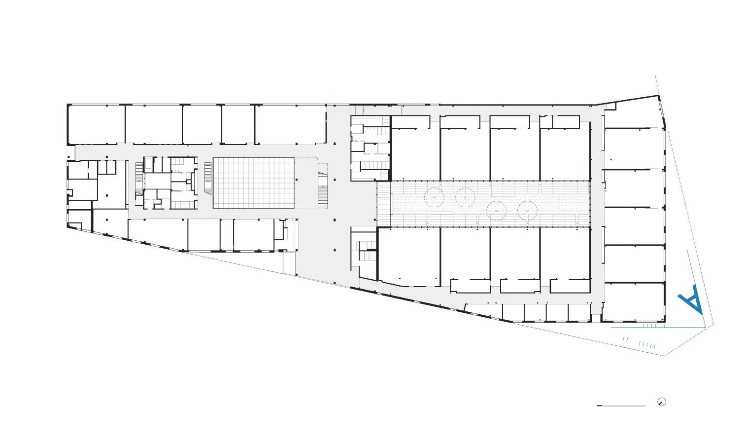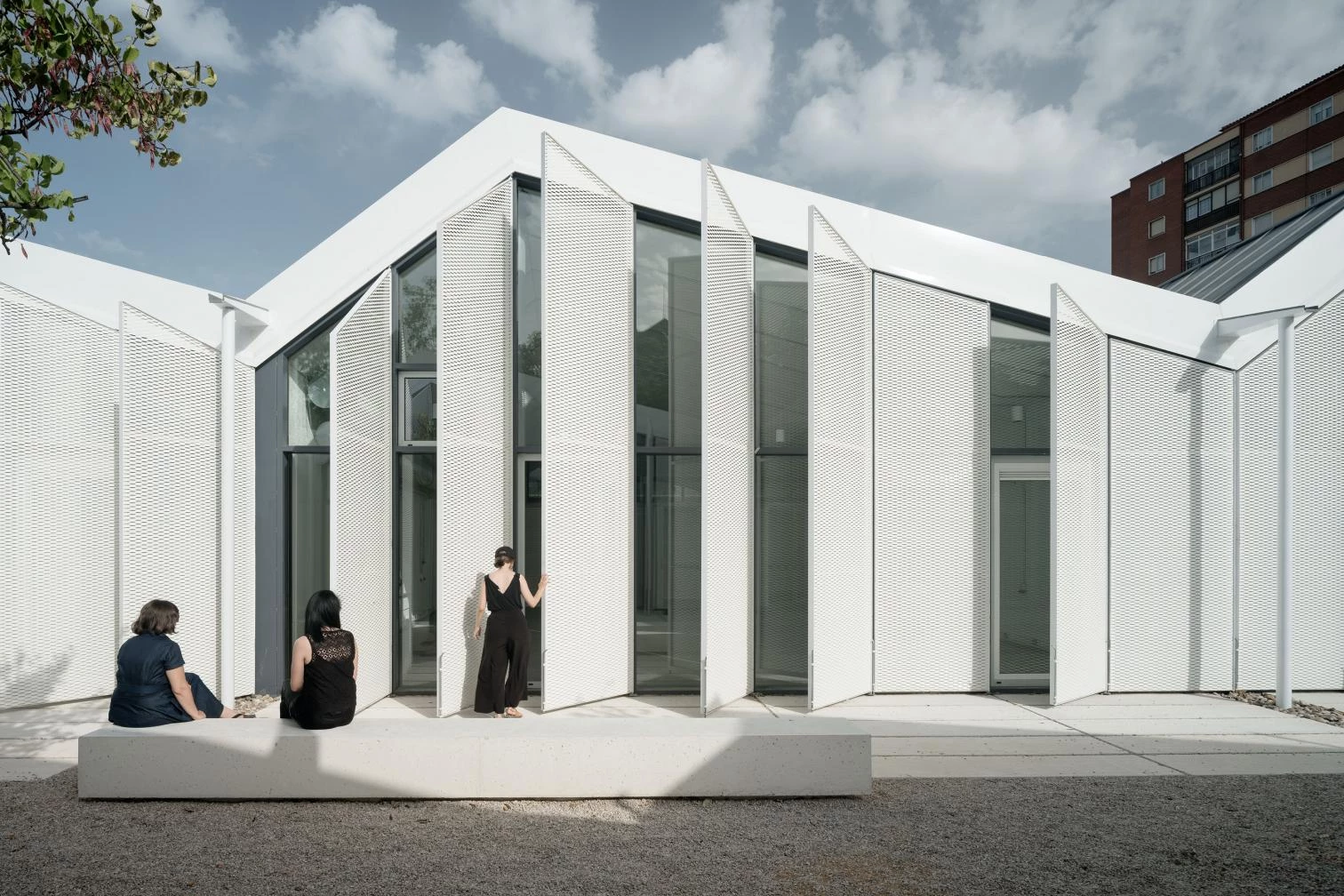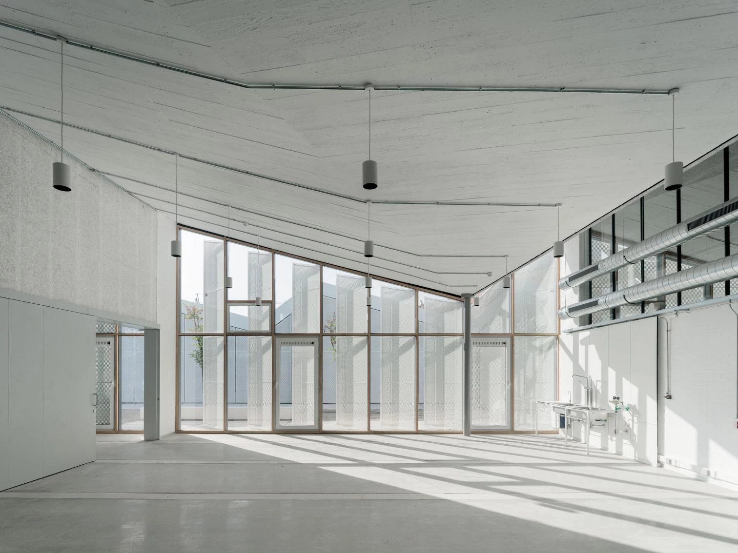 Como sistema de proyecto se mantiene la arquitectura de patios aprendida del convento colindante. Uno de los patios articula la zona de aulas en dos alturas, mientras que el otro, algo más grande, organiza los talleres bajo un plano de hormigón plegado. Este plano mantiene un perfil recto en su presencia respetuosa en fachada, mientras que hacia el interior presenta un perfil quebrado, generando unos grandes ventanales que vuelcan al patio, un espacio central concebido como ágora de creación joven, dinámica y versátil donde los estudiantes pueden compartir sus experiencias. Los patios se convierten así en vitrinas donde exponer, actuar o relacionarse, un esquema tipológico tradicional actualizado.