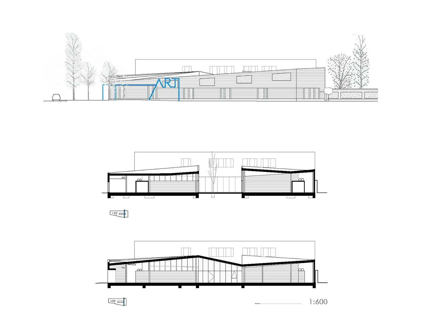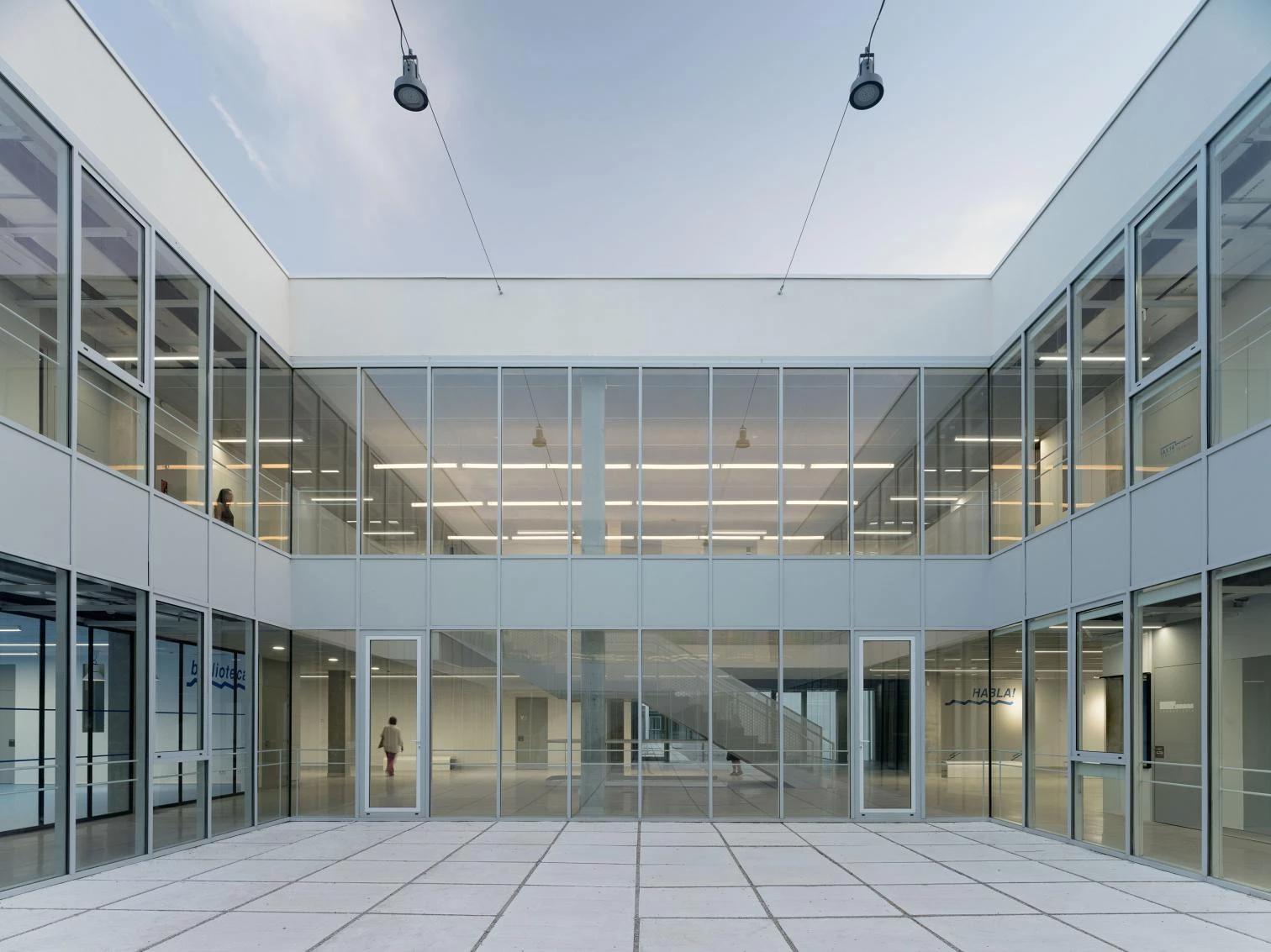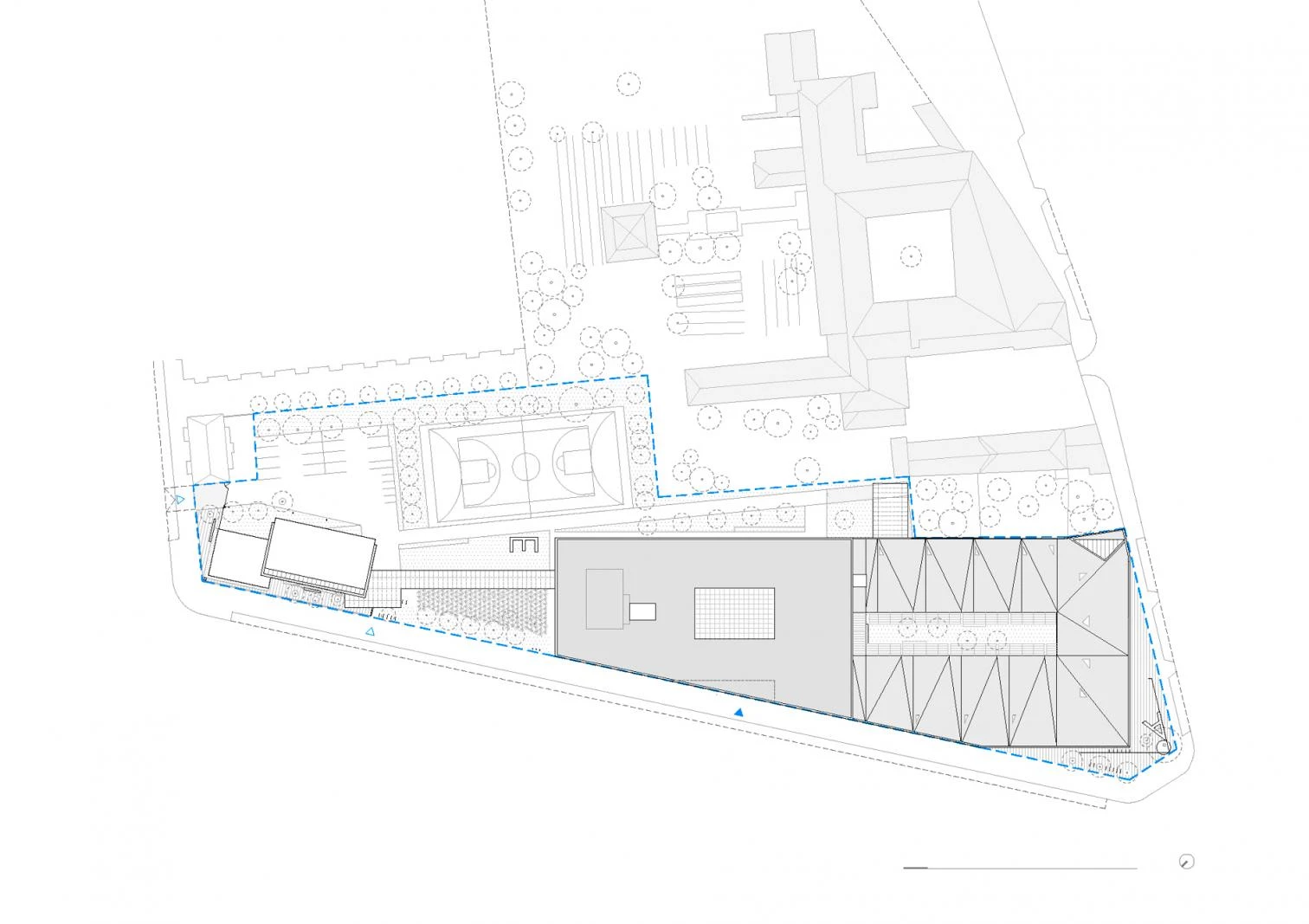 Como sistema de proyecto se mantiene la arquitectura de patios aprendida del convento colindante. Uno de los patios articula la zona de aulas en dos alturas, mientras que el otro, algo más grande, organiza los talleres bajo un plano de hormigón plegado. Este plano mantiene un perfil recto en su presencia respetuosa en fachada, mientras que hacia el interior presenta un perfil quebrado, generando unos grandes ventanales que vuelcan al patio, un espacio central concebido como ágora de creación joven, dinámica y versátil donde los estudiantes pueden compartir sus experiencias. Los patios se convierten así en vitrinas donde exponer, actuar o relacionarse, un esquema tipológico tradicional actualizado.