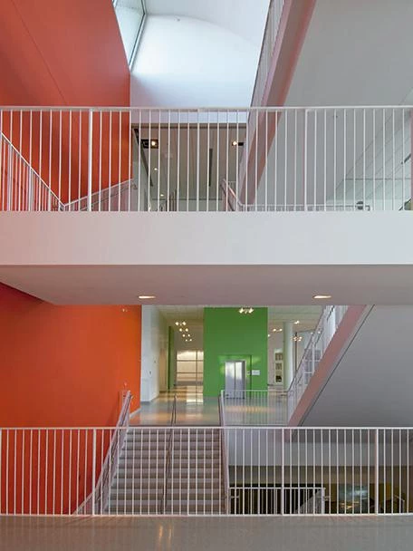 Dando respuesta a estos objetivos, el edificio de 23.000 metros cuadrados consiste en un zócalo destinado a talleres de fotografía y ebanistería, sala de conferencias e instalaciones, una primera planta con el área de admisiones, la sala de exposiciones y los talleres de cerámica, escultura y vidrio, una segunda planta con las aulas de metales, joyería, impresión y artes gráficas, y, finalmente, un ático orientado al norte que alberga los talleres de dibujo y pintura. Todos estos espacios están dotados de un carácter propio, sin dejar de pertenecer a un conjunto unitario que se percibe a través de un paseo arquitectónico desplegado en dos niveles, y que comienza en un generoso vestíbulo inundado de luz natural.