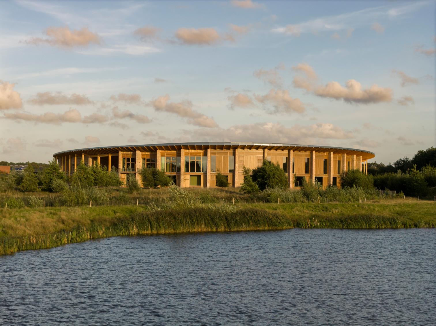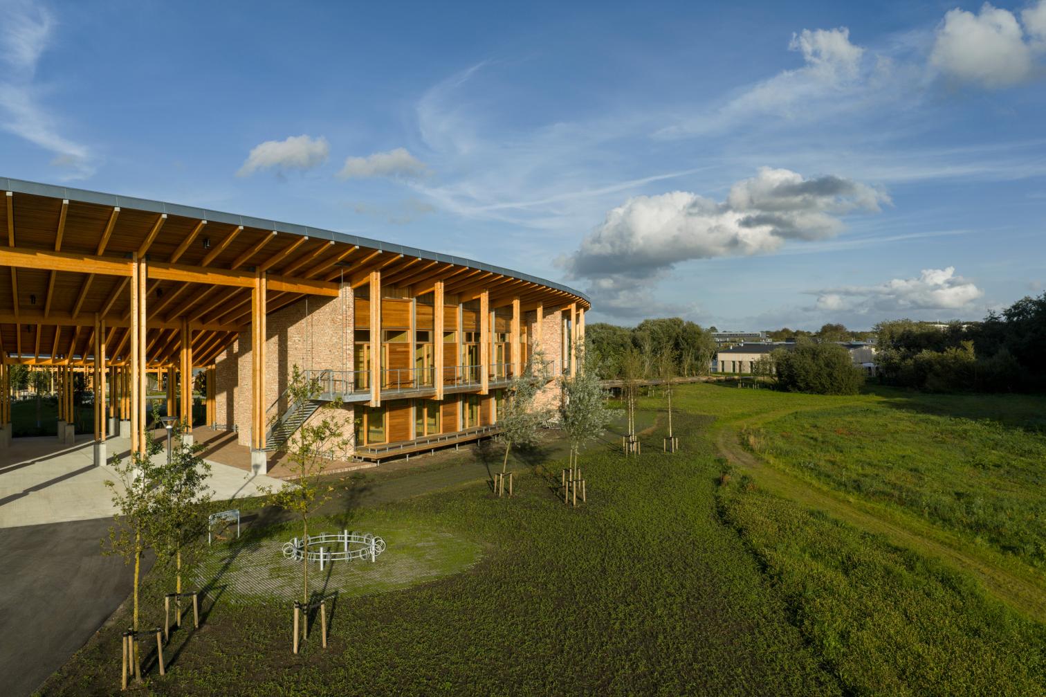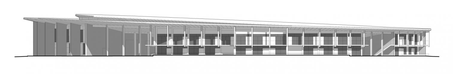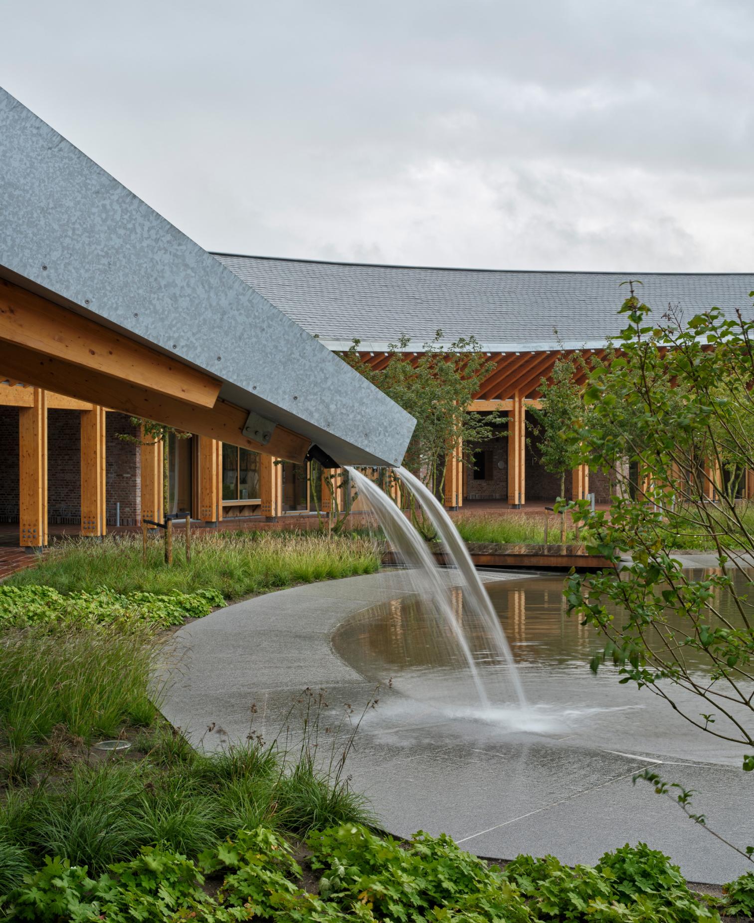 Bajo una amplia cubierta elíptica de pizarra, el edificio de dos plantas abraza un amplio patio. Tras un exhaustivo análisis meteorológico y solar, la cubierta adopta una inclinación variable y una cumbrera ondulada que optimizan la entrada de luz natural sin comprometer la protección frente al viento.