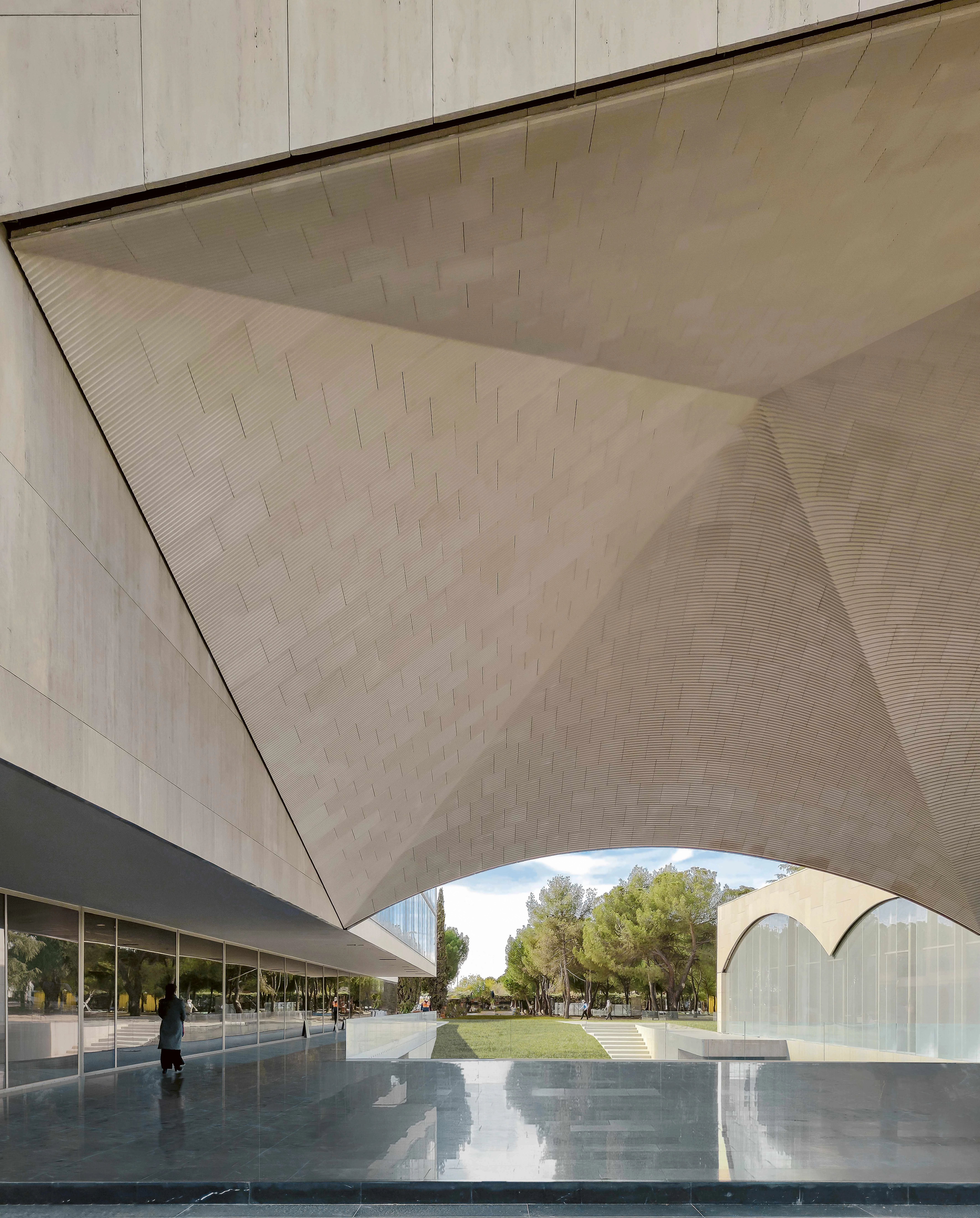 Una bóveda de piedra compuesta por 777 piezas parametrizadas y encajadas entre sí cubre un atrio abierto al pinar, punto de acceso y encuentro que articula el volumen bajo del auditorio y el bloque acristalado del aulario.
