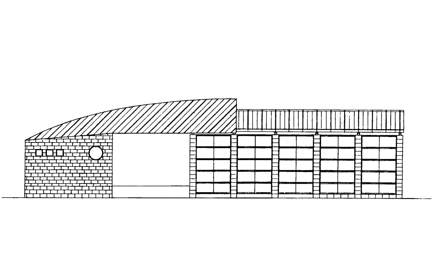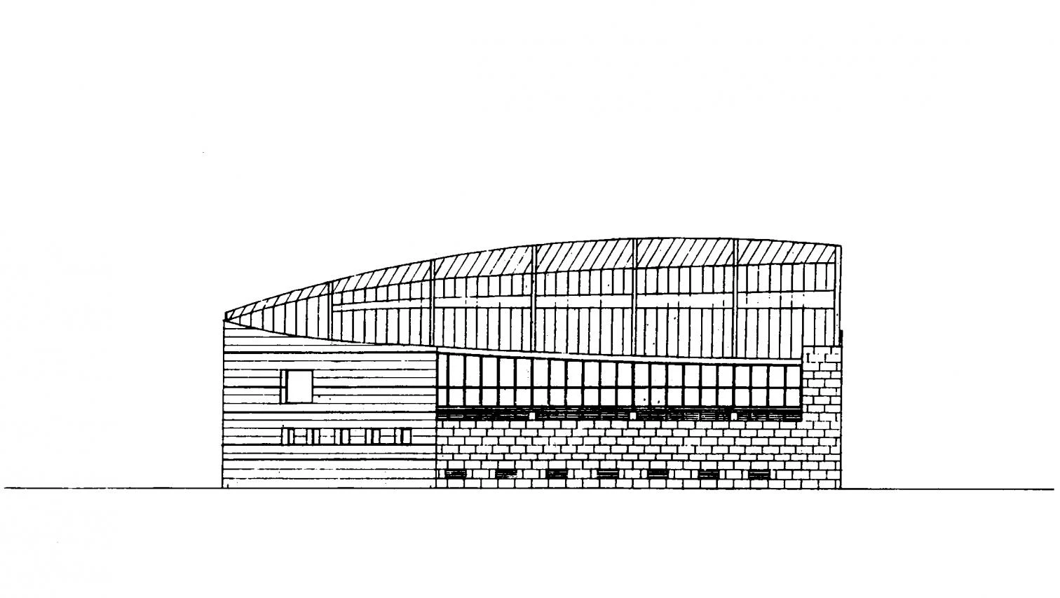 Tres volúmenes, dos de ellos cerrados y uno abierto, agrupan las diversas actividades de la escuela, formando una L sobre la que se extiende la cubierta con estructura de madera laminada.