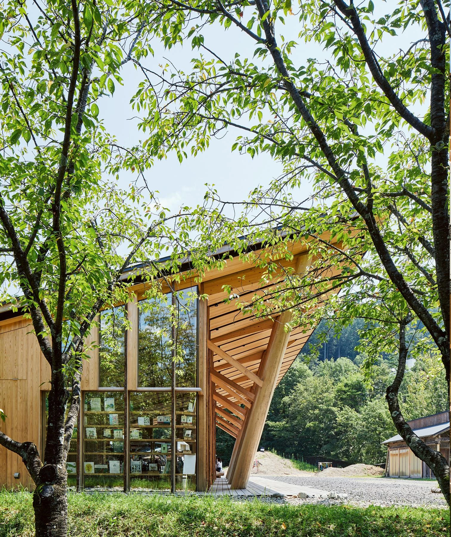 El empleo mesurado de los recursos forestales caracteriza la estructura de pilares en V del edificio, compuesta por troncos de ciprés cortados por los estudiantes del centro, y completada con acabados y carpinterías de cedro.