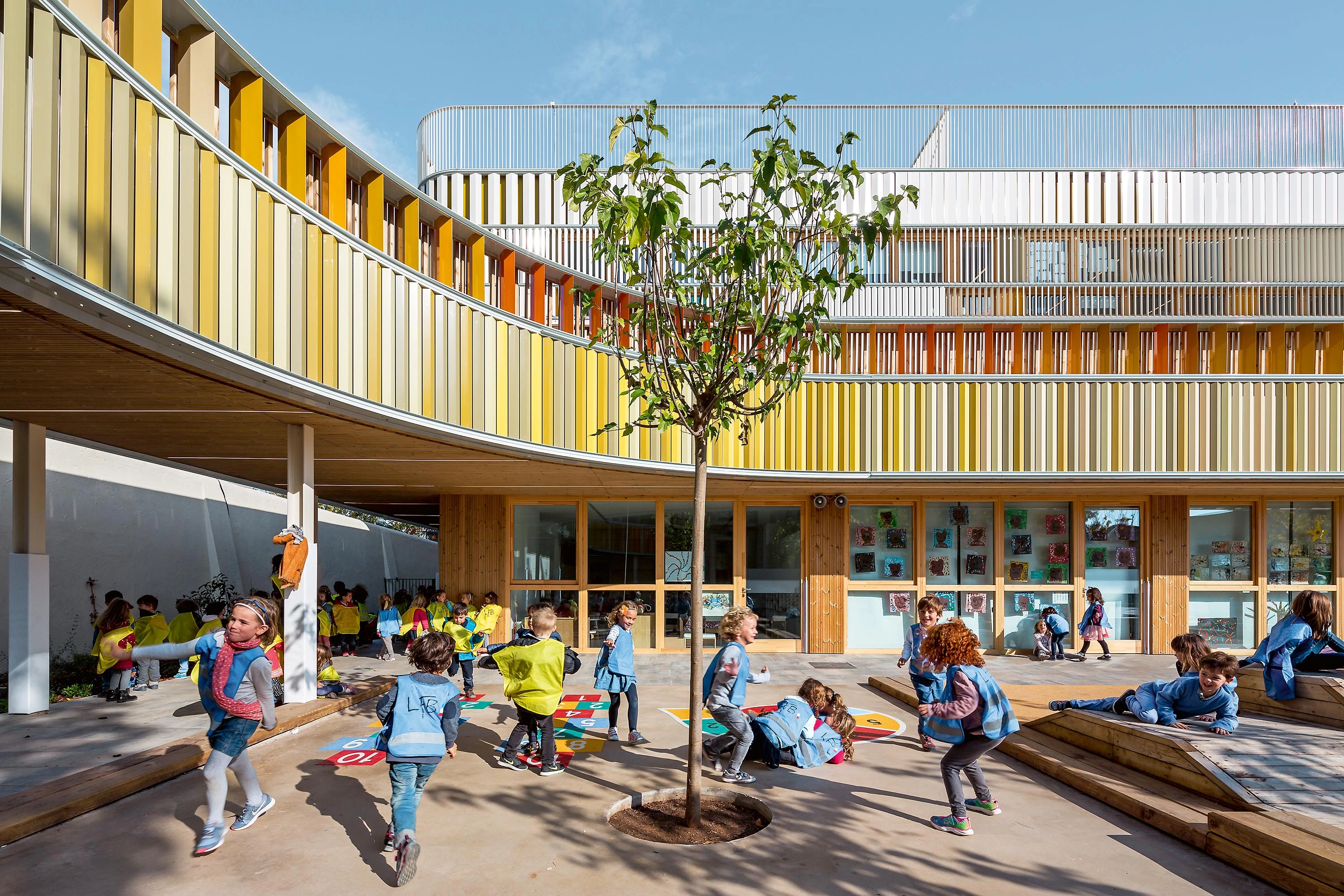 La renovación de la escuela infantil del Liceo Francés sustituye una de las dos villas históricas existentes por un bloque multicolor que reorganiza el solar y contribuye a modernizar la imagen de la institución.