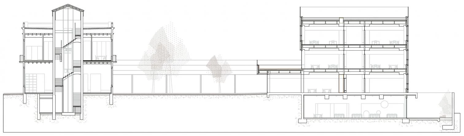 El programa se reparte en cuatro niveles, que sirven además para solucionar la diferencia de cota con la calle. La entrada puede realizarse desde la planta semisótano, donde se reserva un vestíbulo de espera, pero tanto los padres como los alumnos cuentan además con unas escaleras y una serie de rampas exteriores que permiten el acceso directo al jardín. Cada altura del edificio se destina a un nivel escolar, distribuidos en los tres pisos restantes, mientras que la cubierta se acondiciona como un espacio de juego adicional. El proyecto concentra la totalidad de las aulas, mientras que los usos comunes —tales como la mediateca y la sala de música— y las áreas de administración se alojan en la villa conservada tras llevar a cabo una minuciosa restauración.