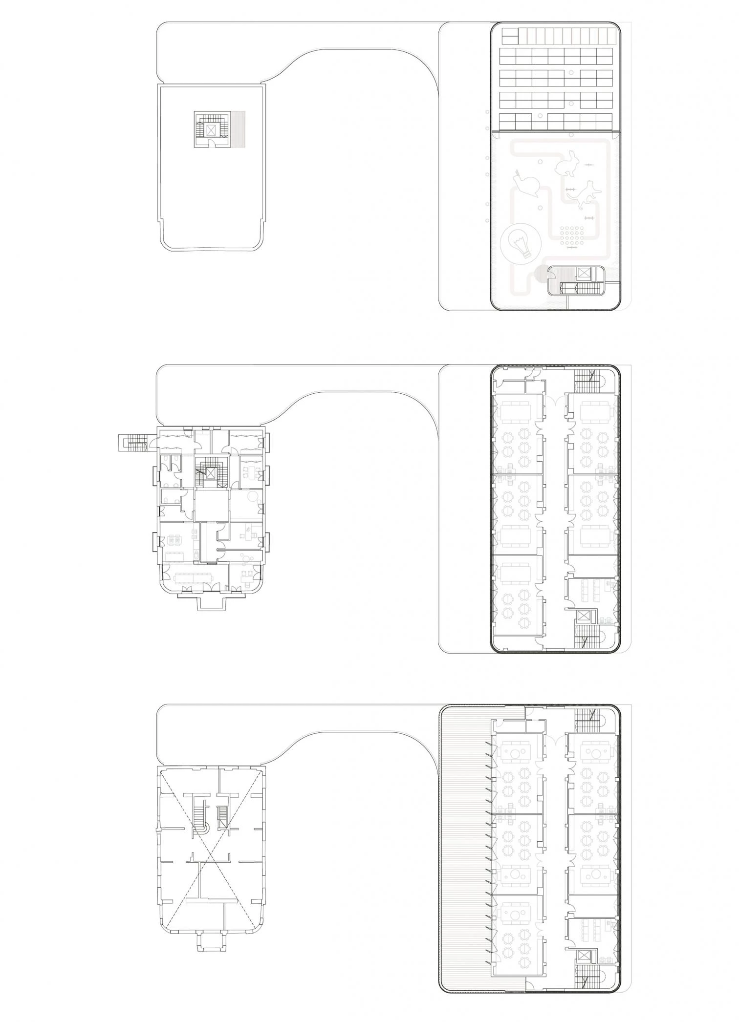 Las áreas de juego se distribuyen entre el último nivel del nuevo edificio y el jardín central, un espacio delimitado por un porche cubierto que conecta ambos volúmenes y cuya parte superior funciona como terraza.