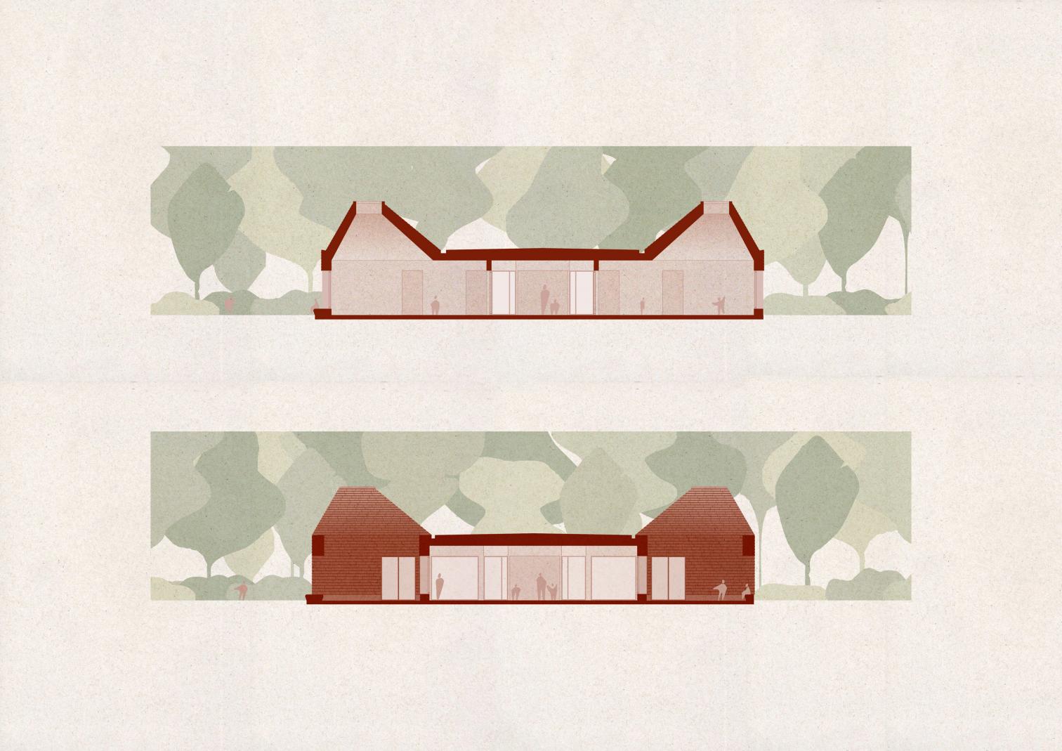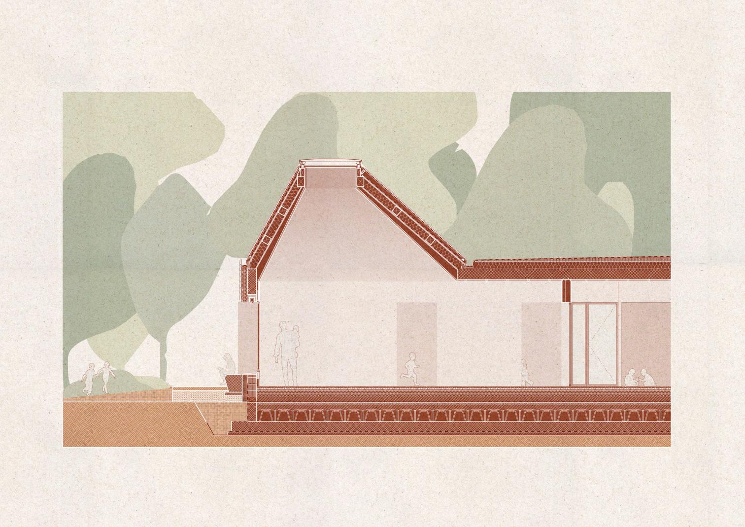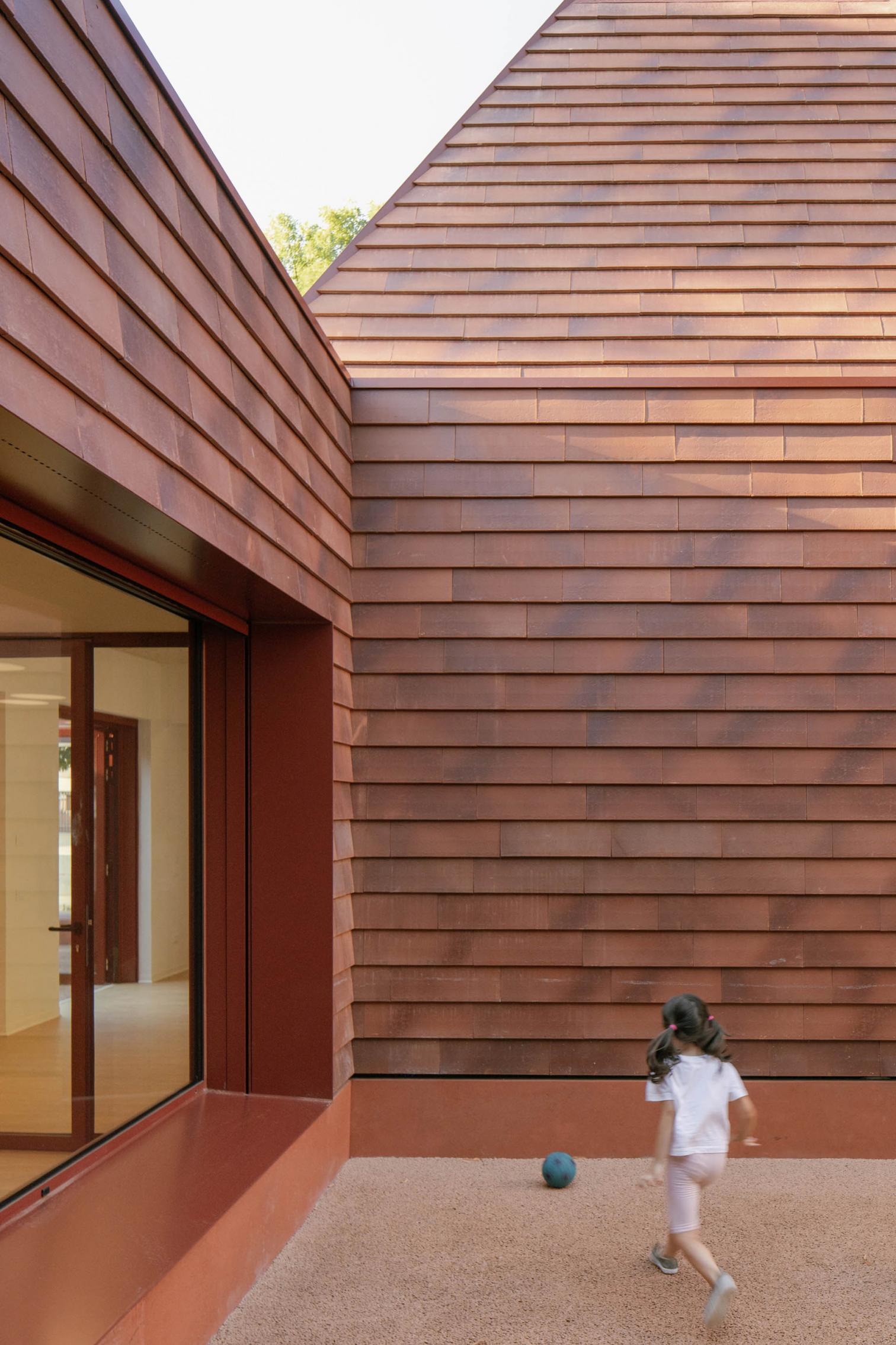 La propuesta reinterpreta el casone de la región del Véneto —la vivienda tradicional de agricultores y pescadores—, originalmente construida con paja, cañas y barro, definida por su cubierta inclinada. Tres aulas destacan como volúmenes singulares dentro de una envolvente continua de tejas de terracota, evocando la tradición constructiva en arcilla. En la base, un banco perimetral de hormigón pigmentado en tonos rojizos actúa como mobiliario y umbral lúdico. En el interior de las aulas, los techos piramidales culminan en tragaluces y se revisten con paneles de fibra de madera que mejoran la acústica y reinterpretan la herencia local.