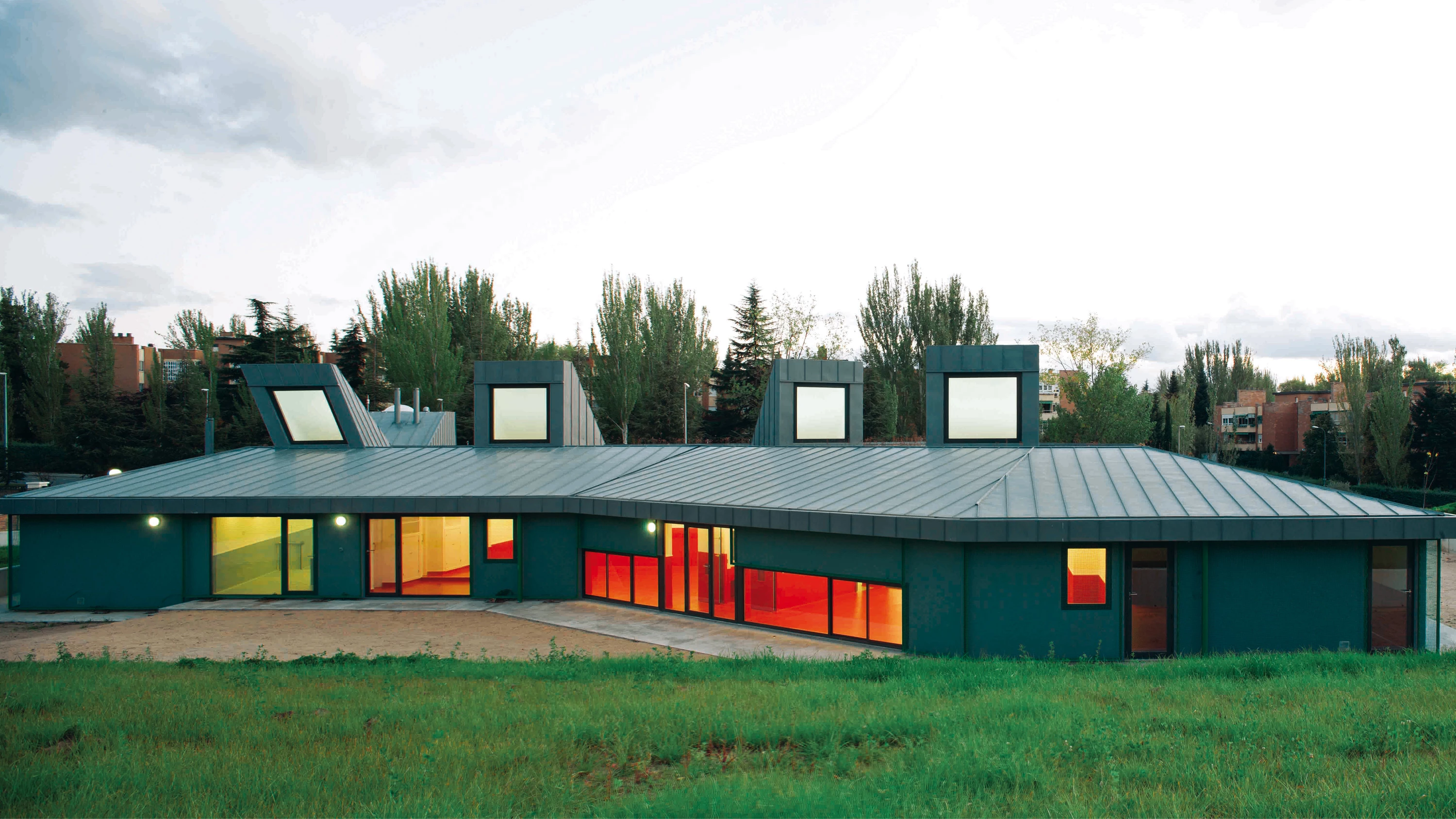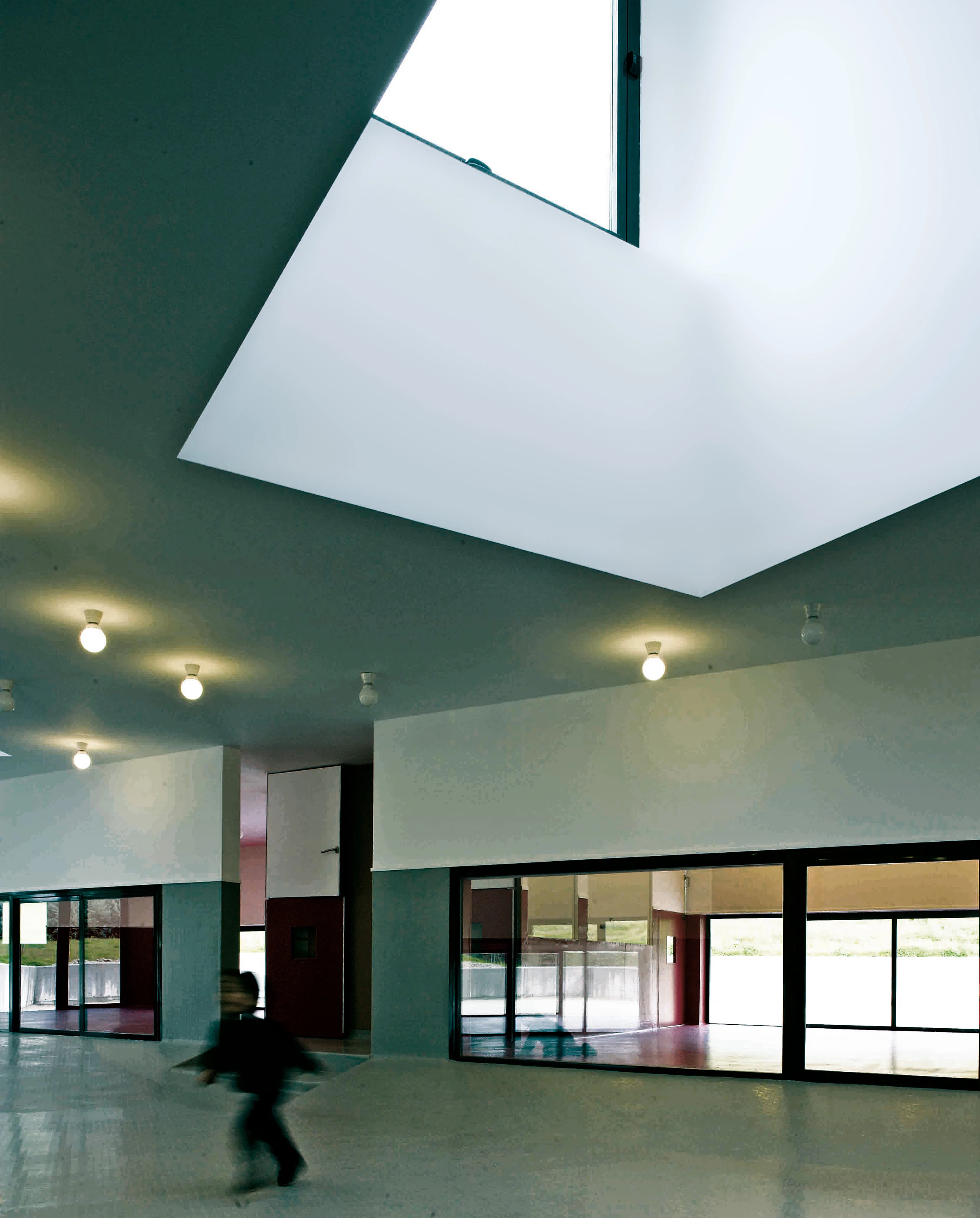 La estrategia seguida en el proyecto de esta escuela infantil se centra en la materialización de dos sistemas complementarios: unos suelos que acogen y enseñan a los niños, y una cubierta que acondiciona energéticamente dichos suelos. Los suelos, organizados en bandas que llegan hasta los límites del solar, constituyen una secuencia de lugares: la ‘calle interior’ que conecta todos los espacios y es el lugar de encuentro de niños, profesores y padres; las aulas, lugar de aprendizaje de los niños; los areneros que rodean todo el edificio y funcionan como áreas de juego; y el ‘jardín en movimiento’, donde destacan tres colinas artificiales con jardinería intensiva sobre un manto de vegetación autóctona (hierbas, arbustos y grupos de almendros). Esta pradera no precisa riego de mantenimiento; por eso se ha llamado ‘jardín estacional’, pues en ella se aprecia el paso de las estaciones, pasando del verde al amarillo en los meses más cálidos. Los suelos, con sus diferentes colores, texturas, temperatura y permeabilidades —el acabado de la calle interior es de goma; el de las aulas, de pavimento deportivo; el arenero, de arena; y el jardín, vegetal— ofrecen un estimulante muestrario de superficies a la altura del gateo y los pasos de los niños.