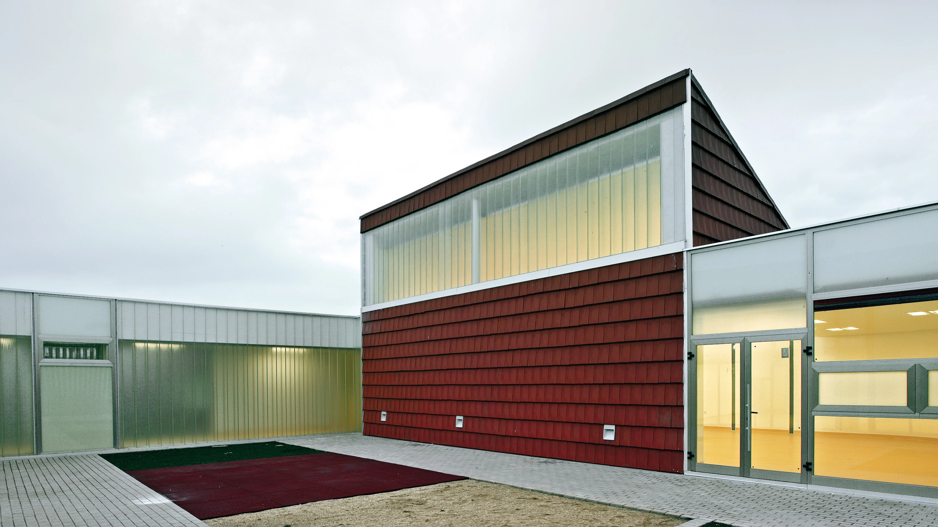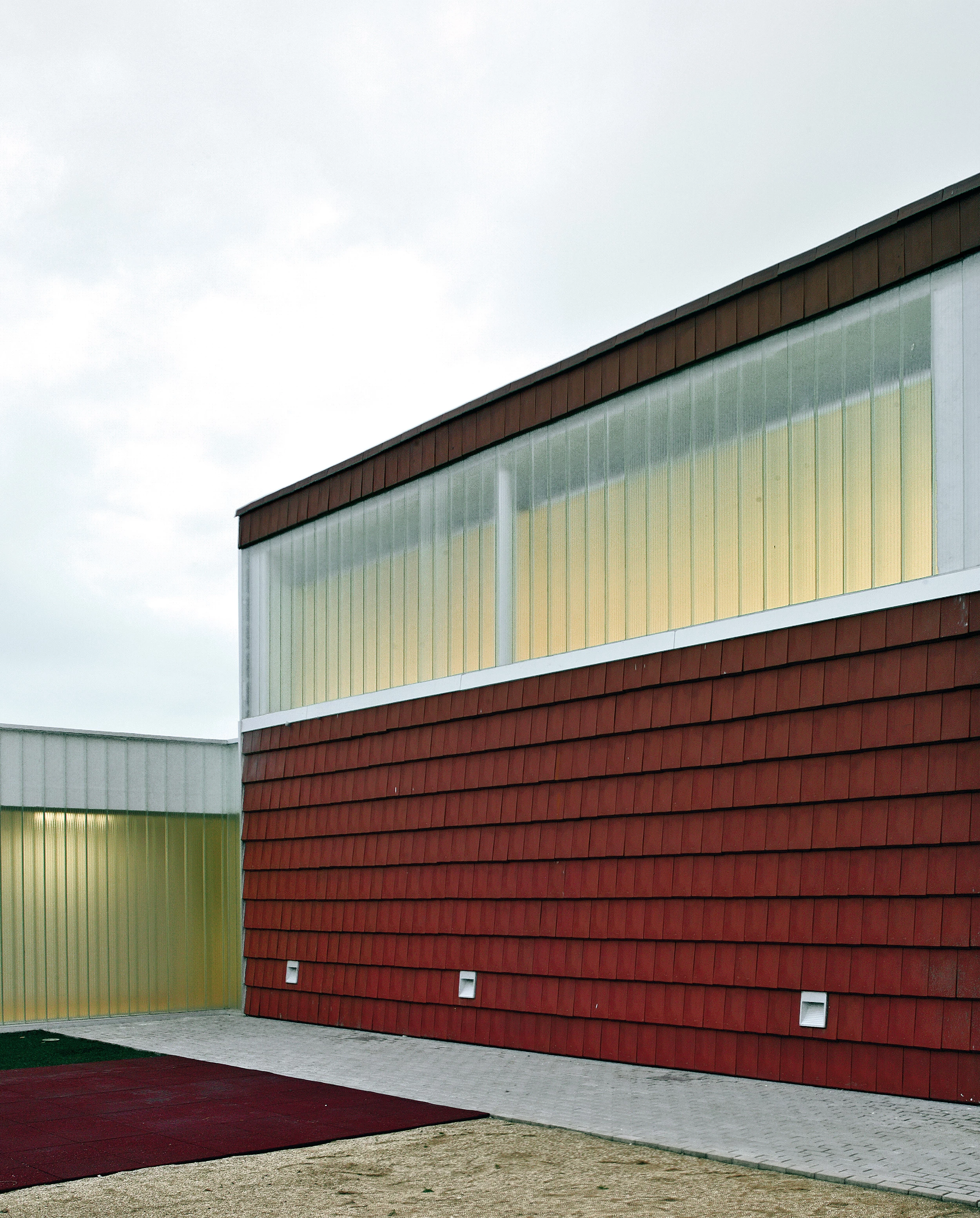 Dentro de recinto curvo se condensan los espacios de vida y de color del edificio, caracterizados por dos patios abiertos y dos espacios cerrados conectados por un corredor transparente, donde las cualidades ambiguas del vidrio y las concretas del barro cocido se hacen protagonistas. En cumplimiento de la ordenanza municipal se utiliza la teja cerámica plana como elemento característico en el acabado de las cubiertas, dos cubiertas singularizadas que se inclinan buscando la luz homogénea del norte y se cierran al extremado calor del sur, deslizando después su materialidad cerámica y sus sombras sobre los patios de juegos. Estos se cubren con un tapiz de colores de la zona (tierra roja, corteza de pino, praderas).
