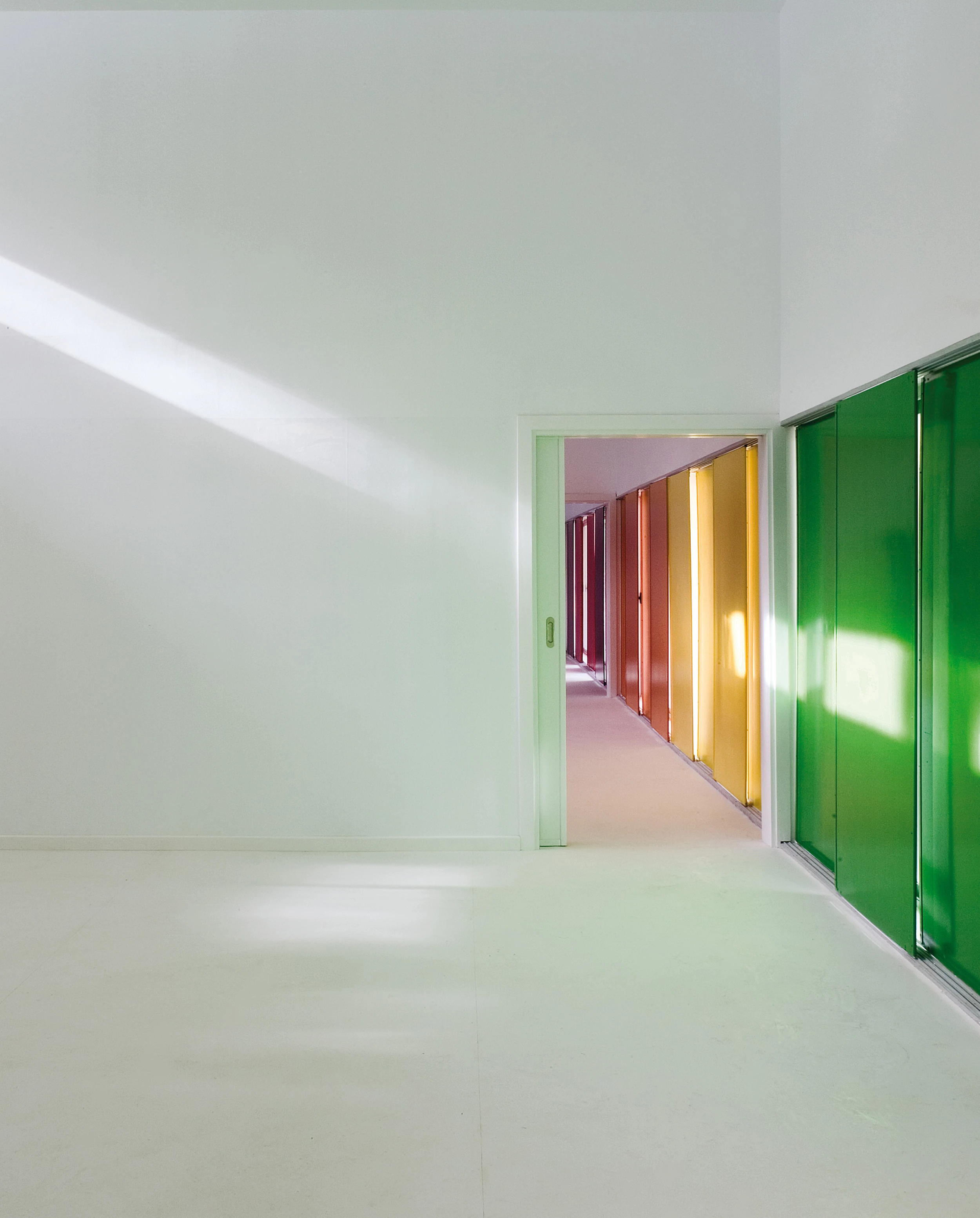 La decisión fundamental del proyecto ha sido aceptar anudarse a lo preexistente y desaparecer detrás del muro, con el reto de transformarlo sin destruirlo y procurar un espacio interior coherente y adecuado al programa. La fachada se recorta limpiamente para dar lugar a unos paneles de GRC lacados en colores, que se separan del muro para permitir un acceso tangencial al patio de espera de la guardería. La utilización del color pretende introducir una cierta vibración en lo preexistente y hacer patente el cambio de carácter que corresponde a su nuevo uso. El proyecto se ordena en bandas; de este a oeste se sitúan los espacios para el personal, oficinas y cocina, a continuación el corredor, rematado por un patio, la banda de aseos y las aulas. Las aulas se caracterizan por contar con doble iluminación, ventanas altas por donde entra el sol de la mañana filtrado en verano por las hojas de los árboles de la ribera del Beiro y una cristalera corrida al oeste, protegida por una marquesina de hormigón y abierta a un jardín de albero. El comedor de empleados municipales cuenta con acceso independiente y se vincula al jardín para permitir que pueda instalarse durante algunos meses al año un servicio de mesas al aire libre.