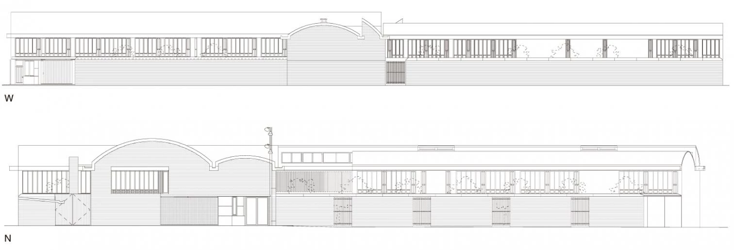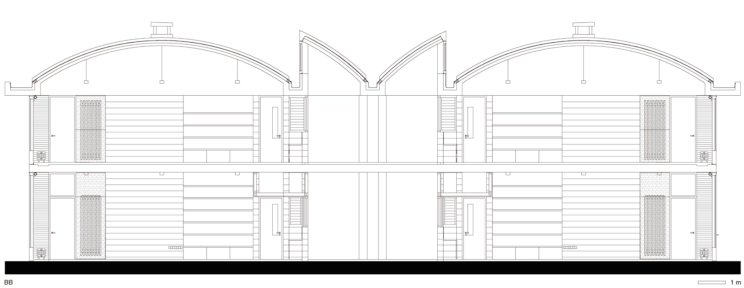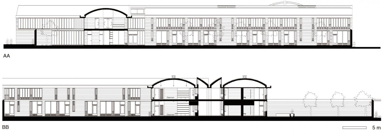 Las aulas se iluminan mediante ventanas que se abren hacia los patios; mientras que los espacios de distribución del nivel superior cuentan con lucernarios curvos que introducen luz natural difusa. Los canalones intermedios actúan además como elementos estructurales que reciben la carga de las bóvedas y la transmiten a los pilares circulares. Por su parte, los canalones perimetrales arrojan sombra sobre la fachada y sirven de parapeto para impedir el acceso a la cubierta.