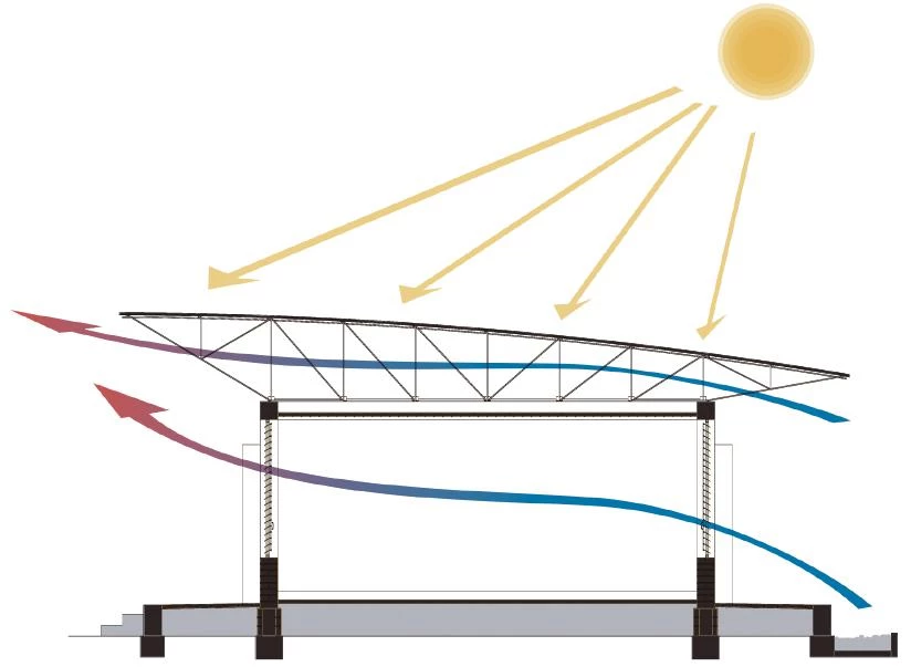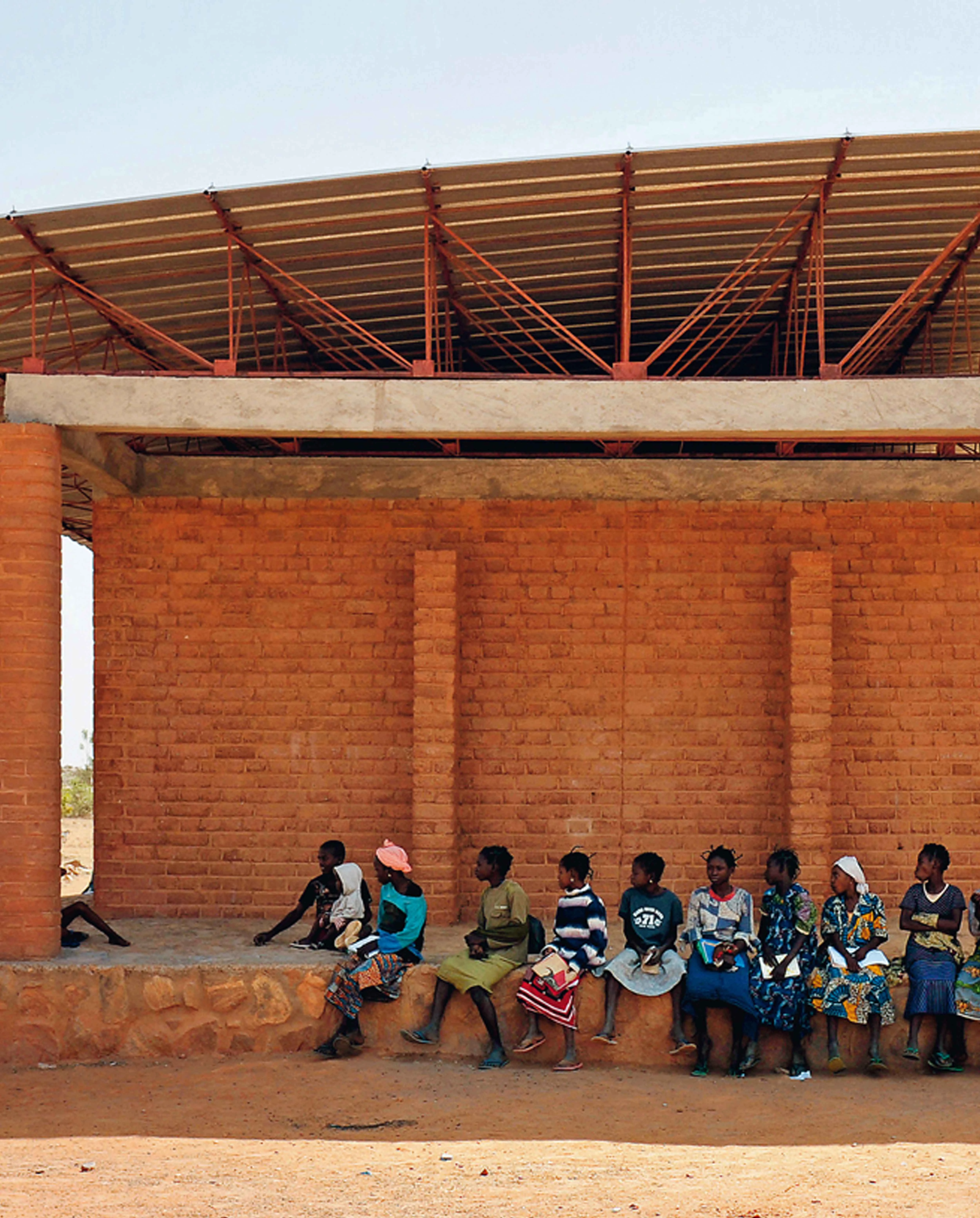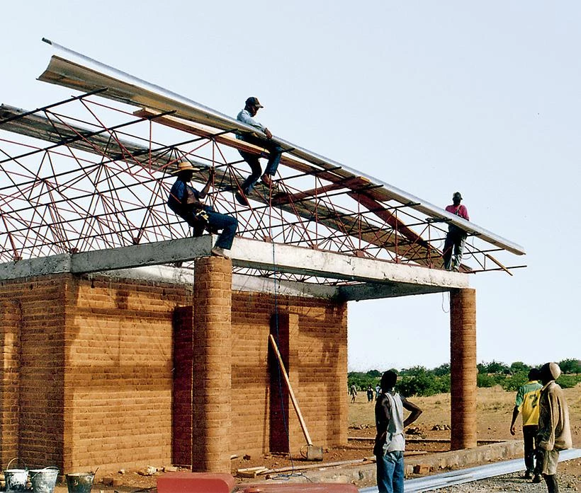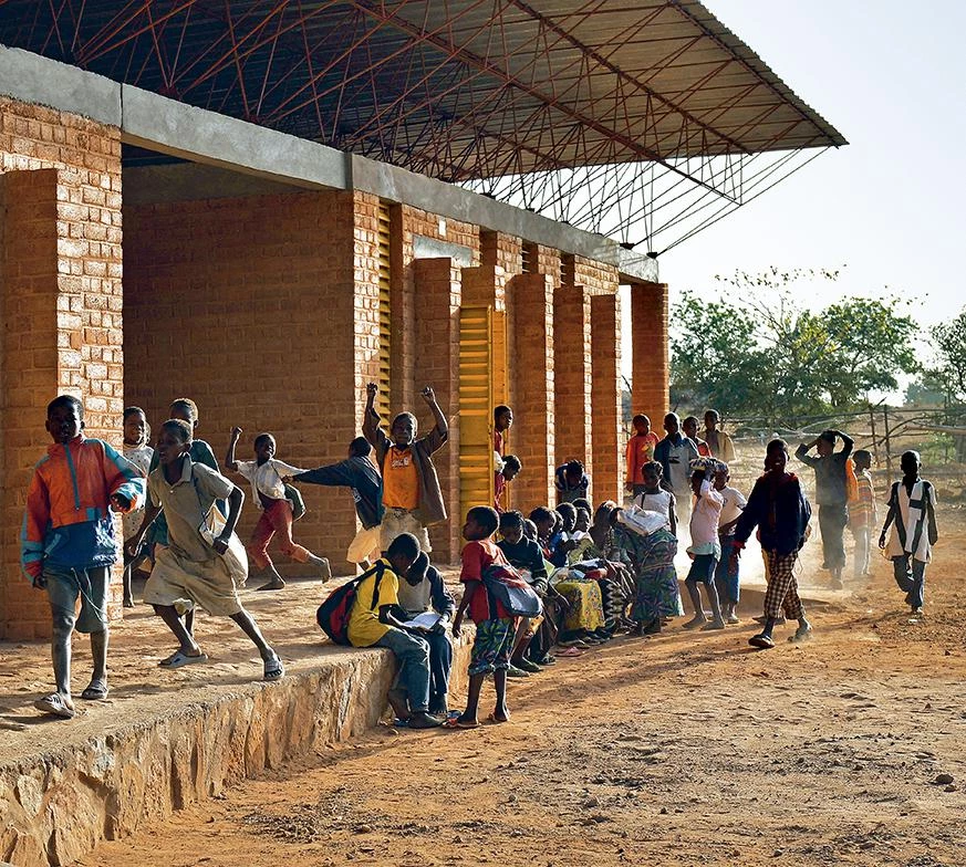 Con una población de 3.000 habitantes, Gando es una pequeña aldea en las planicies meridionales de Burkina Faso situada a 200 kilómetros de Uagadugú, la capital del país. En el año 1998, Francis Kéré impulsó la construcción de una escuela, convencido de que la educación era la primera piedra para el desarrollo personal y económico de los habitantes de su pueblo natal. Tres módulos rectangulares unidos por una única cubierta componen la estructura básica del edificio. Cada uno de ellos alberga un aula para cincuenta alumnos. El techo y las paredes los forman ladrillos de arcilla, fabricados in situ por los vecinos, los verdaderos protagonistas de la construcción del edificio. Por encima del techo de arcilla se eleva una cubierta de zinc que se despega de éste mediante una cercha de acero. La separación entre las dos piezas establece un espacio de ventilación, evitando el sobrecalentamiento de las aulas.