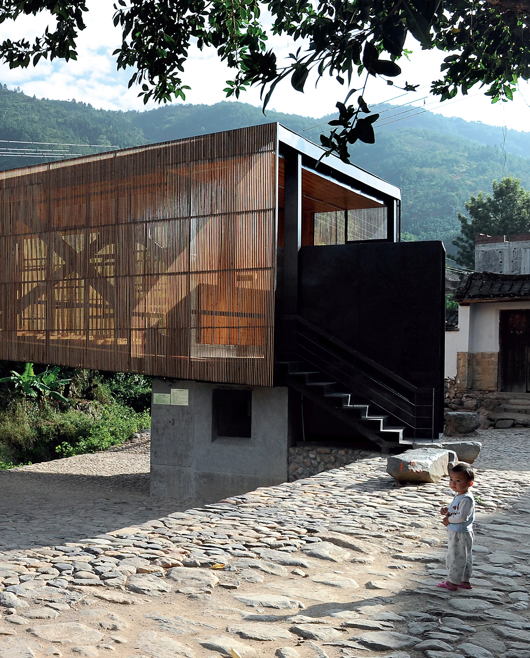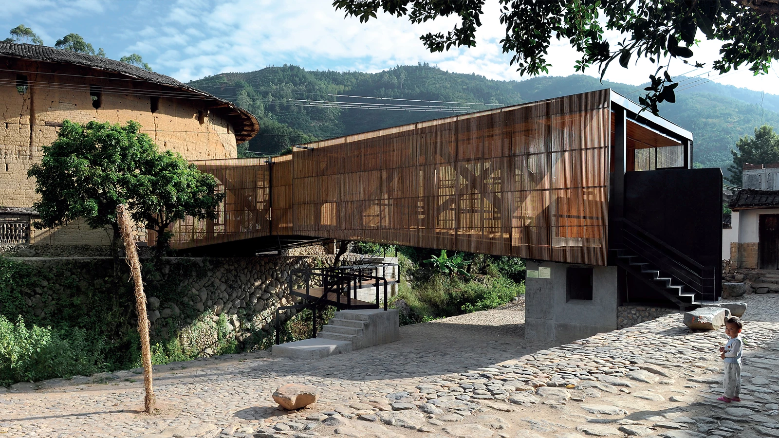 Una estructura metálica ligera anclada con tirantes de acero y apoyada sobre una sólida cimentación de hormigón actúa al mismo tiempo como un puente, una pequeña escuela y un centro social para los habitantes de la localidad.