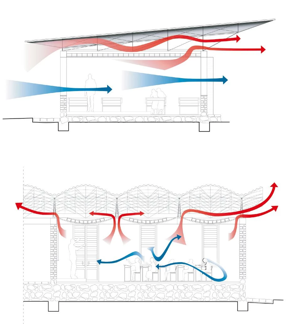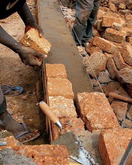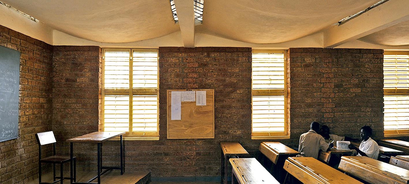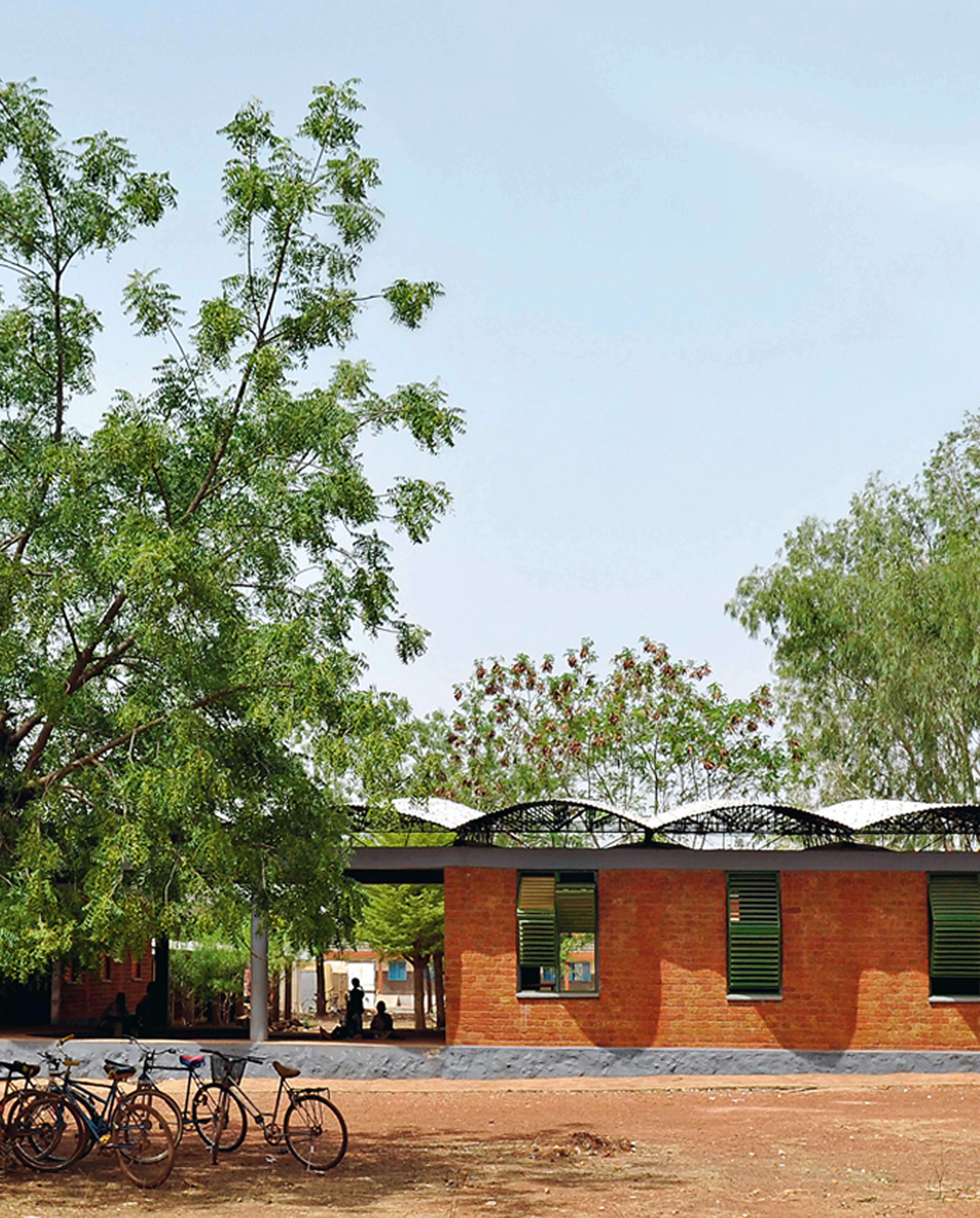 Sobre una base de granito, que protege la estructura de la erosión, los muros se construyen con bloques de laterita de treinta centímetros de grosor. Este material, abundante en la región, se caracteriza por sus propiedades térmicas y su fácil extracción. Para controlar la radiación solar en las paredes, el volumen con forma de L se orienta a largo del eje este-oeste. Con este mismo propósito, la cubierta ondulada avanza en voladizo y arroja sombra sobre los muros. La ventilación natural, por su parte, se consigue a través de un falso techo permeable y contraventanas de lamas. El edificio consta de tres aulas y una sala de ordenadores adosada a un espacio de oficinas. También cuenta con un anfiteatro cubierto que además sirve como espacio de descanso durante la pausa entre las clases.