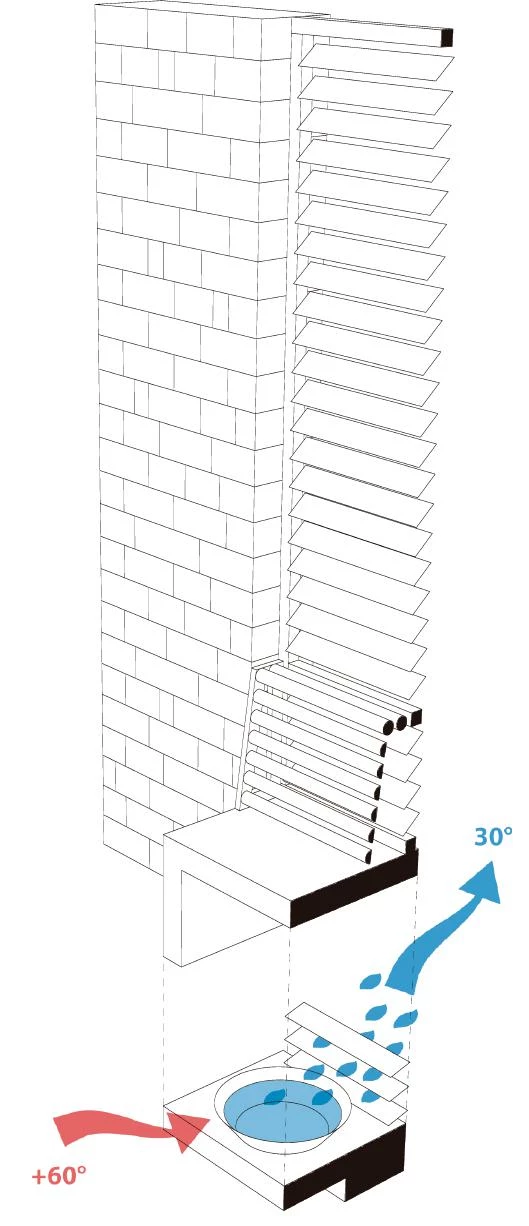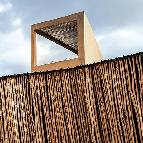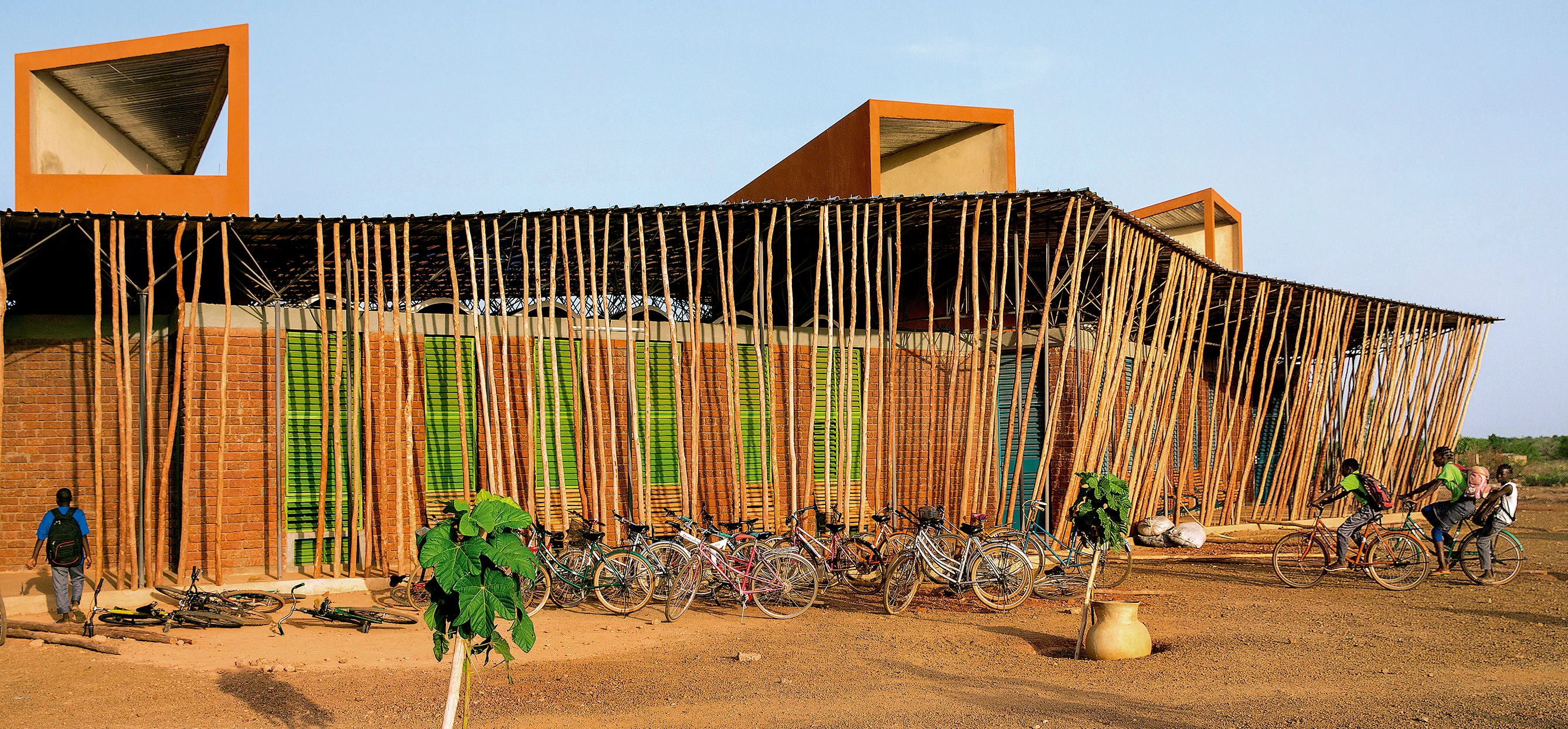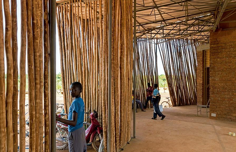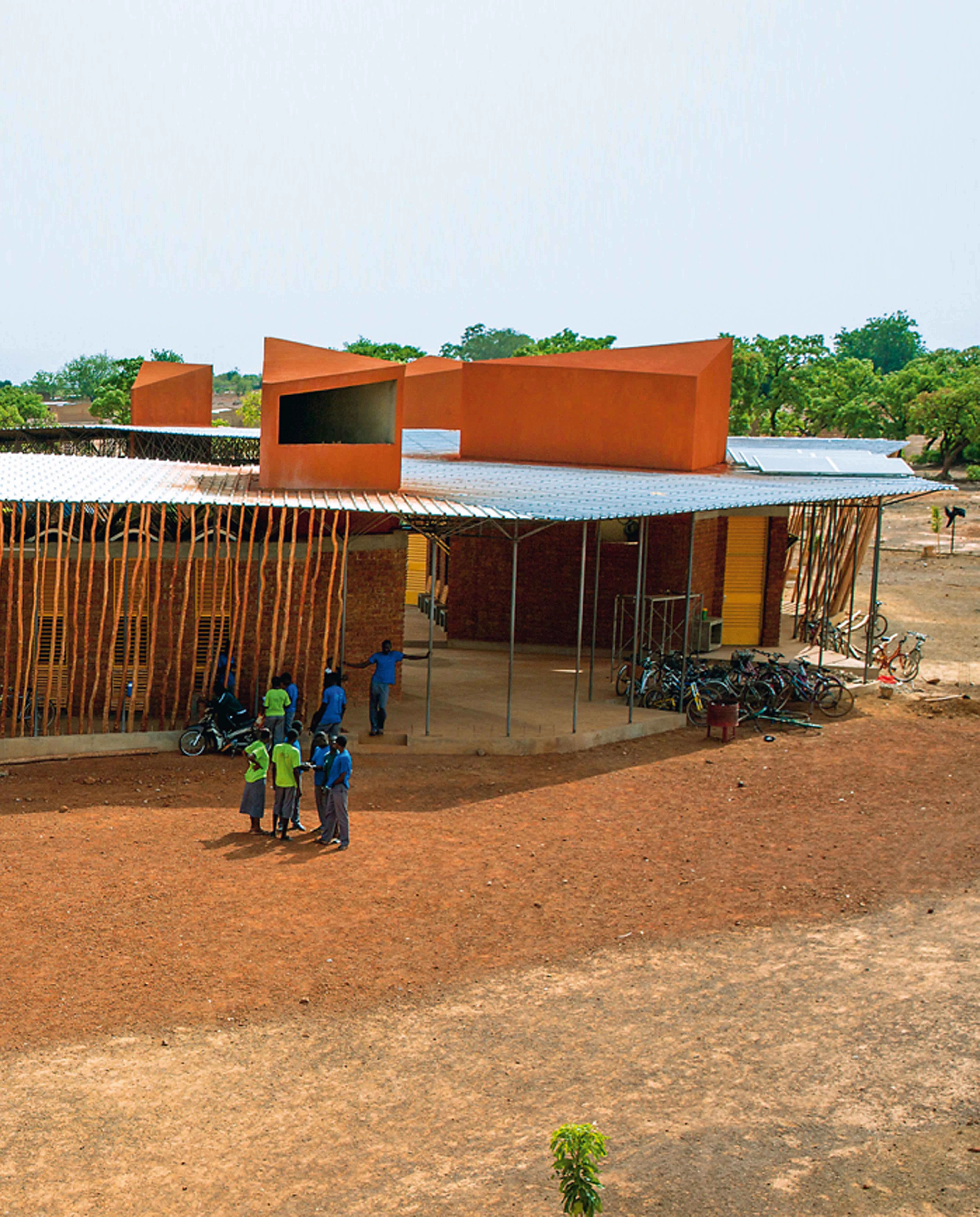 Desde el punto de vista tipológico, el instituto adopta la forma de una ‘aldea’ cerrada sobre sí misma. Las clases, protegidas por una celosía perimetral, se disponen en torno a un espacio que funciona como patio central, comunitario y representativo. Esta organización resuena con los materiales y las soluciones constructivas empleadas. Las aulas están levantadas con muros de laterita, una piedra arenisca extraída de canteras locales que puede tallarse sin dificultad antes de endurecerse al entrar en contacto con el aire. Por su parte, el cerramiento exterior se resuelve con una empalizada de madera que, al tiempo que sombrea los muros, genera una agradable calle protegida. El conjunto se remata con una cubierta de chapa separada del techo de hormigón para crear una cámara ventilada que disipa en buena medida la radiación incidente. El efecto bioclimático conseguido a través de los muros, la celosía y la cubierta se complementa con las grandes chimeneas que emergen de la ‘aldea’ para inducir de manera pasiva la ventilación natural.