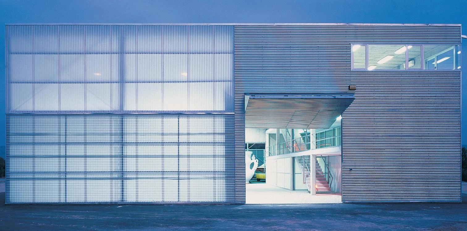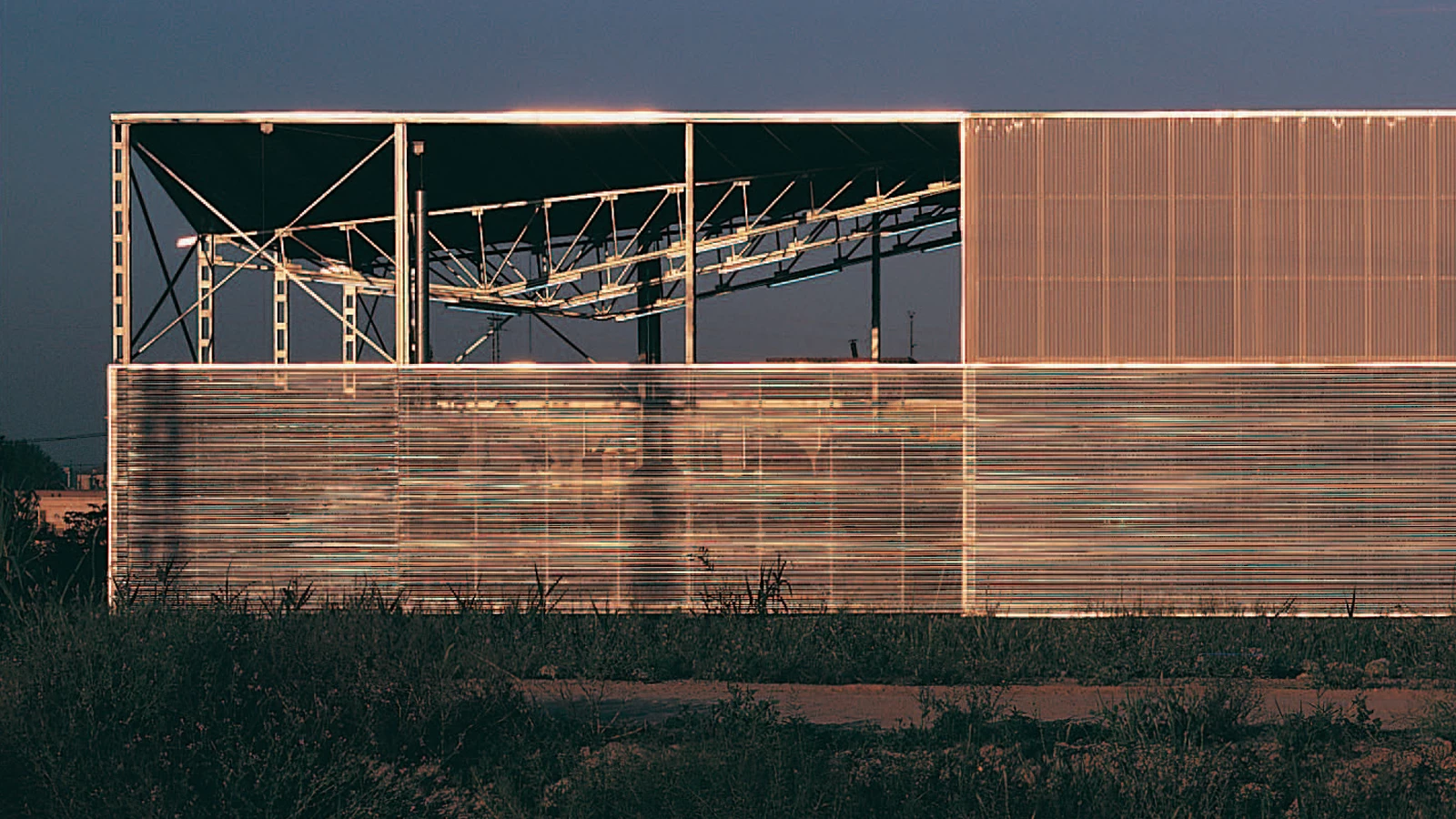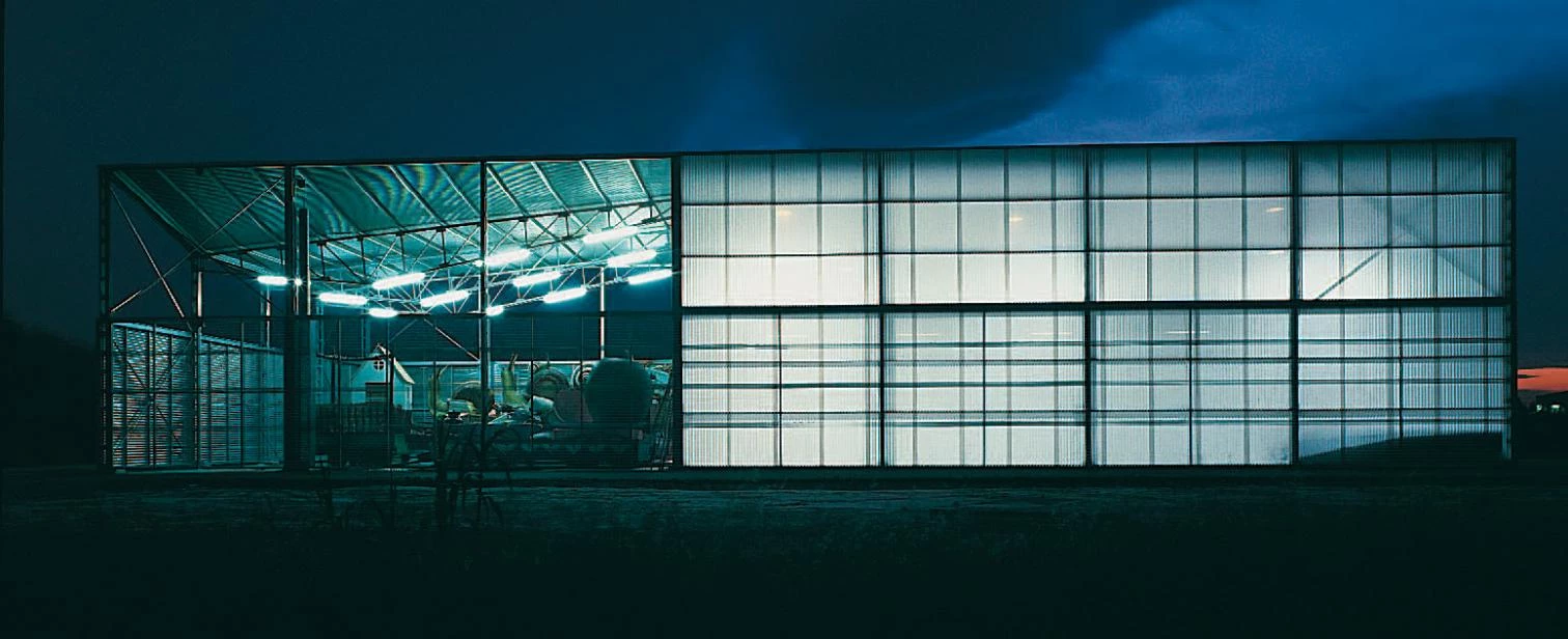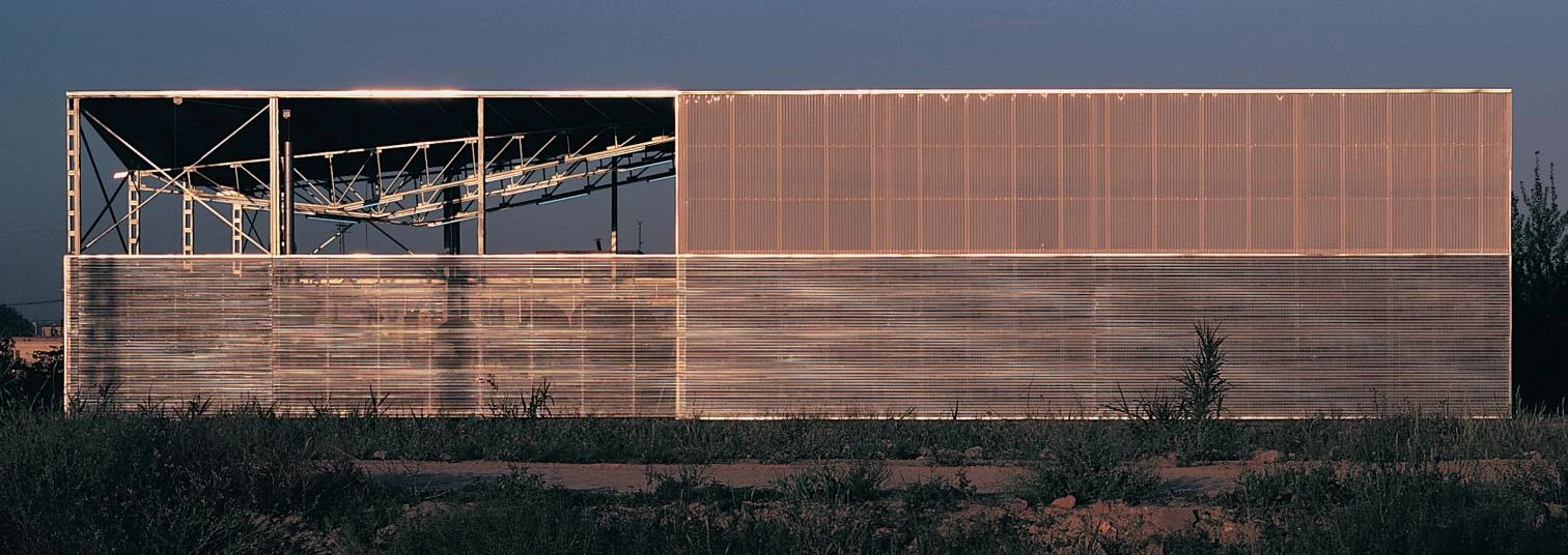 Ante la imposibilidad de ocultar el gran volumen del taller en la llanura de huertas y campos de cultivo, se intenta desdibujar su envolvente en un juego de reflejos, brillos y colores ambiguos. La gran nave de trabajo, el porche de almacenaje de carrozas y una galería de tres alturas —que alberga las oficinas y una sala de exposiciones— se agrupan así en un paralelepípedo único que responde a las exigencias específicas de cada uso con pieles de distinta transparencia. La retícula ortogonal formada por los pilares metálicos que sustentan la cubierta y la subestructura de fachada se trasdosa alternativamente con chapa minionda de aluminio, chapa microperforada del mismo material y placas estriadas de policarbonato translúcido. Superpuestos en distinta combinación, estos paneles transforman la envolvente en un fanal irisado sobre el que las formas caprichosas de las carrozas se proyectan como sombras chinescas.