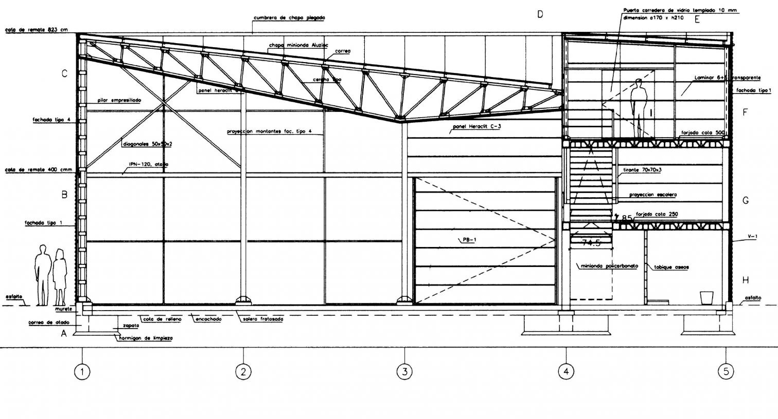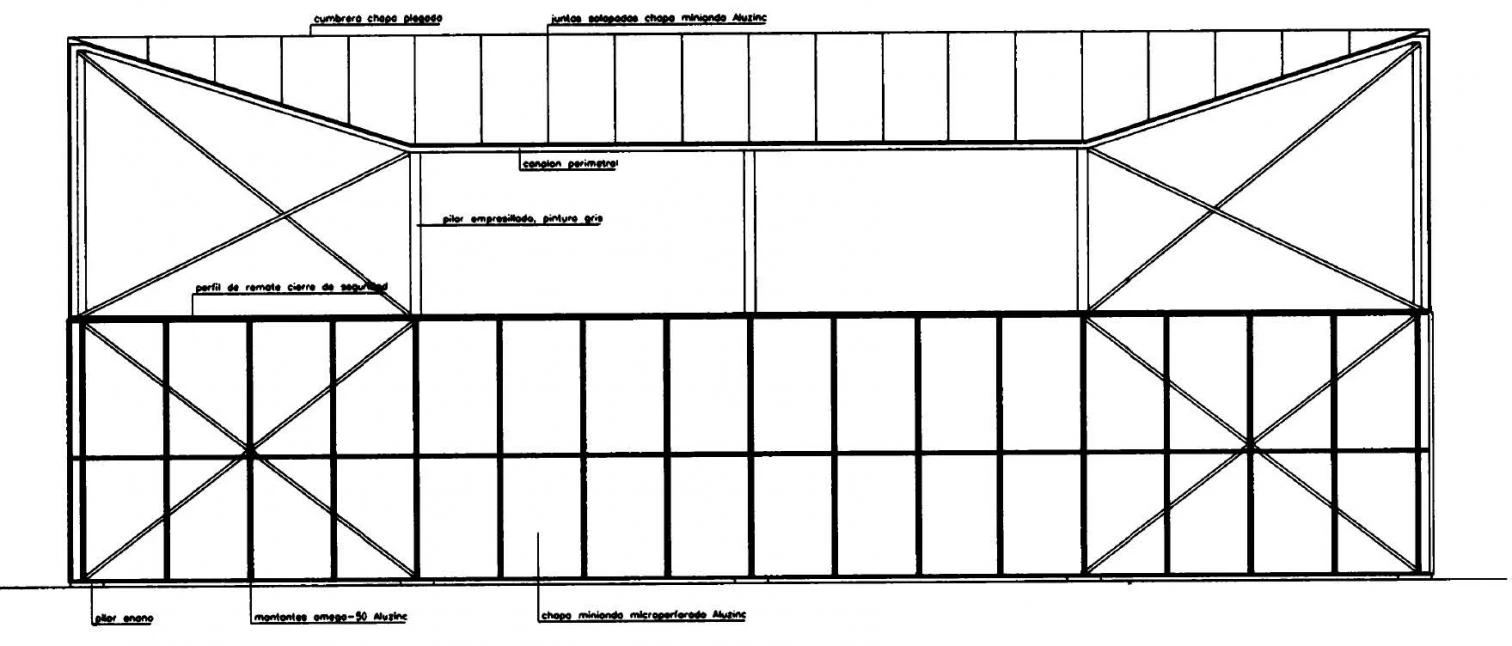 Al interior, cada ámbito adquiere independencia espacial mediante la distinta configuración de la cubierta. Una misma viga de celosía triangulada cubre las grandes luces del taller y el almacén dispuesta en distinta dirección para contribuir al arriostramiento de la estructura. Su perfil quebrado queda visto en el porche semiabierto que sirve de almacén y oculto sobre el área de trabajo, tras el falso techo de placas de fibra mineralizada que, siguiendo el trazado de un conoide curvo, evita la resonancia acústica y la reverberación sonora frecuentes en los espacios de gran volumen. En la crujía de oficinas, de menor luz, se recurre a forjados convencionales. En una renuncia explícita a todo énfasis constructivo, la estructura queda embebida entre los paneles de cerramiento, procurando desde la modulación y el uso de soluciones de catálogo una adaptación no forzada de los materiales utilizados.