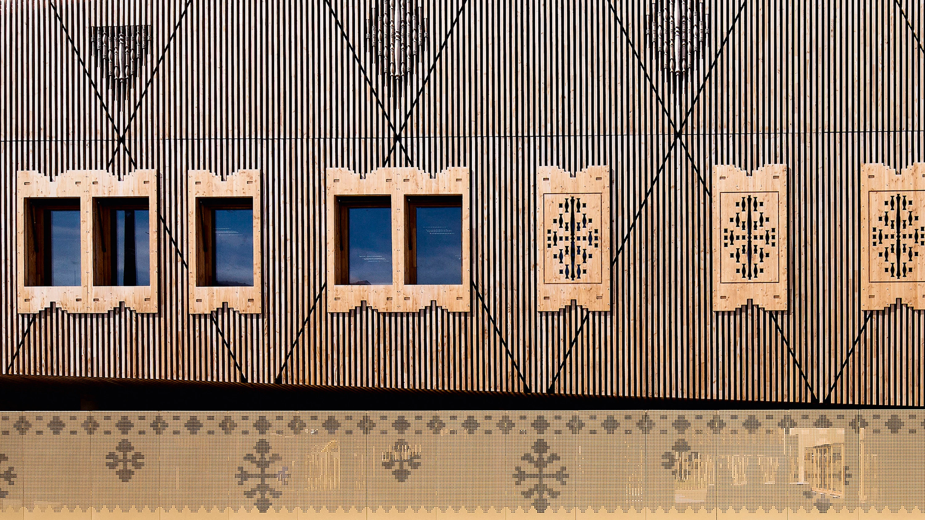 Apoyada visualmente sobre este zócalo se despliega una trama densa de listones de madera de alerce de 60 x 40 milímetros fijados a una subestructura de perfiles metálicos en Z, y rigidizados por diagonales, entre las cuales se disponen rítmicamente una serie de motivos caligráficos ornamentados, resultado de ahusar los listones de la celosía como si estuvieran tallados por el torno de un ebanista. La decoración también está presente en los huecos de la fachada: la carpintería de madera se atornilla contra un premarco del mismo material, rematándose exteriormente con un jambeado y un marco de madera de pino Douglas calado con un motivo de filigrana de ebanista semejante al de la celosía y el zócalo.