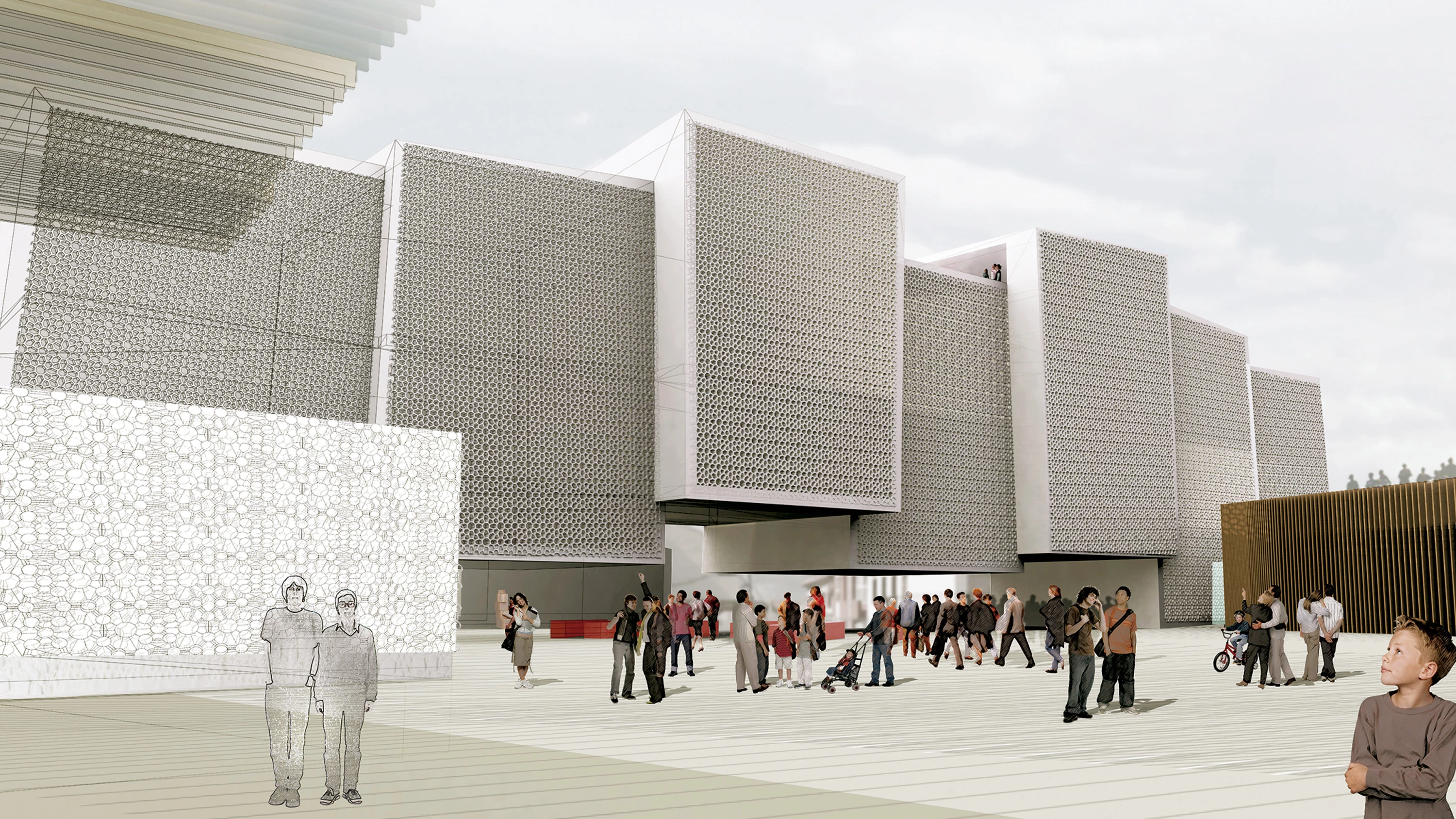 El auditorio tiene una caja escénica reversible. La biblioteca, revestida con hormigón blanco prefabricado, se horada en su fachada sur con una celosía. El frente de los pabellones hacia la plaza es de madera…[+]