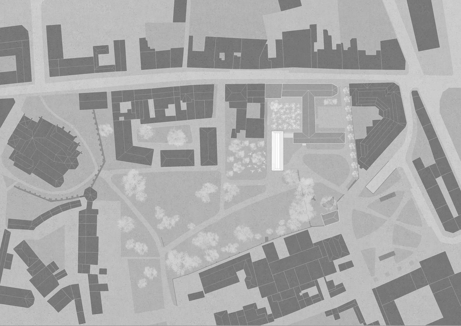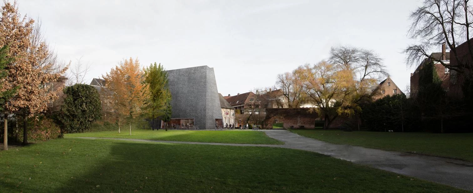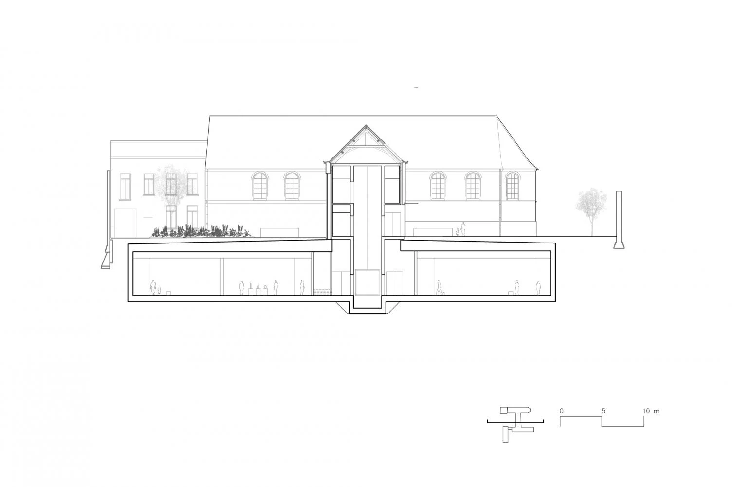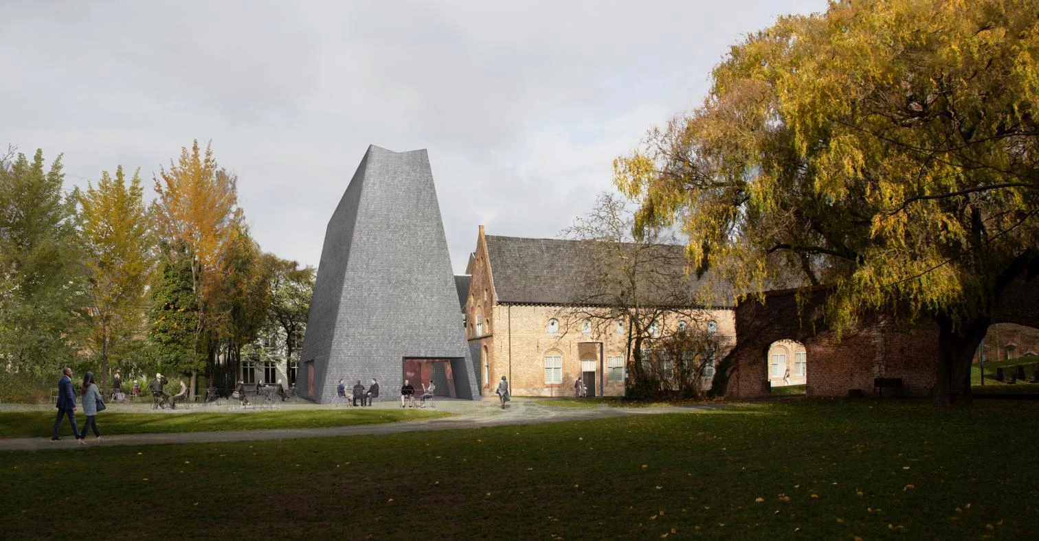 Basado en una interpretación amplia de la identidad, el proyecto consiste en la extensión y transformación del complejo histórico de la abadía de Groeninge en un espacio artístico para exposiciones temporales y eventos públicos. Como punto de partida, el proyecto persigue crear un nuevo tipo de museo: un lugar abierto a para todos usuarios, versátil, un espacio de vida urbano rodeado por el idílico el parque Begijnhof, situado en el centro de la ciudad. En primer lugar, la propuesta busca recuperar y poner en valor la espacialidad de la estructura original de la capilla y de los dormitorios de la abadía. A continuación, se agrega un espacio subterráneo destinado a exposiciones y se restaura el antiguo patio, insertando un nuevo jardín. Pero quizá, de todas las intervenciones la más visible sea la construcción de un nuevo pabellón del parque. Se trata de un edificio compacto y discreto cuyo diseño está basado en el diálogo con las estructuras históricas que lo rodean: tanto a través de su forma, una pirámide truncada que evoca la verticalidad de las cubiertas inclinadas circundantes, como de su disposición ortogonal respecto del complejo existente. A nivel material, la fachada del nuevo volumen se reviste con piezas de ladrillo de color oscuro que le confiere un imagen independiente dentro del conjunto.