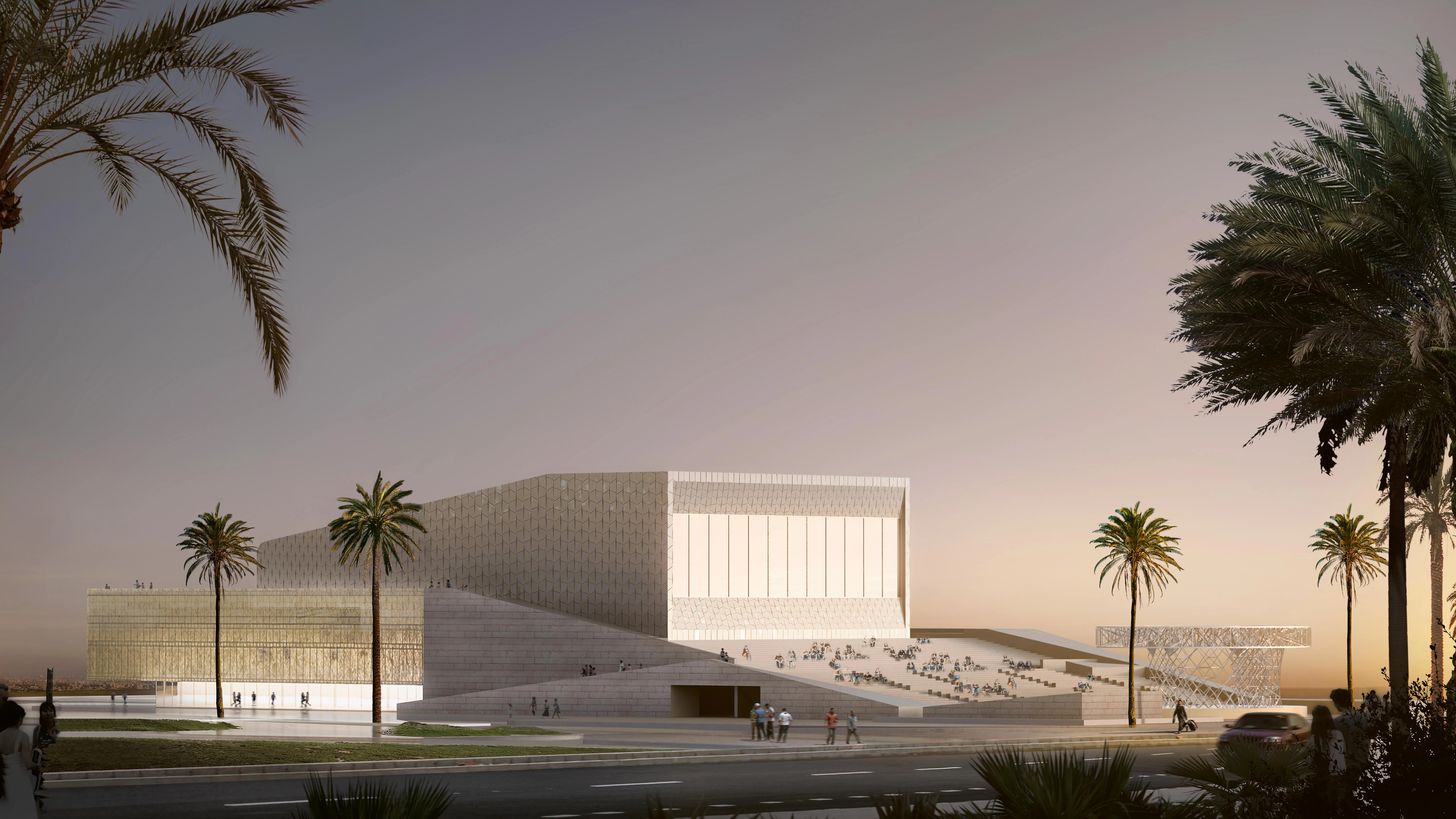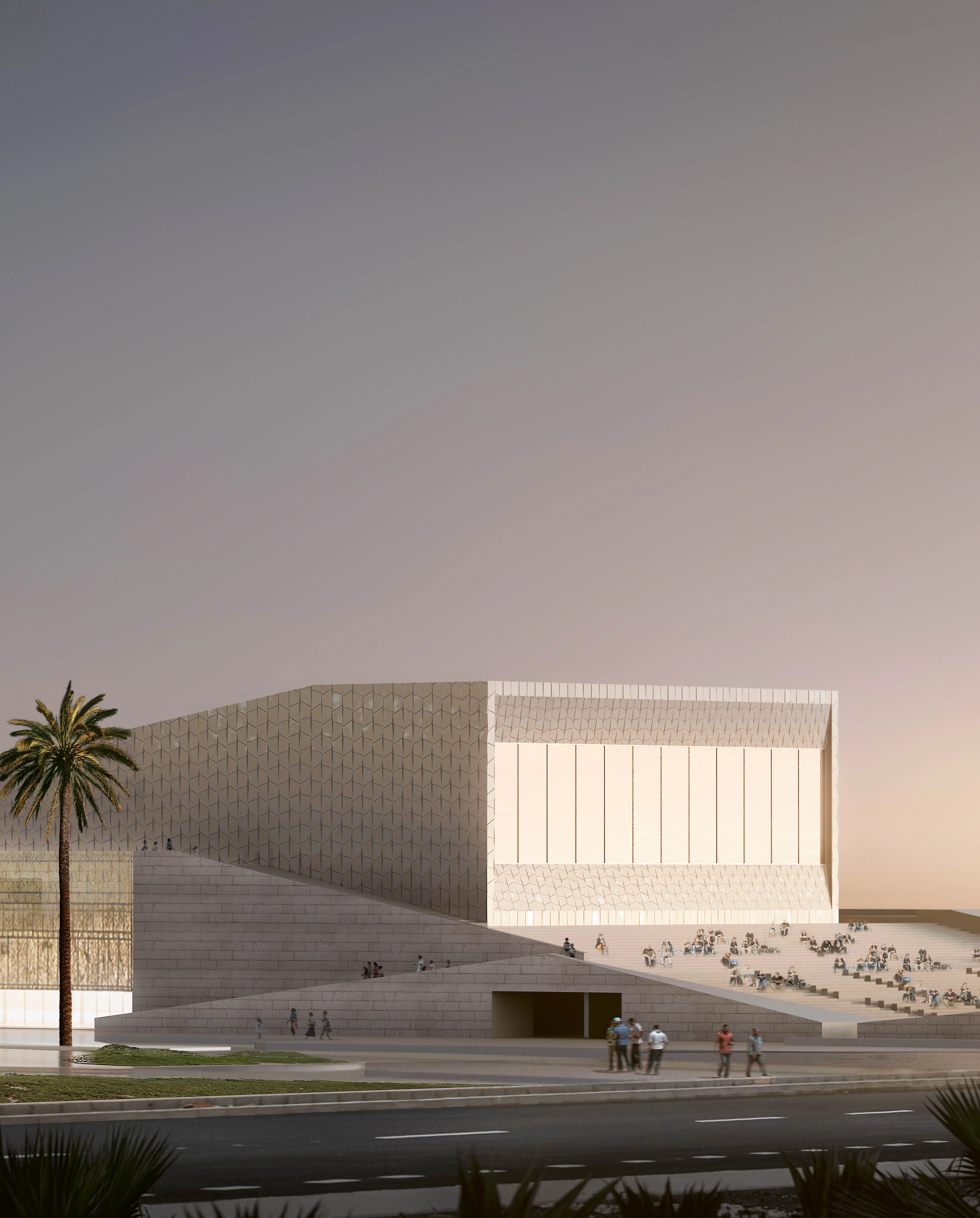 Envuelto en una piel de ónice traslúcido, el edificio del Gran Teatro se alzará ante una extensa plaza que se prolongará en su parte posterior en forma de graderío al aire libre frente a un escenario que ya exhibe su afán de hito...[+]