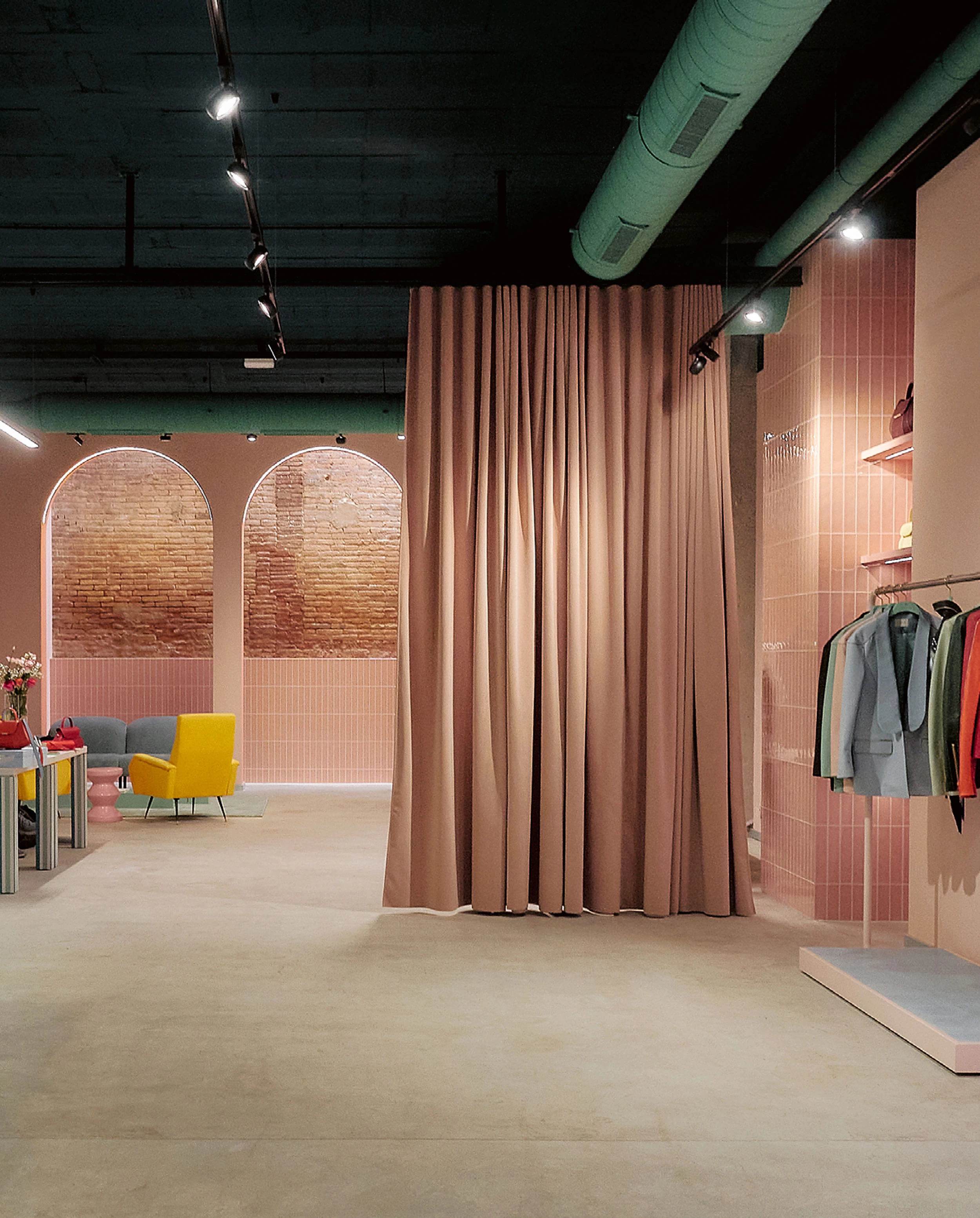 Al espacio, que conserva las paredes originales, se le añaden ‘capas’ de materiales industriales —aluminio y hormigón— enfrentadas a texturas elegantes y teatrales en una atmósfera de tonos pastel que toma la curva como elemento plástico...[+]