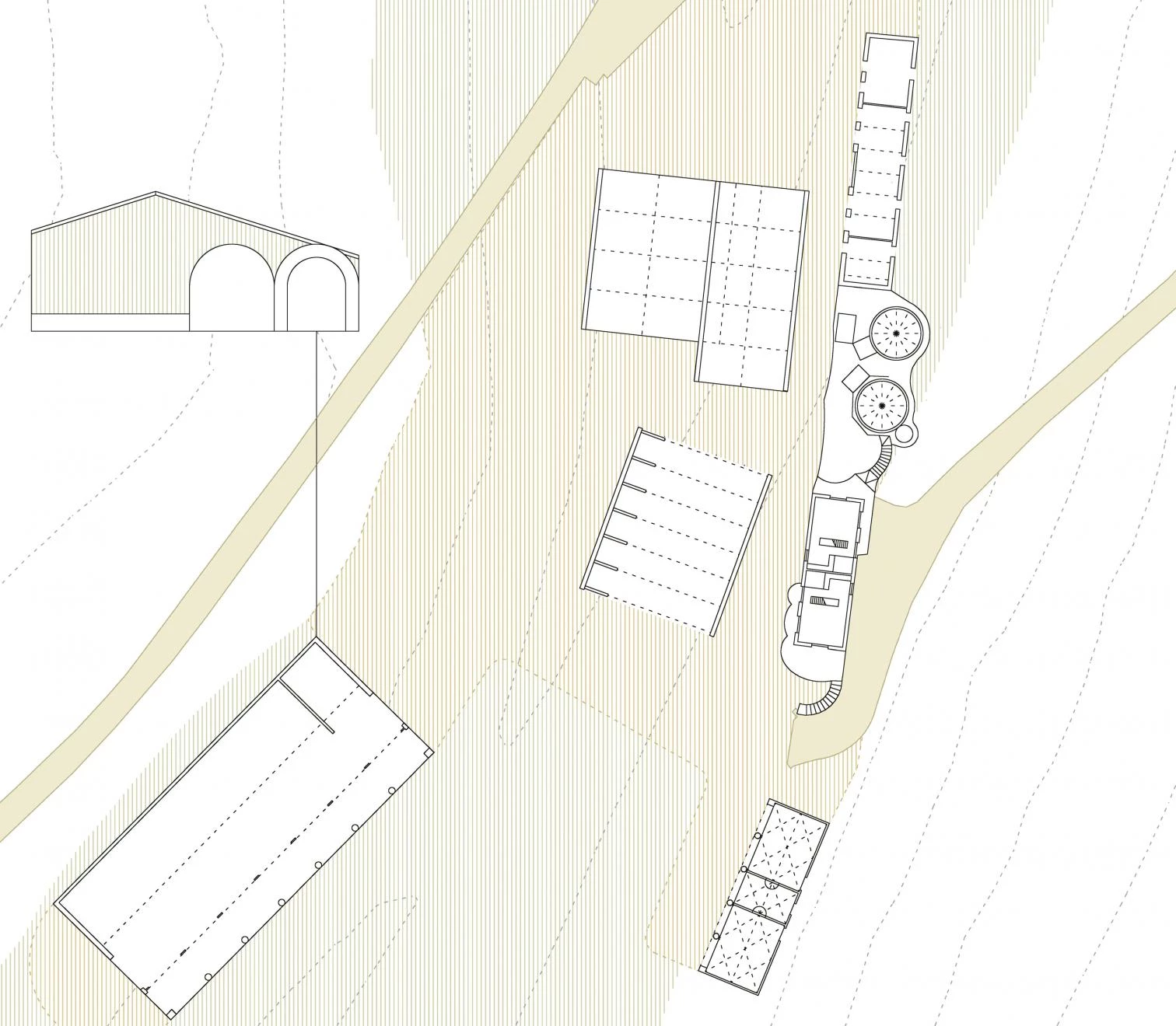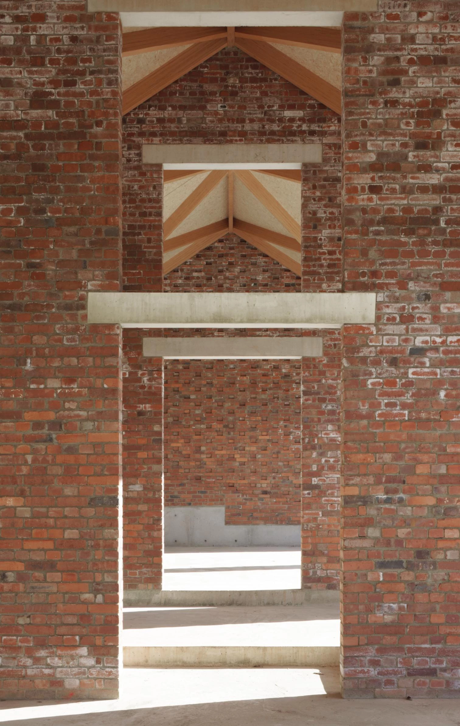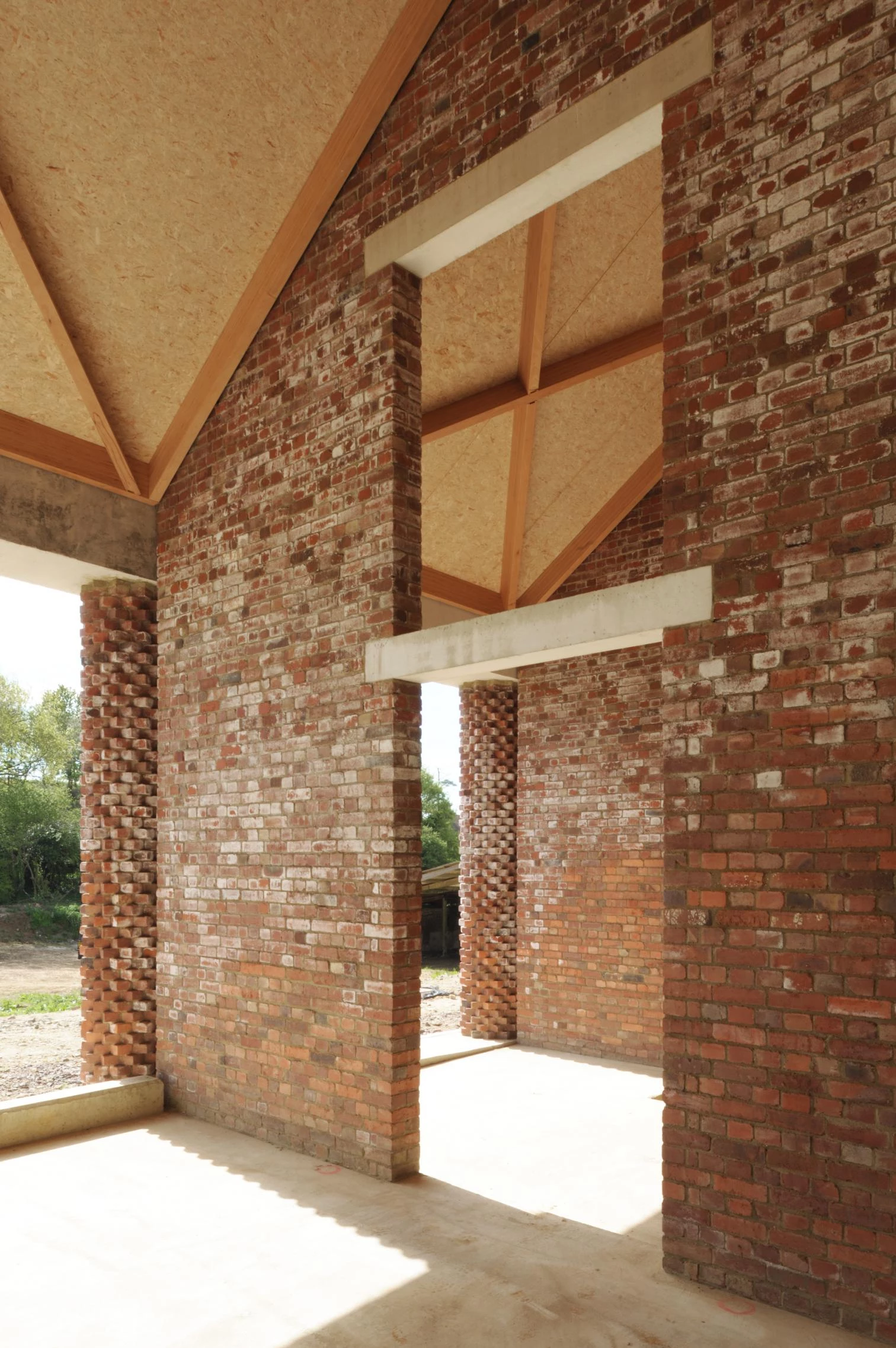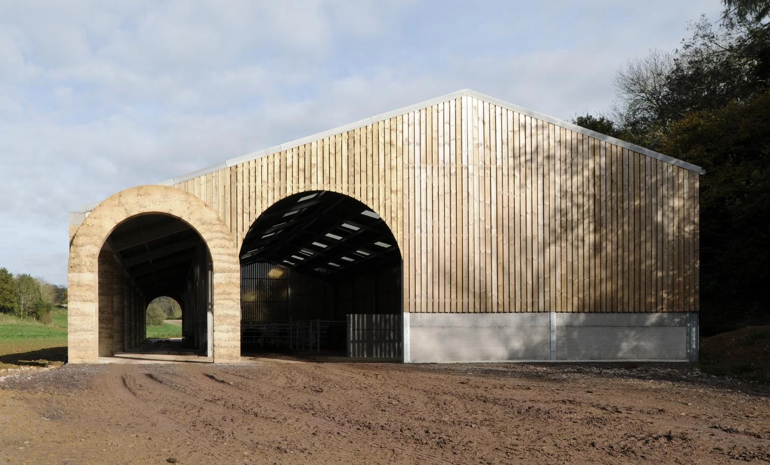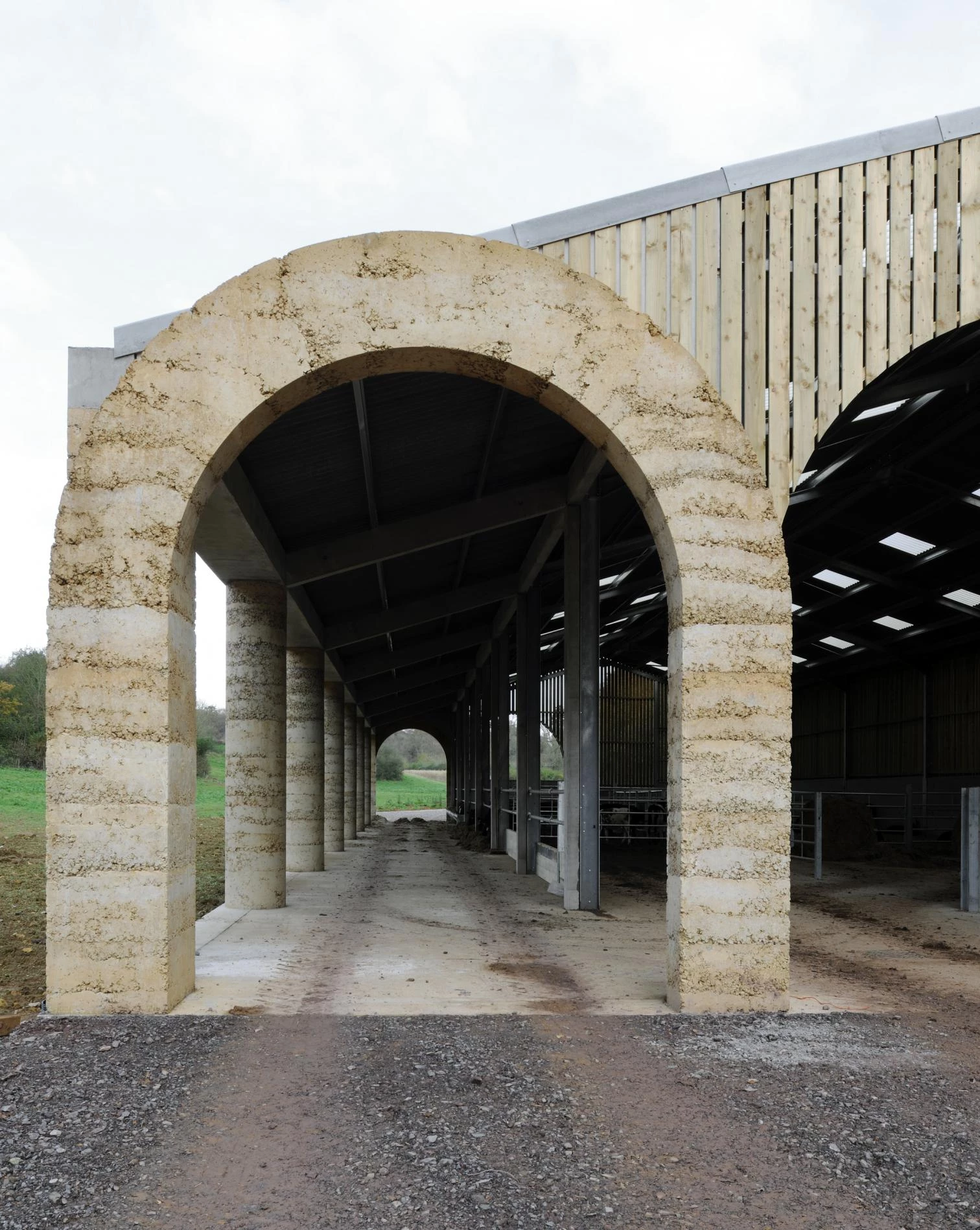 Inspirada en las barchesse, construcciones agrícolas auxiliares de las villas palladianas, la columnata donde se apacienta el ganado se elabora con un hormigón áspero en el que se agrega como árido piedra de extracción local.