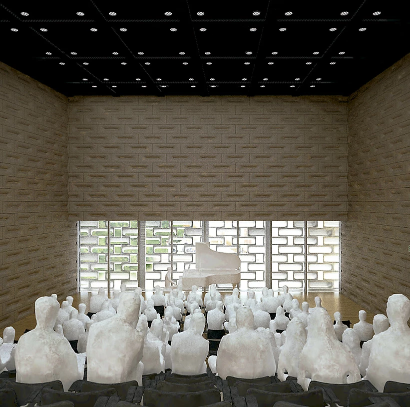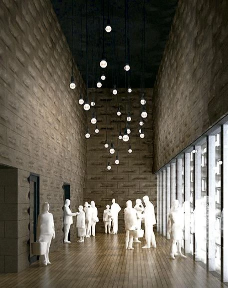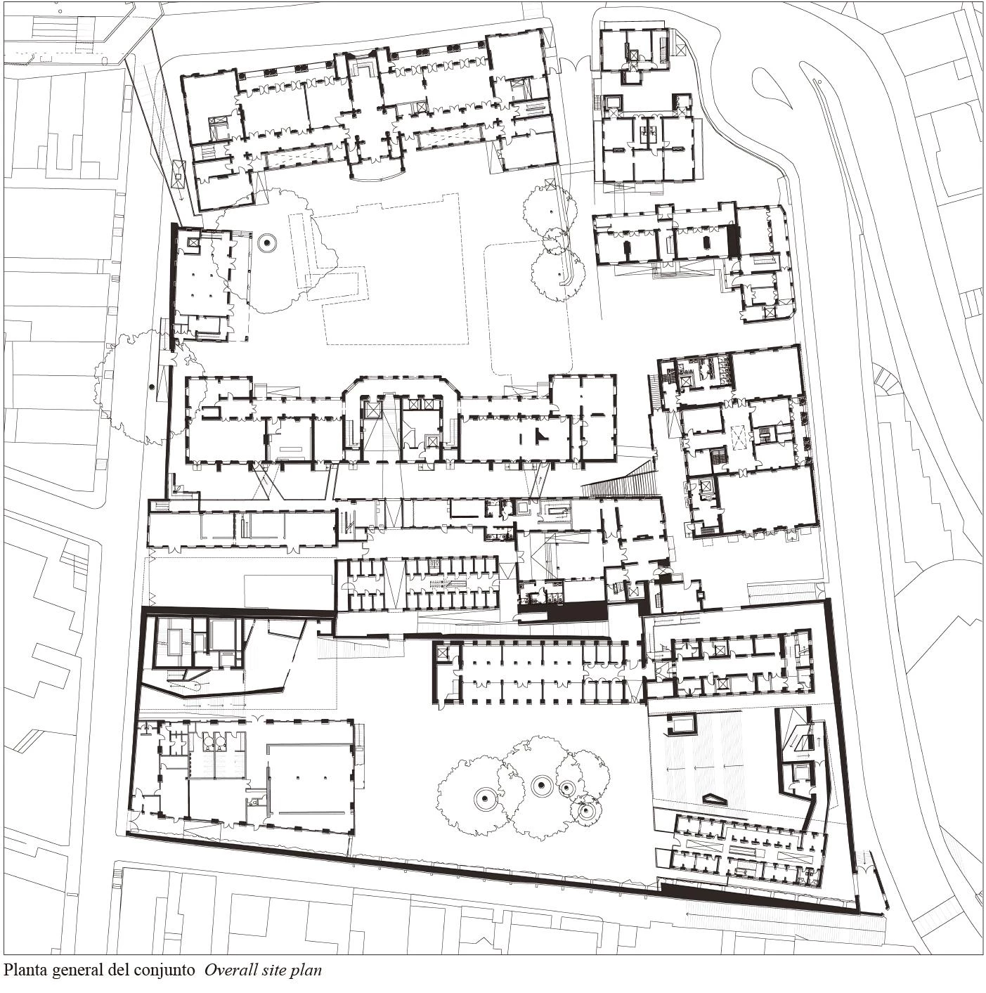 La rehabilitación de los edificios preexistentes conserva sus características singulares, adaptando los espacios interiores a los futuros usos públicos. Solo dos volúmenes cúbicos de nueva planta se construyen enfrentados en el patio de la prisión para compensar la construcción perimetral y configurar el espacio abierto como escenario de actuaciones al aire libre. Los nuevos edificios se levantan del suelo y lo dejan libre para crear grandes escaleras de acceso al patio, que informalmente servirán también de graderíos. Uno de ellos alberga galerías para un museo, mientras el otro contiene una sala multiusos abierta hacia el patio y sobre ella una gran sala técnica que concentra instalaciones para todo el recinto. El cerramiento de estos sencillos volúmenes se lleva a cabo con un sistema de agregación de unidades de aluminio fundido. Las piezas tienen unas proporciones basadas en los mampuestos originales del muro exterior, y con una gama de cuatro tipos se adaptan a los diferentes requerimientos estructurales y climáticos del lugar.