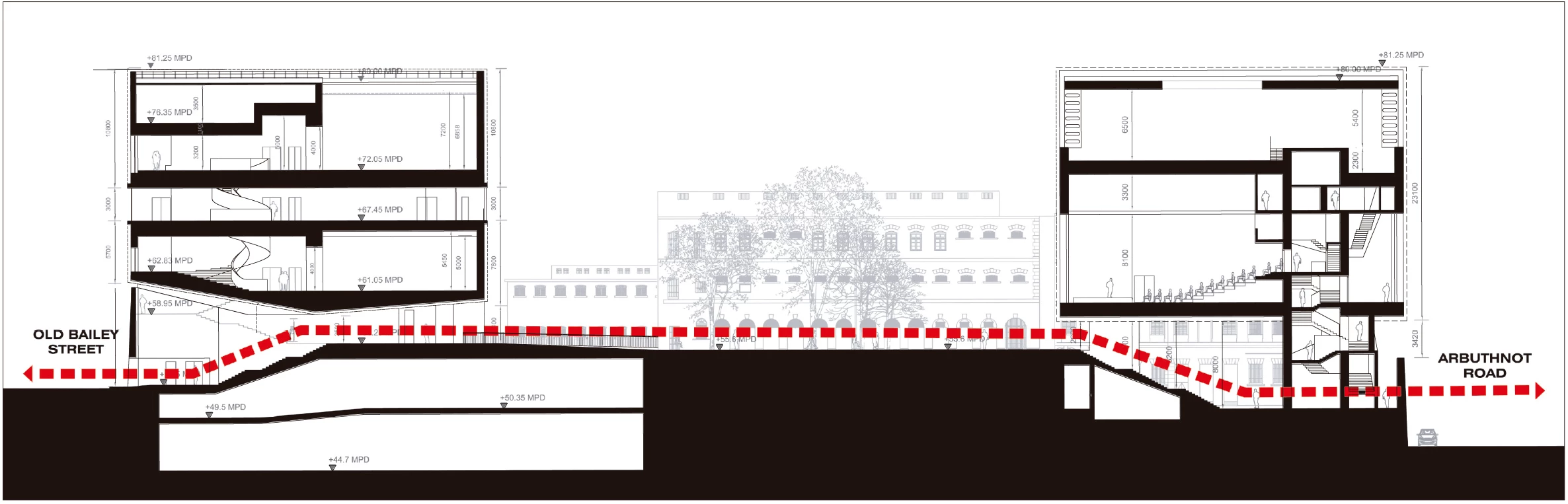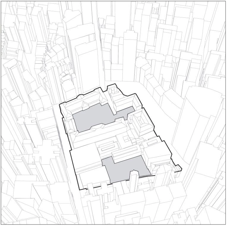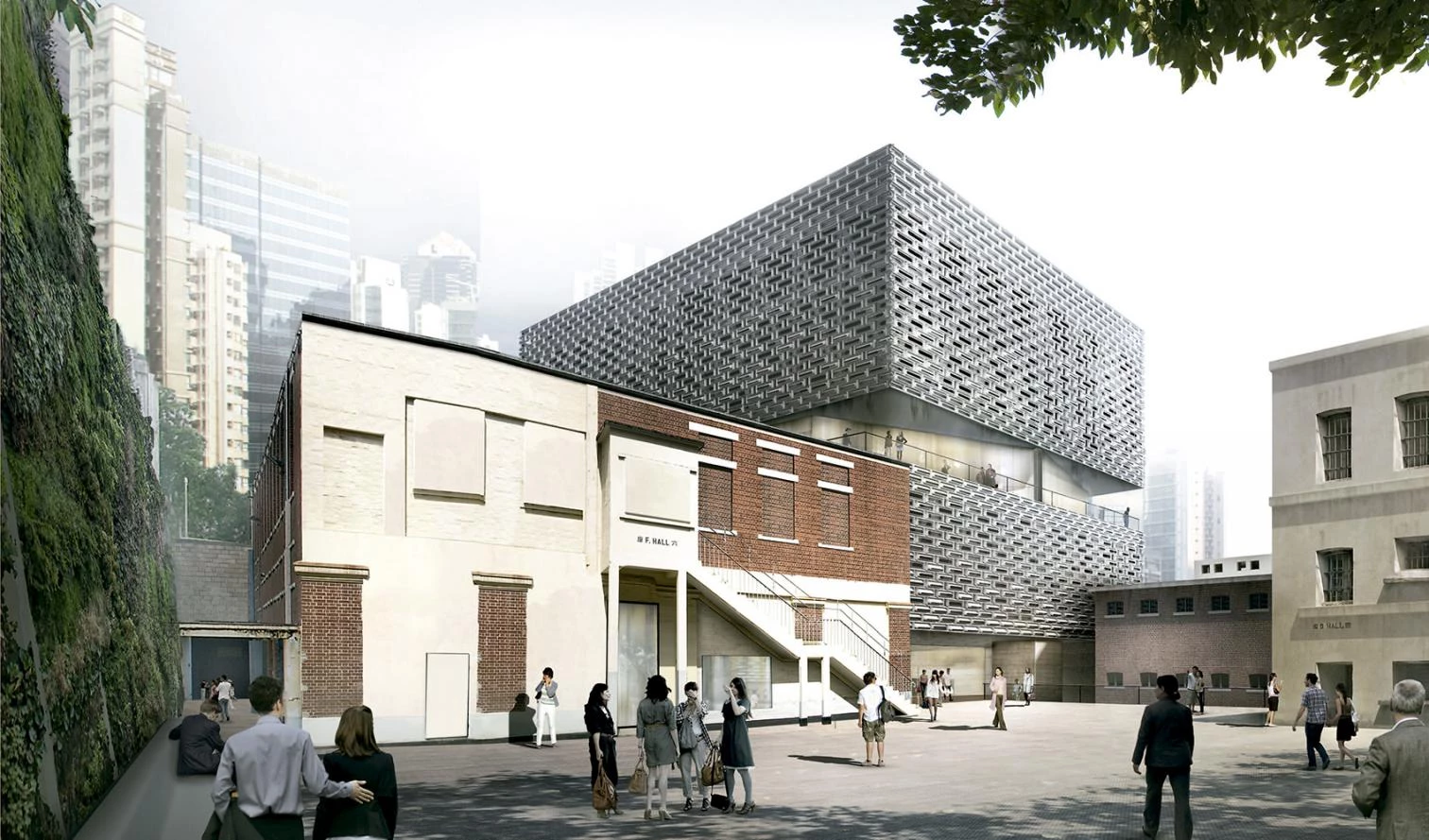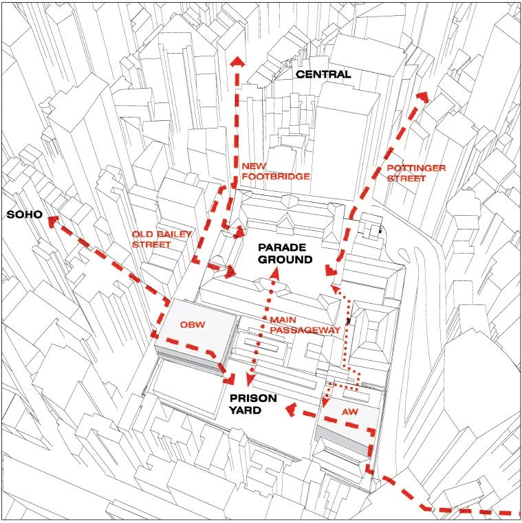 Localizado en medio del distrito central de Hong Kong —una de las zonas con mayor densidad del mundo—, este complejo edilicio de pequeña escala se erige actualmente como un claro entre un bosque de rascacielos. La rehabilitación del recinto se encauza hacia la preservación de esta cualidad, tomando los patios como centros vertebradores del nuevo programa público. El patio de armas, localizado al norte, es más amplio y accesible, resultando adecuado para eventos, comercio perimetral y restauración. Sin embargo, el antiguo patio de la prisión es un espacio hermético, y para su apertura al público el proyecto contempla su reactivación mediante la programación cultural. Ambos espacios, antes cerrados en una manzana tapiada a la ciudad, se articulan con la trama urbana a través de microactuaciones de conexión que crean nuevos flujos peatonales en el recinto y de esta forma lo enlazan con la ciudad.
