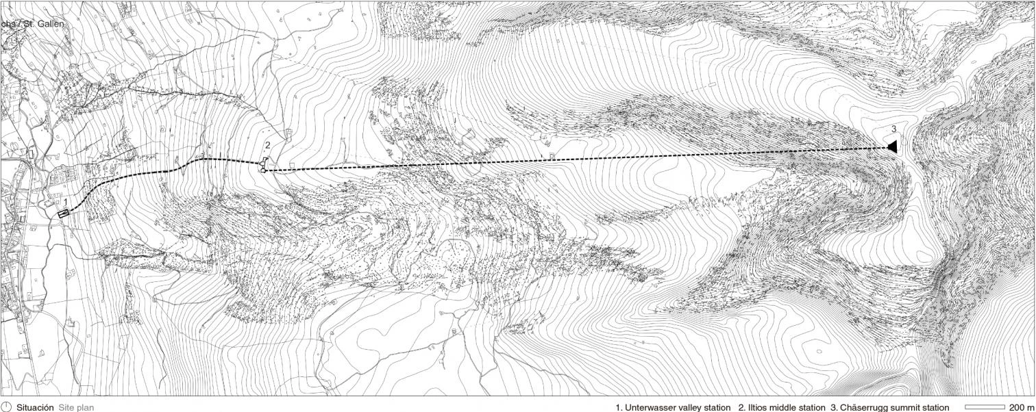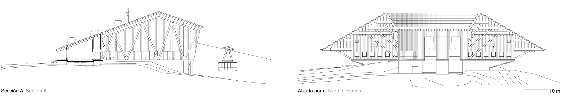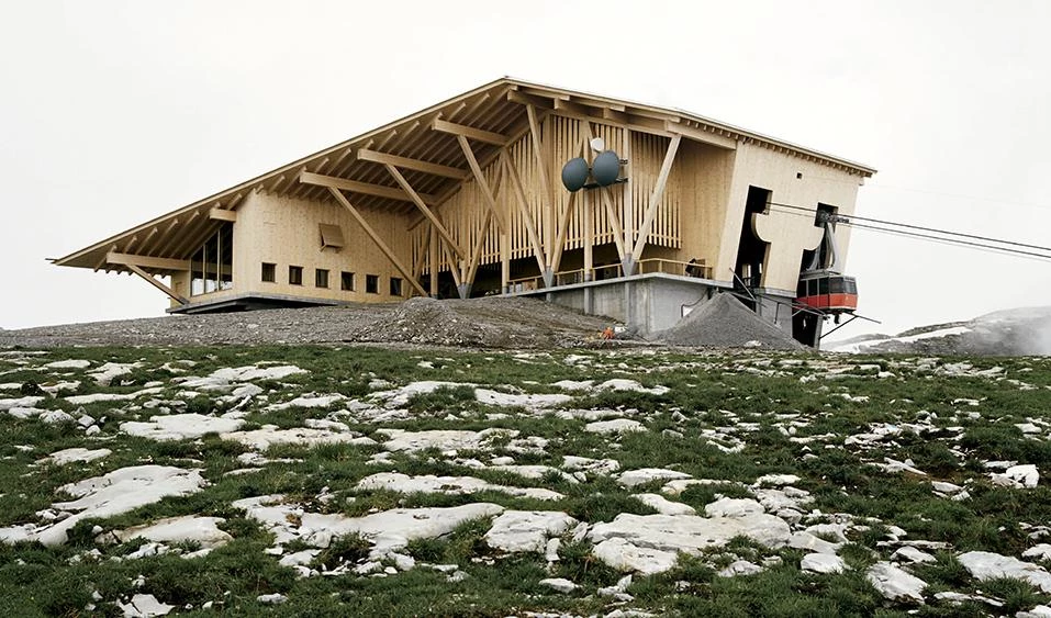 Desde que el teleférico se puso en funcionamiento, un restaurante situado al lado de la estación más alta ha sido tradicionalmente el punto de reunión de la zona. El restaurante se localizó de forma provisional en una casa realizada originalmente para los trabajadores implicados en su construcción, que ha sido ahora demolida para permitir la implantación de una construcción permanente. La estación —una pragmática estructura de metal sobre base de hormigón, típica de los años 1970— se ha mantenido, pero revestida con una nueva fachada. El nuevo restaurante está situado en perpendicular al volumen de la estación, extendiéndose horizontalmente para captar las vistas del sur. Una gran cubierta conecta las dos estructuras y crea una zona exterior de llegada. El edificio, realizado en madera maciza sobre cimentación de hormigón, refleja la tradición constructiva local; además, las piezas fueron prefabricadas por artesanos del valle y montadas in situ en el transcurso de un verano, mientras que el interior se completó durante el invierno siguiente. El uso responsable de recursos ha sido igual de determinante en el proyecto: excepto la grúa, que fue trasladada en helicóptero, todos los útiles y materiales requeridos fueron transportados en teleférico a lo largo de sus viajes habituales. De la misma forma, la tierra excavada se empleó en el hormigón y en el acabado de grava del terreno.